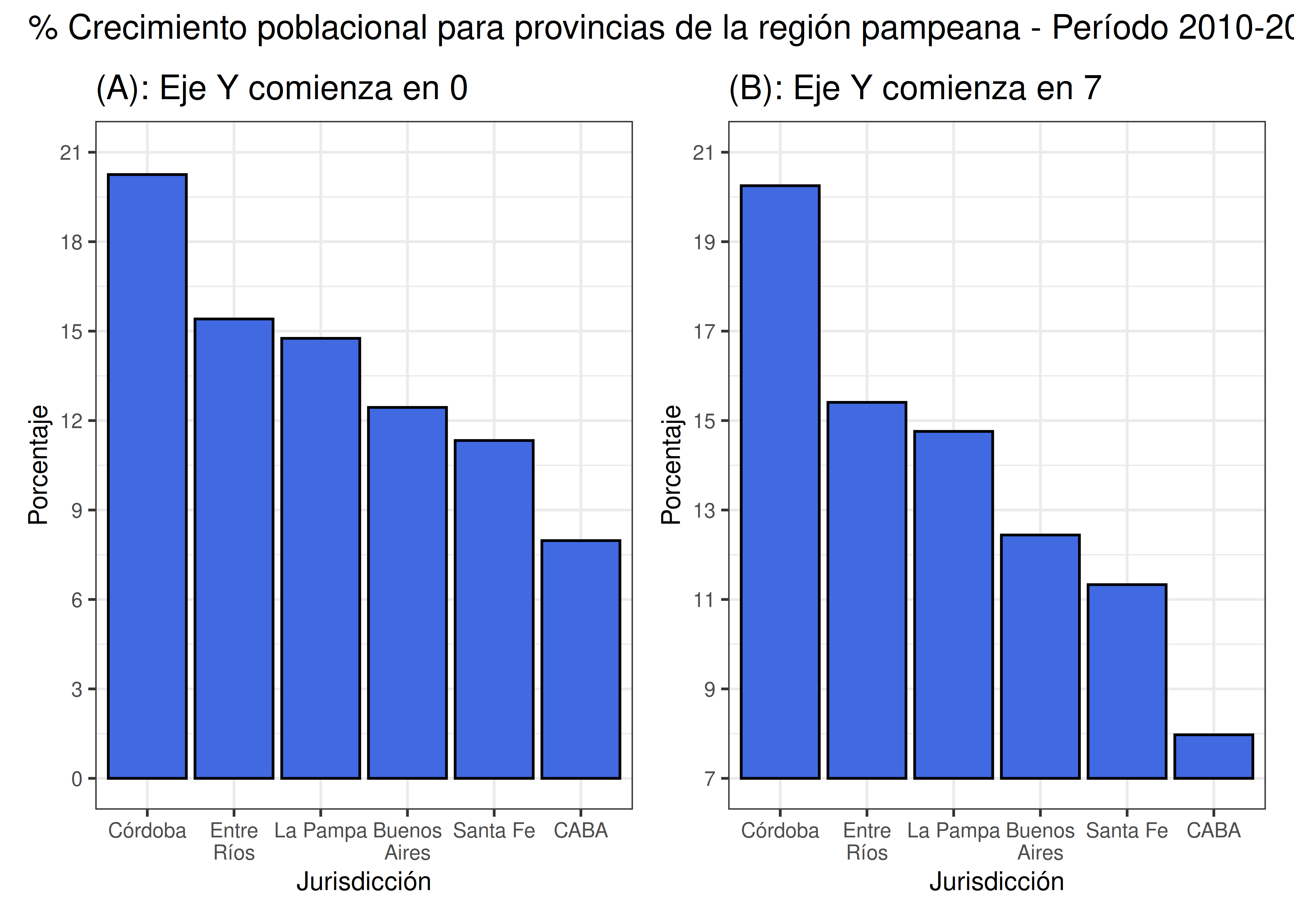 En el panel A del gráfico de arriba, vemos que la altura de la barra correspondiente a CABA (7.97%) es consistente con la altura de la barra correspondiente a Santa Fe (11.3%). La razón entre las alturas de ambas barras, \(7.97/11.3 = 0.7\), coincide con la razón entre los valores numéricos que representan.