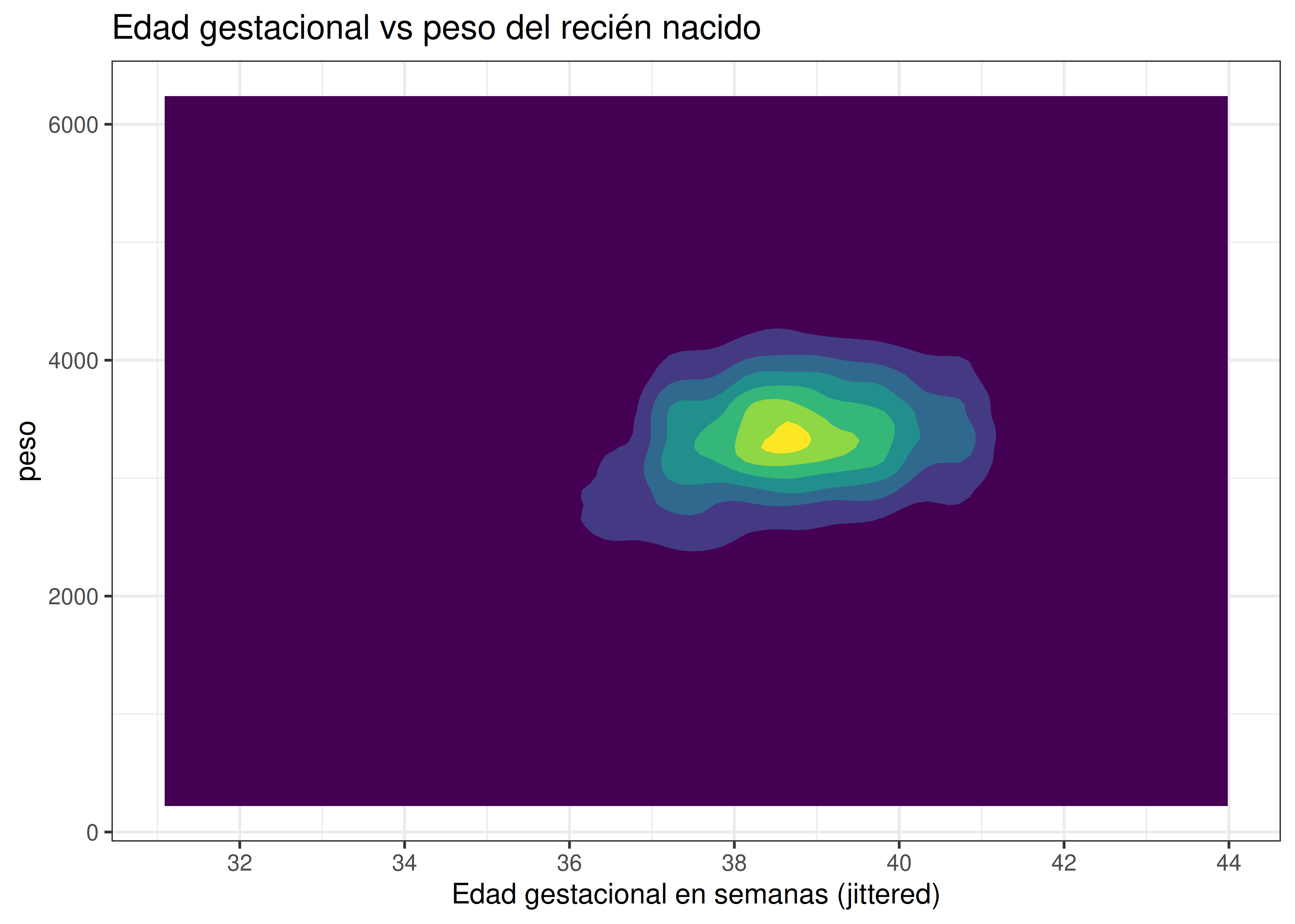 Veamos cómo resulta el gráfico de contornos para el ejemplo de semanas de gestación vs peso del bebé: