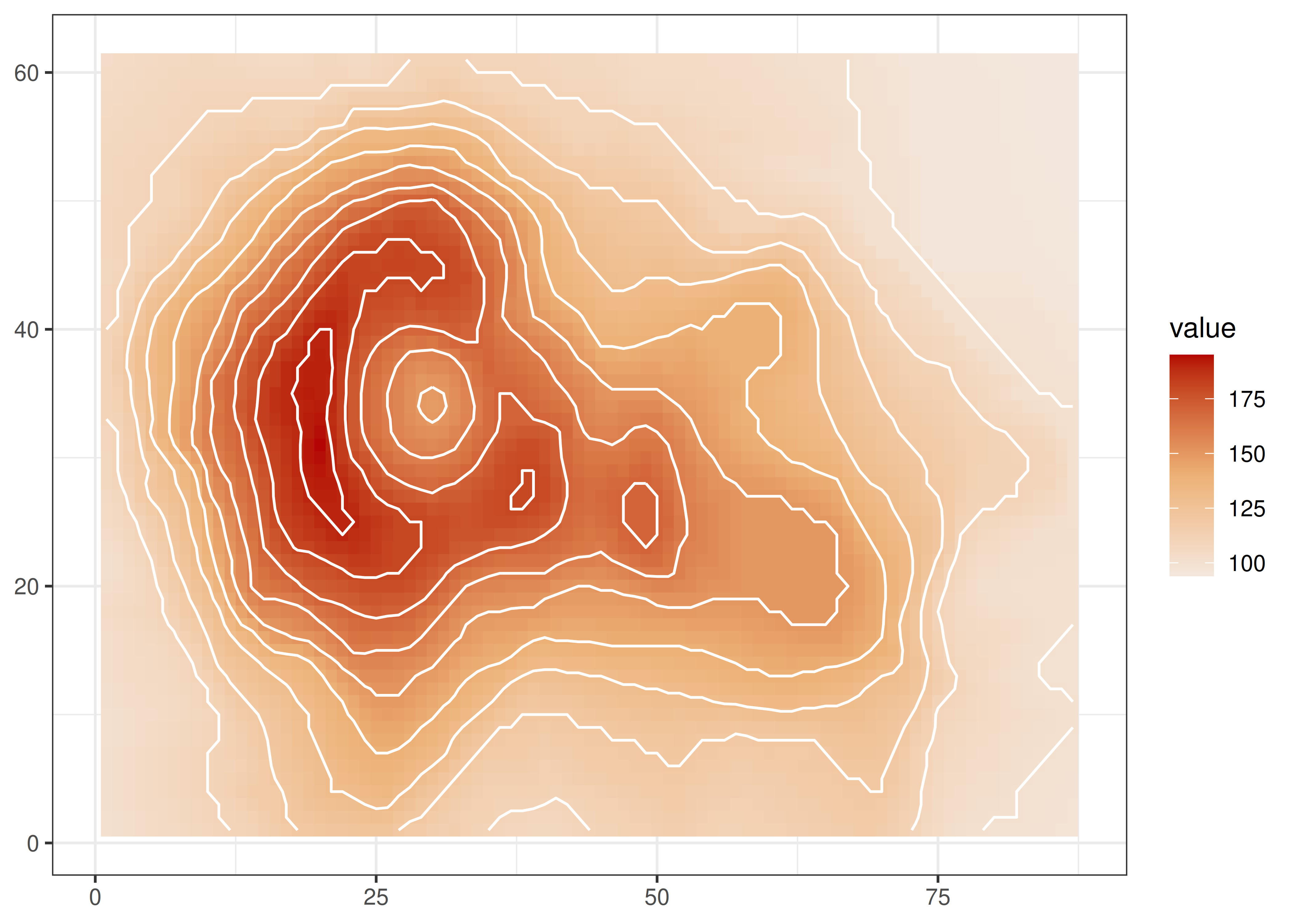 Una última alternativa consiste en crear gráficos de contornos, en los cuales se realiza una estimación de la función de densidad bivariada definida por las variables X e Y. Áreas del plano con igual nivel de densidad estimada se diferencian mediante líneas de contorno, las cuales pueden estar coloreadas usando una paleta secuencial.