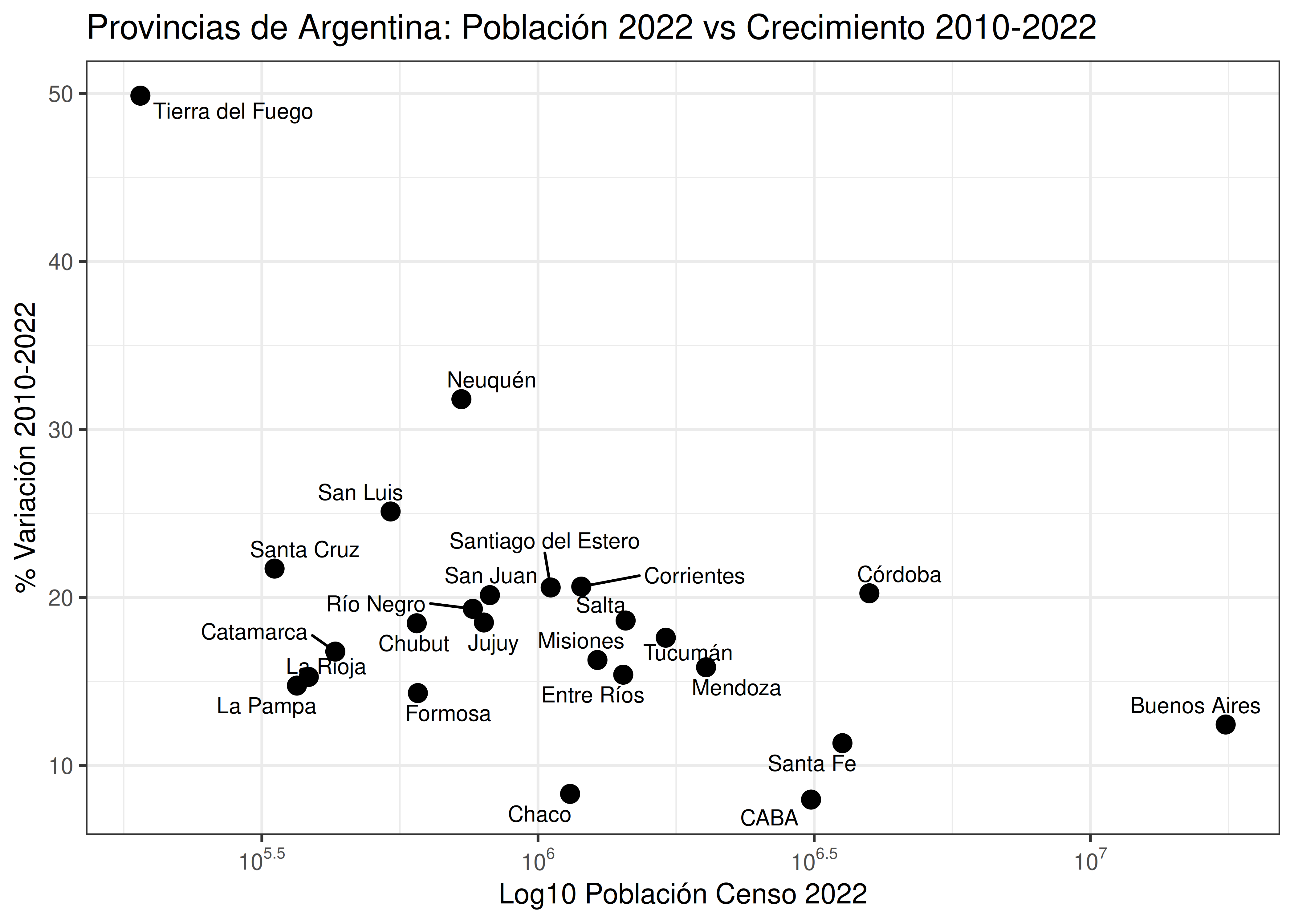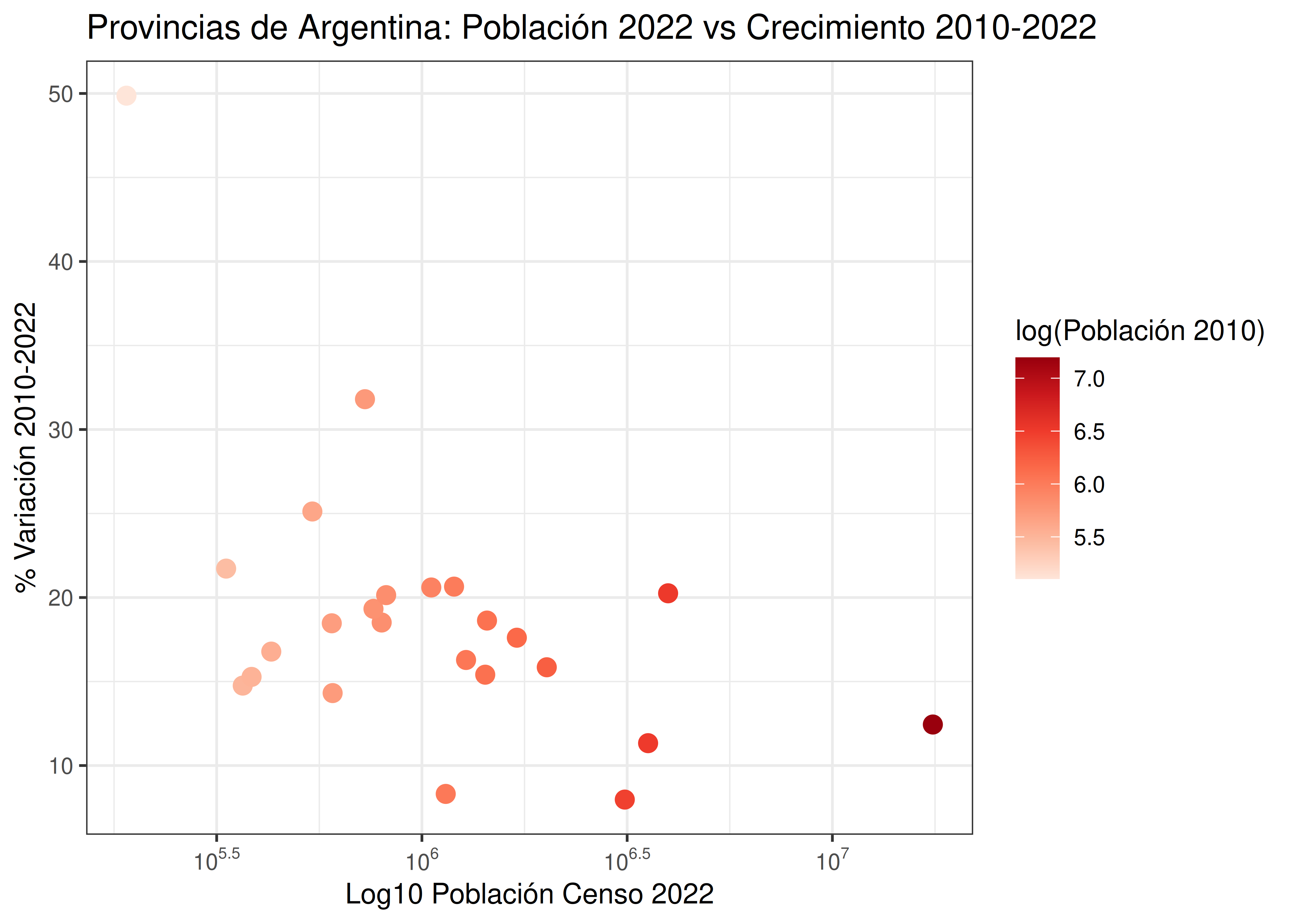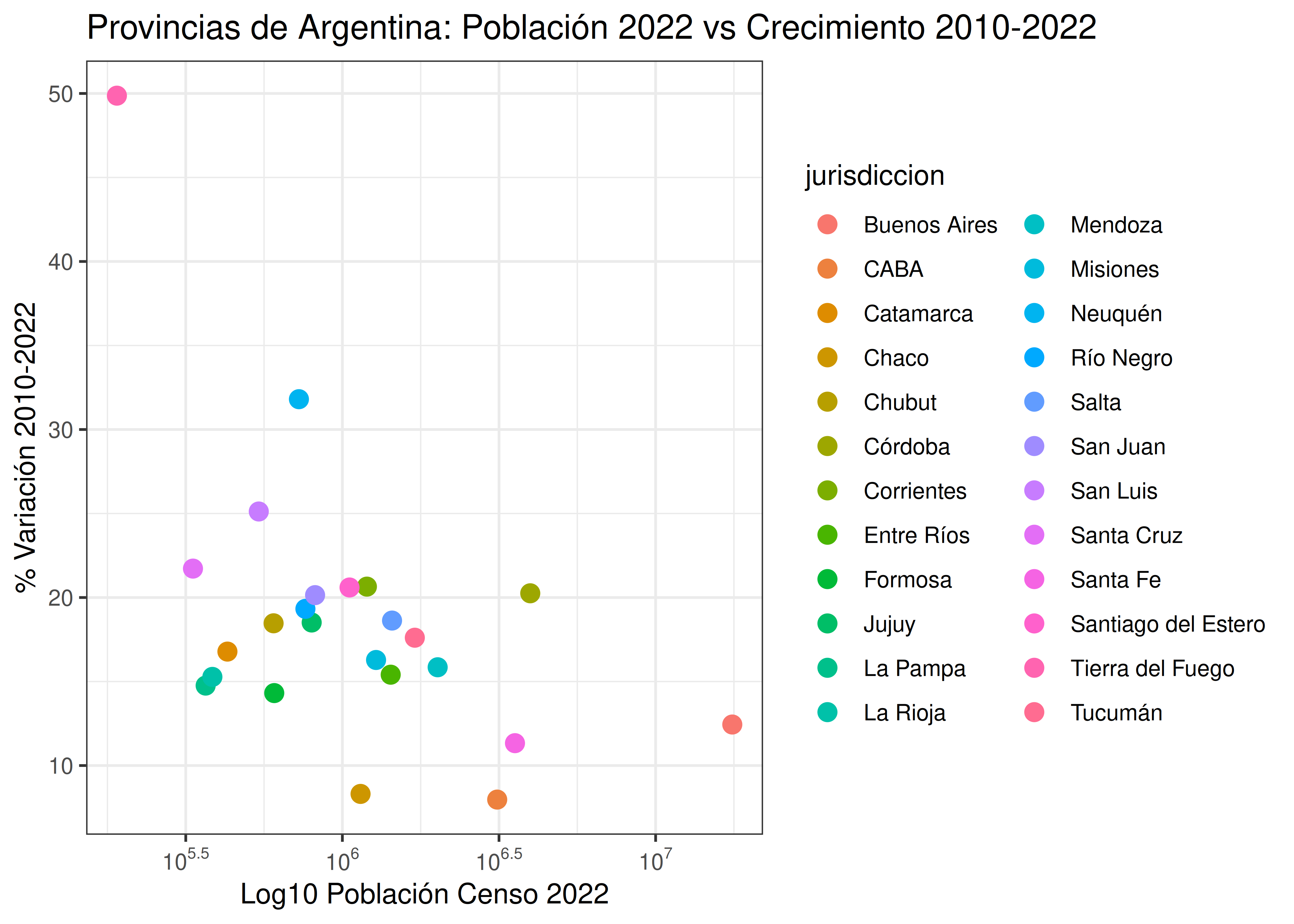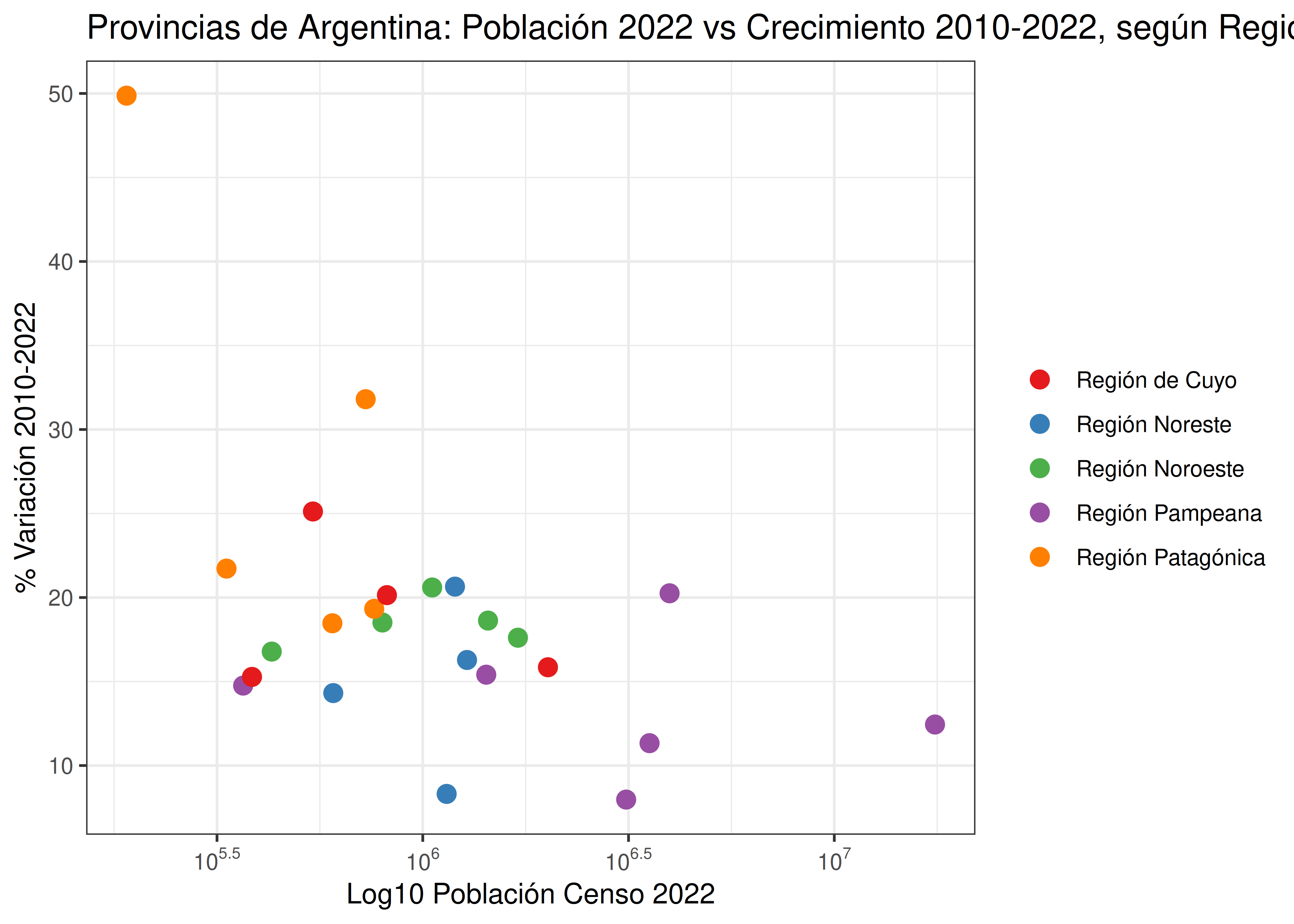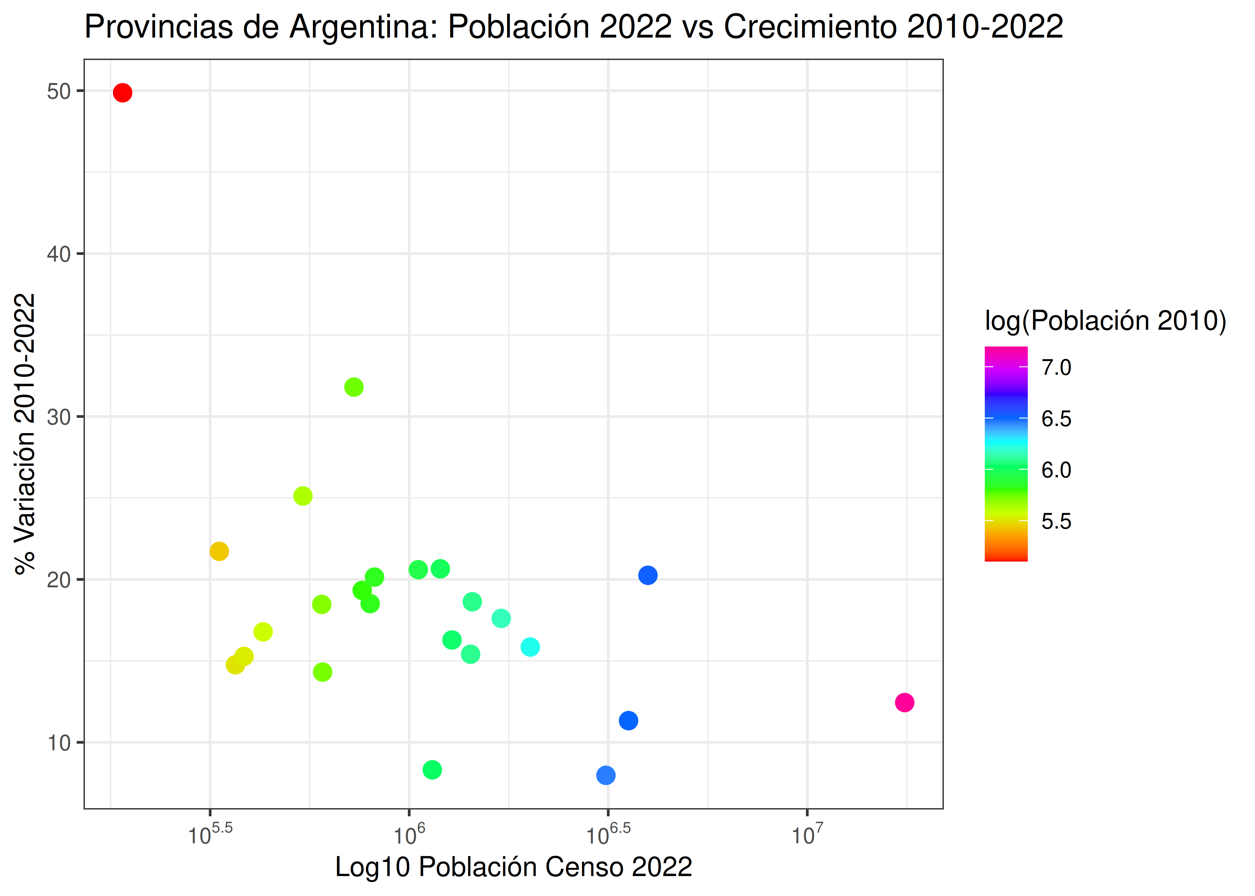 - En esta visualización, la paleta de colores no aporta información ni ayuda a entender mejor el mensaje transmitido; sólo se usa para darle un toque colorido al gráfico. Si bien esto no es un problema grave en sí mismo, podemos aprovechar el color de maneras más eficientes, por ejemplo para distinguir entre regiones geográficas (como vimos anteriormente) o bien usando una escala secuencial que refuerce la idea de diferencias numéricas entre provincias.