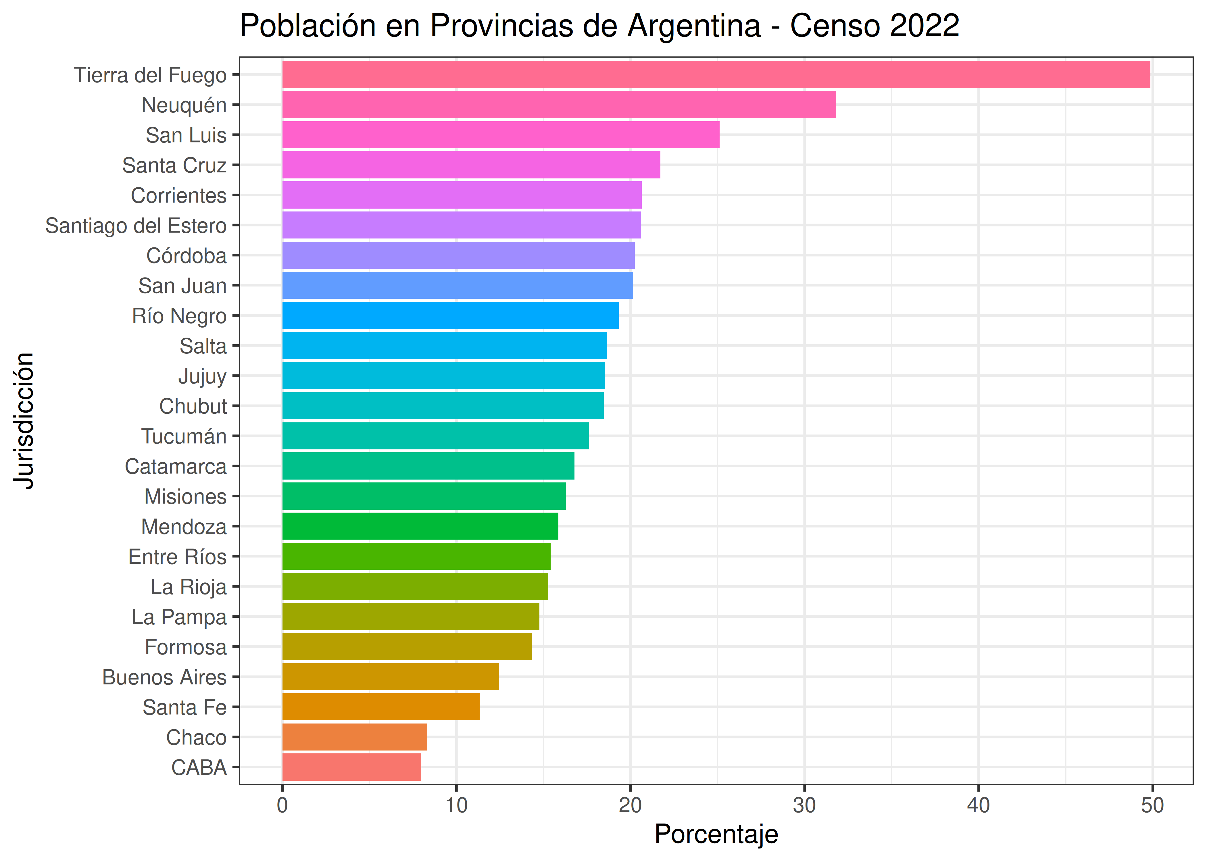 Un error común consiste en usar demasiados colores, como en el gráfico que se muestra a continuación. Dado que cada observación (en este caso, provincias argentinas) posee su propia tonalidad, la cantidad total de colores es muy elevada.