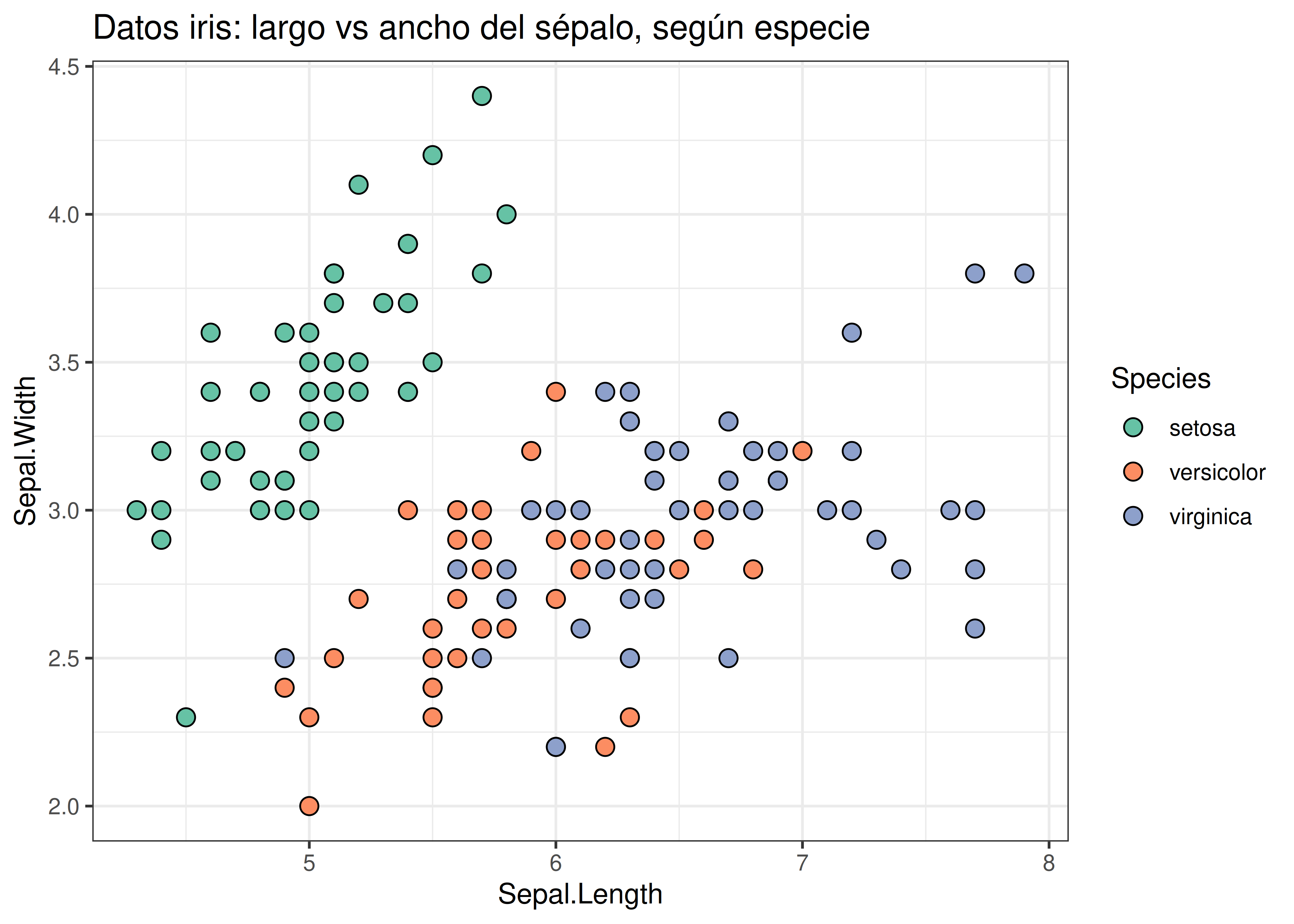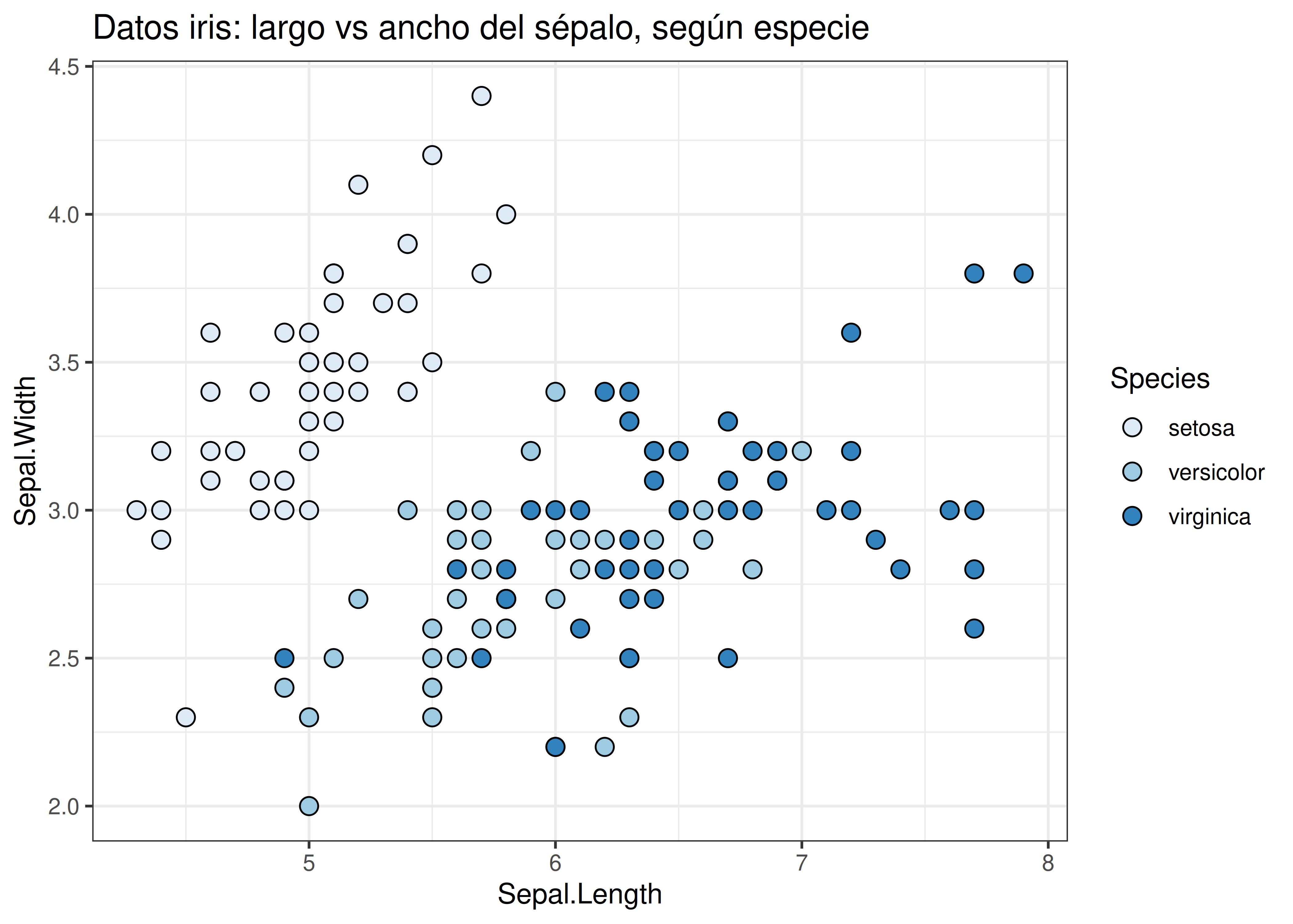 - En este caso, no sólo hay dificultades porque las tonalidades son similares entre sí, sino que también tenemos una superposición de puntos entre las especies versicolor y virginica. Asignar tonalidades que se distingan unas de otras ayuda a separar visualmente ambas categorías: