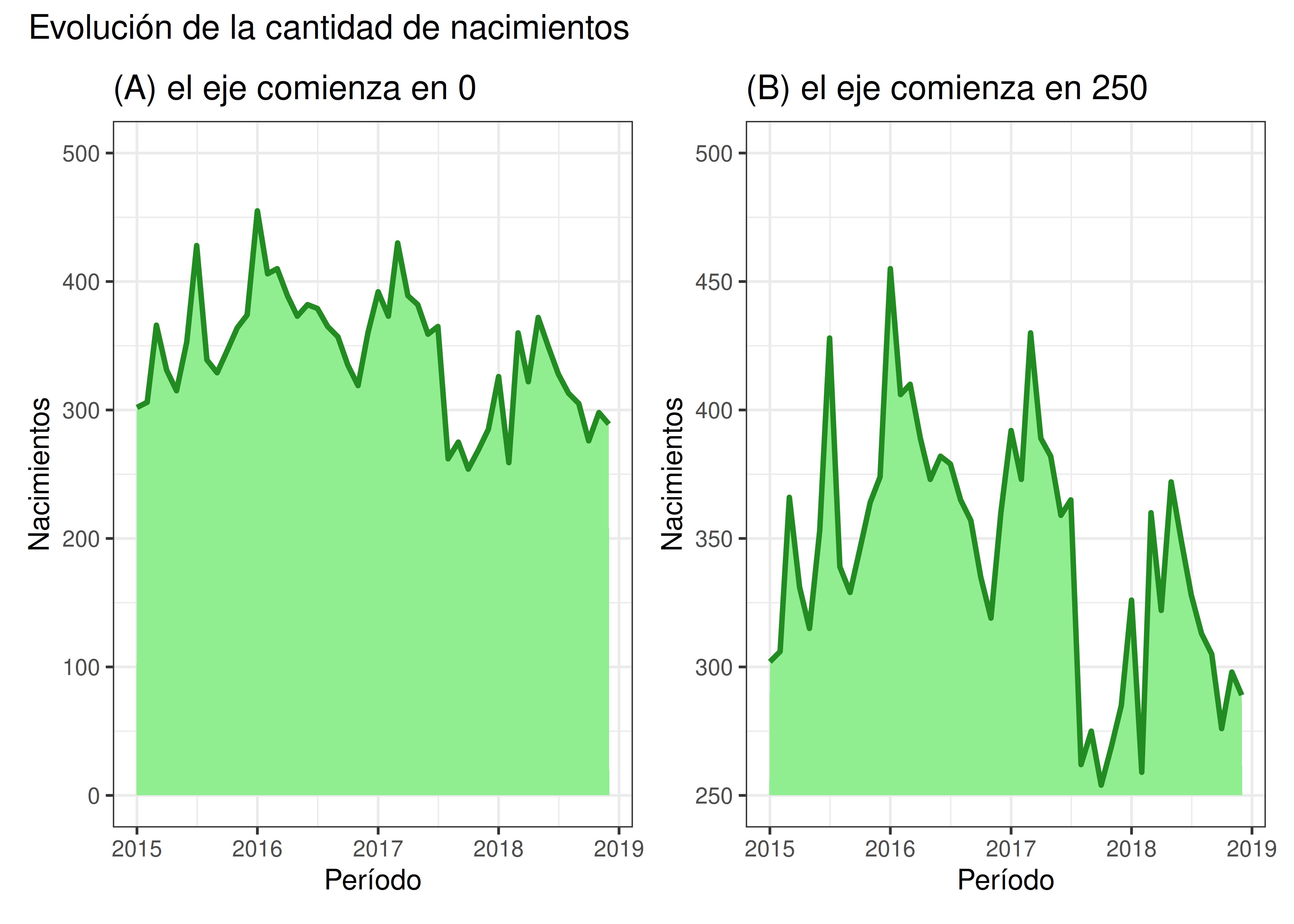 - Una vez más, vemos que los cambios entre períodos adyacentes se exageran cuando recortamos la escala del eje Y. Si bien hubo una baja pronunciada de nacimientos entre julio y agosto de 2017 (bajaron de 365 a 262, más del 28%), esta diferencia se percibe mucho mayor en el gráfico B que en el gráfico A.