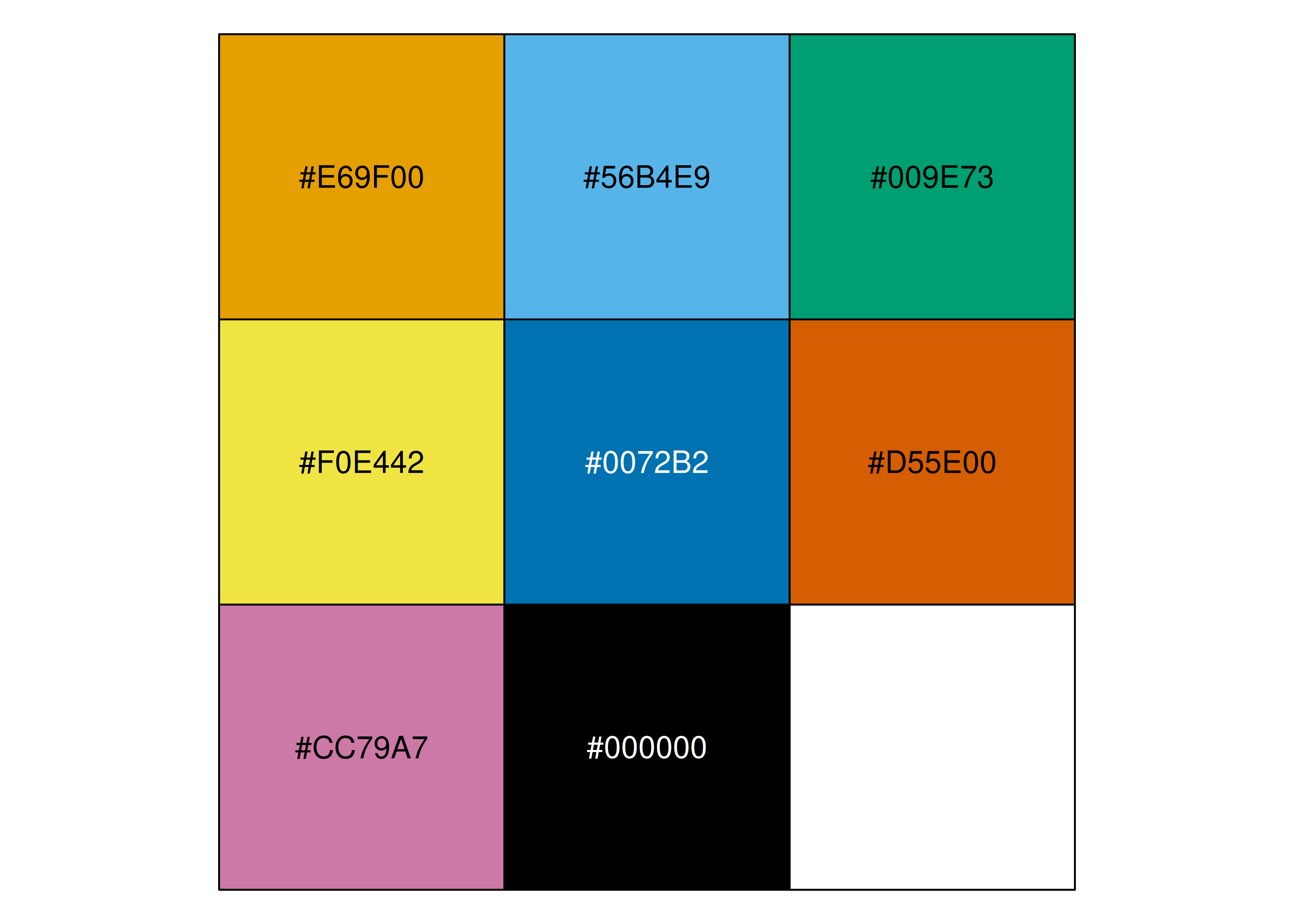 Teniendo en cuenta esto, hay paletas creadas específicamente para que personas con daltonismo puedan distinguir fácilmente los colores empleados. Un ejemplo es la paleta de Okabe-Ito: