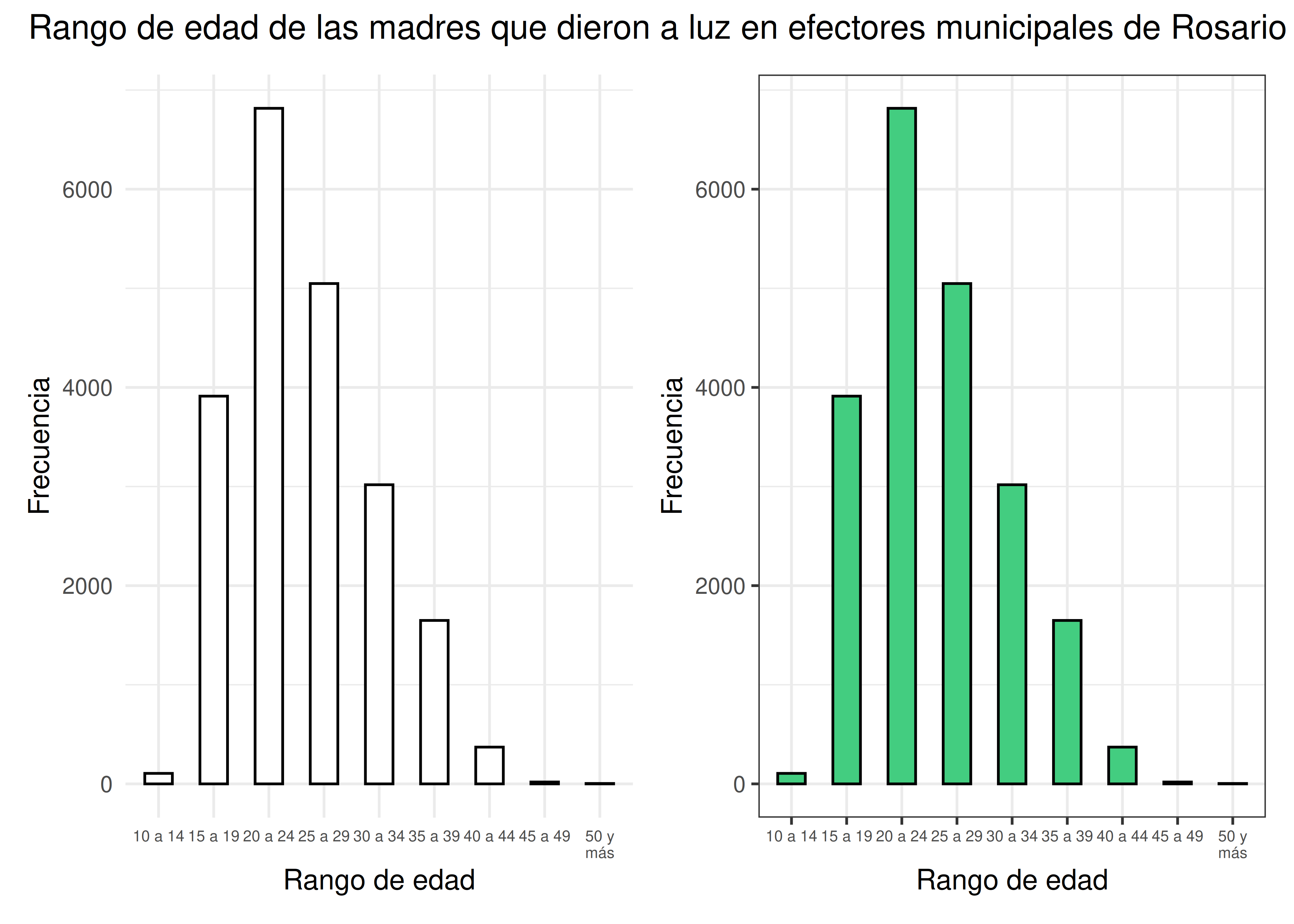 También es importante que la ubicación de los gráficos en la grilla conserve un orden lógico. En el primer caso analizado, los años se suceden en orden ascendente de izquierda a derecha y de arriba hacia abajo. Si bien existen otras maneras de ordenarlos, estamos acostumbrados a que el panel de arriba a la izquierda sea el primero y el de abajo a la derecha, el último en nuestra recorrida visual. Lo mismo aplica para variables categóricas ordinales, como en el caso de la variable edad_gestacional del dataset de partos.