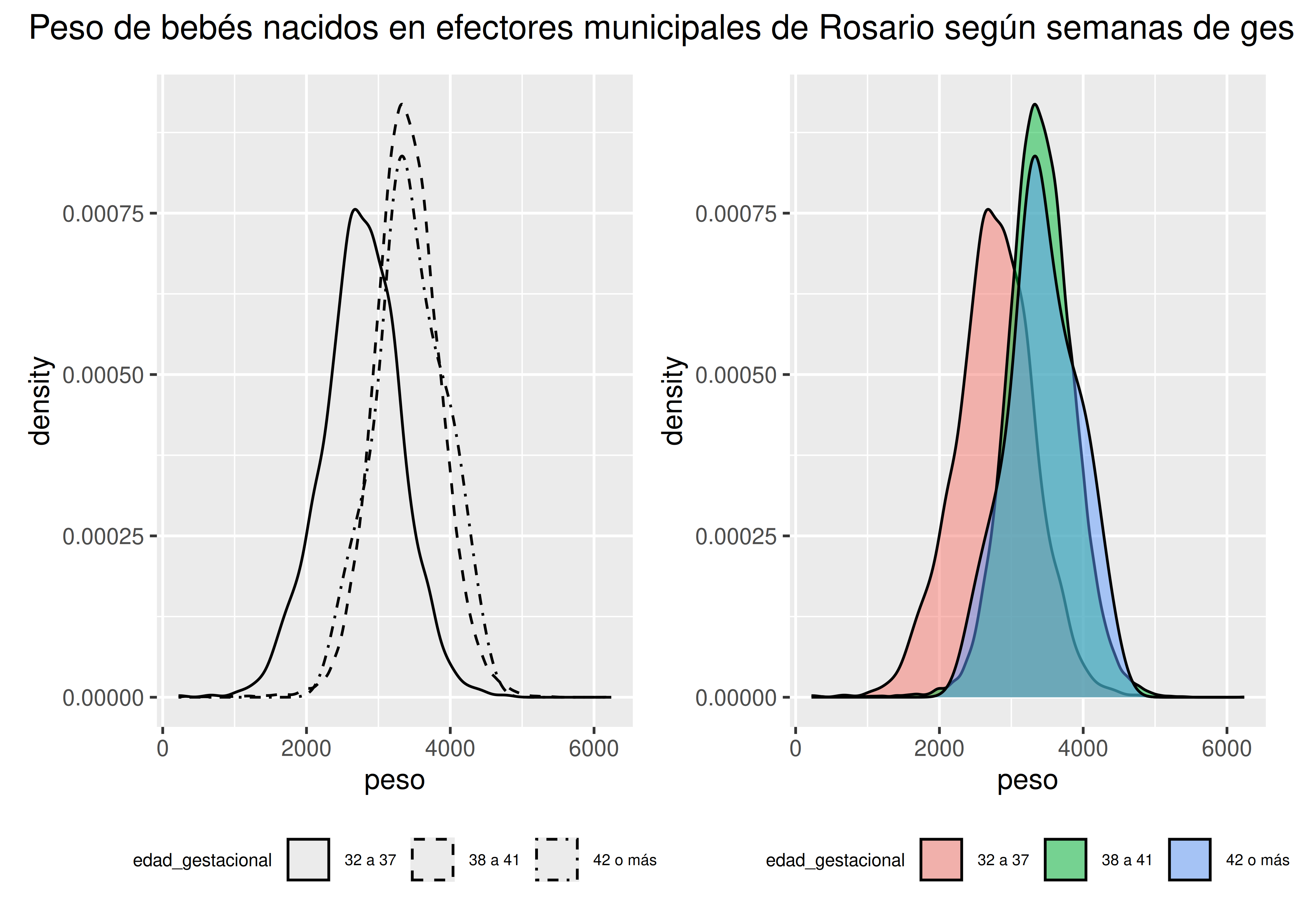 - Densidades: la superposición de las curvas y la necesidad de diferenciar grupos hacen necesaria la presencia de colores. Si tenemos que limitarnos al blanco y negro, debemos recurrir a estéticas no muy efectivas (como tipo de línea) para identificar a cada grupo. Algo similar ocurre con los gráficos de dispersión: si no podemos asociar categorías con colores, deberemos conformarnos con usar diferentes formas para cada una.