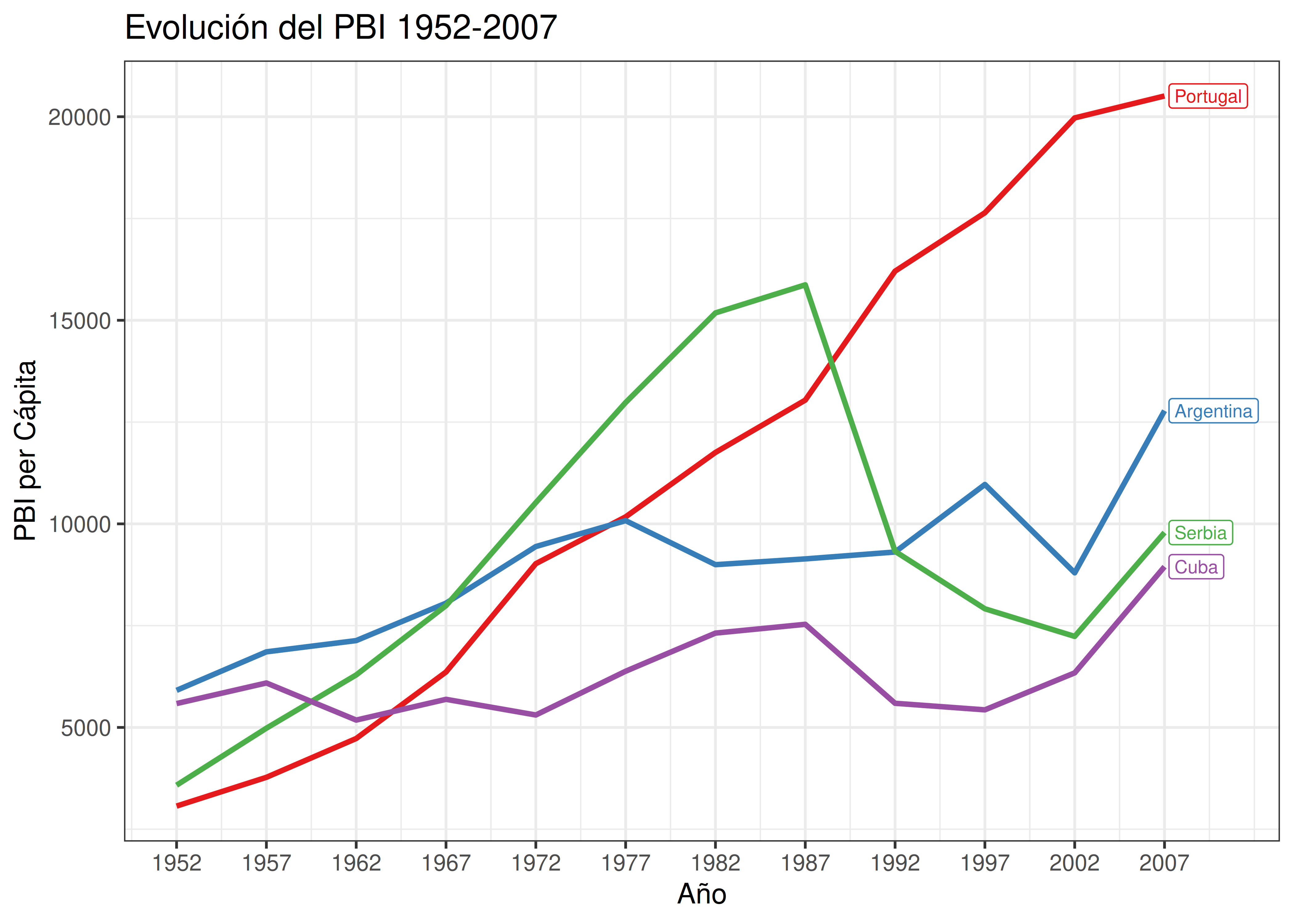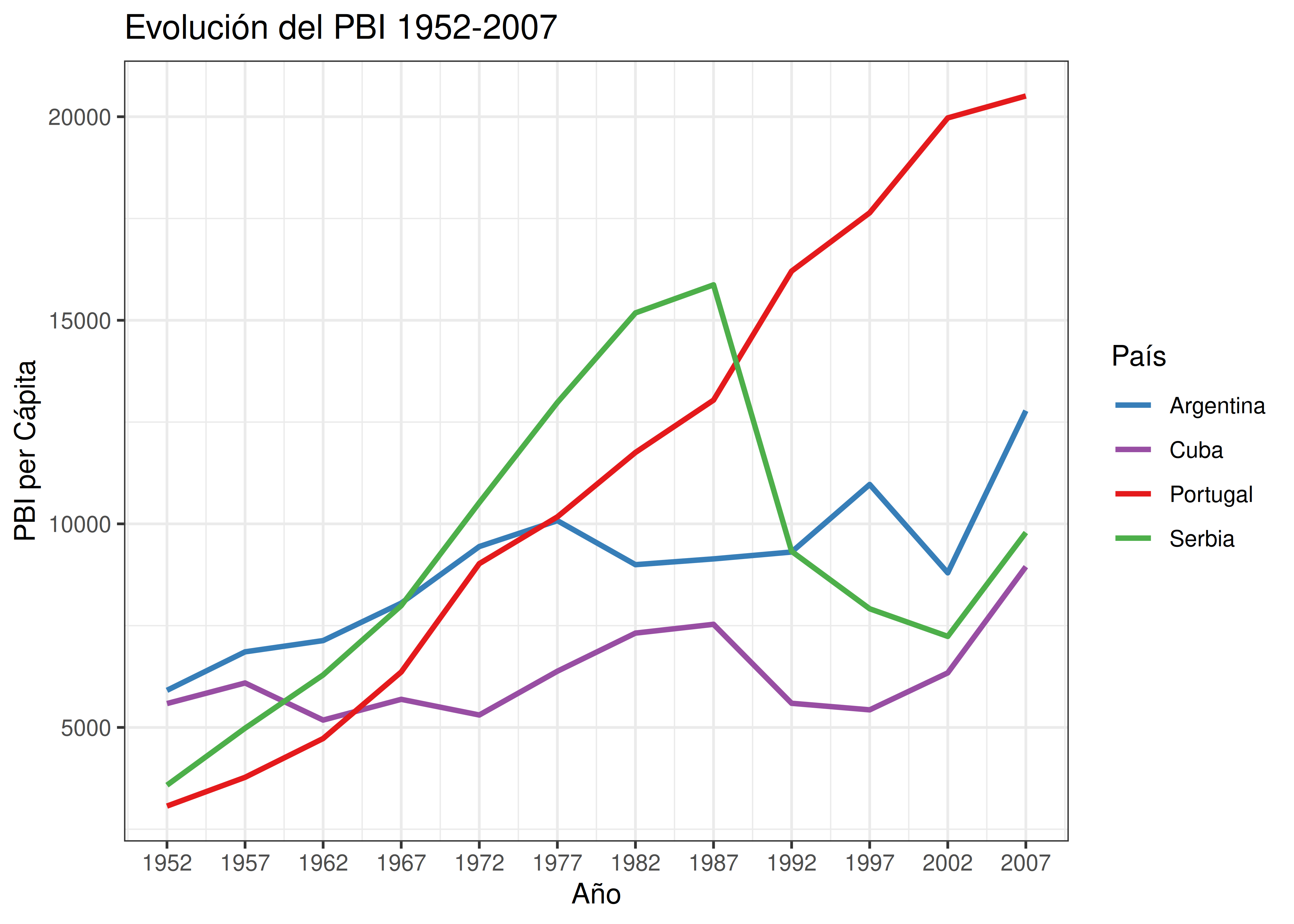 A continuación vemos un gráfico que muestra la evolución del PBI en 4 países diferentes. Los datos fueron extraídos del paquete
