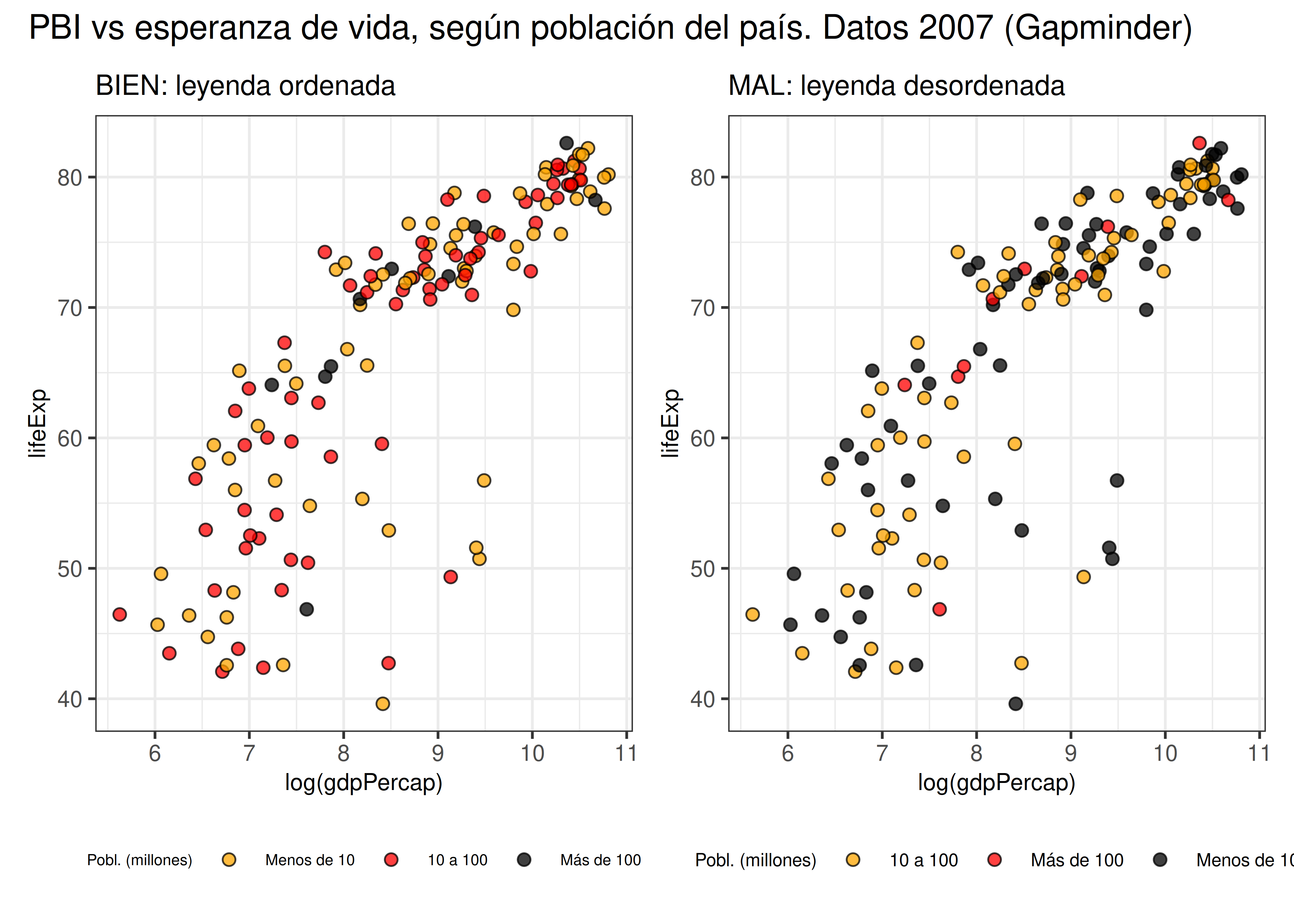 En casos donde hay un orden distinguible entre los valores representados, y la variable categórica asociada es nominal (sin orden intrínseco), se recomienda reordenar los niveles de la leyenda de manera que coincidan con el orden numérico. De esta manera, la relación que nuestro cerebro aplica para asociar colores con categorías es mucho más inmediata y natural: