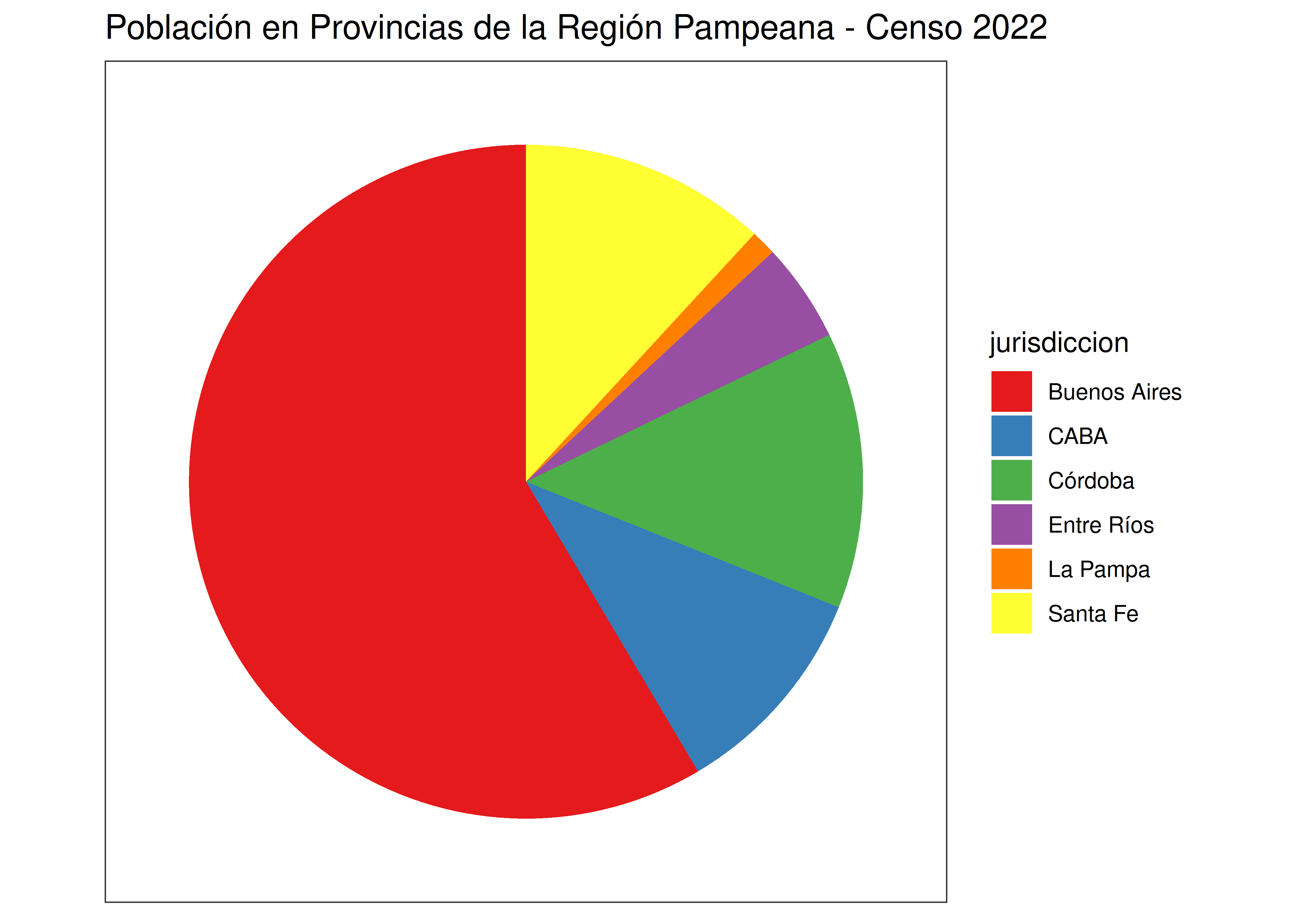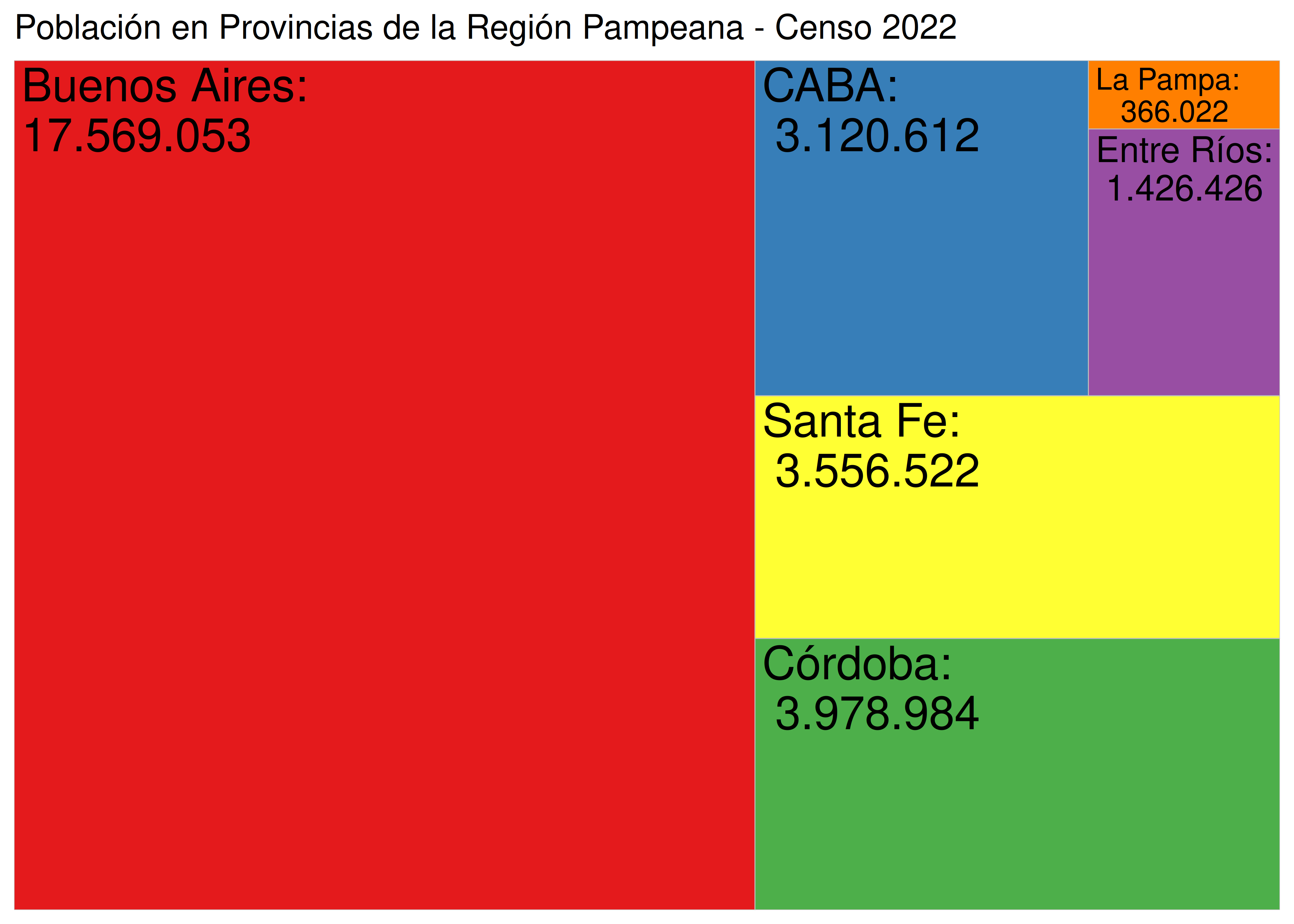 Por ejemplo, teniendo en cuenta que el 58% de la población que vive en la región pampeana lo hace en la provincia de Buenos Aires, sabemos que el 58% del área del círculo corresponde a Buenos Aires (ángulo de \(0.58\times360º = 211º\)) y también que el rectángulo rojo ocupa un 58% del área total del gráfico treemap.