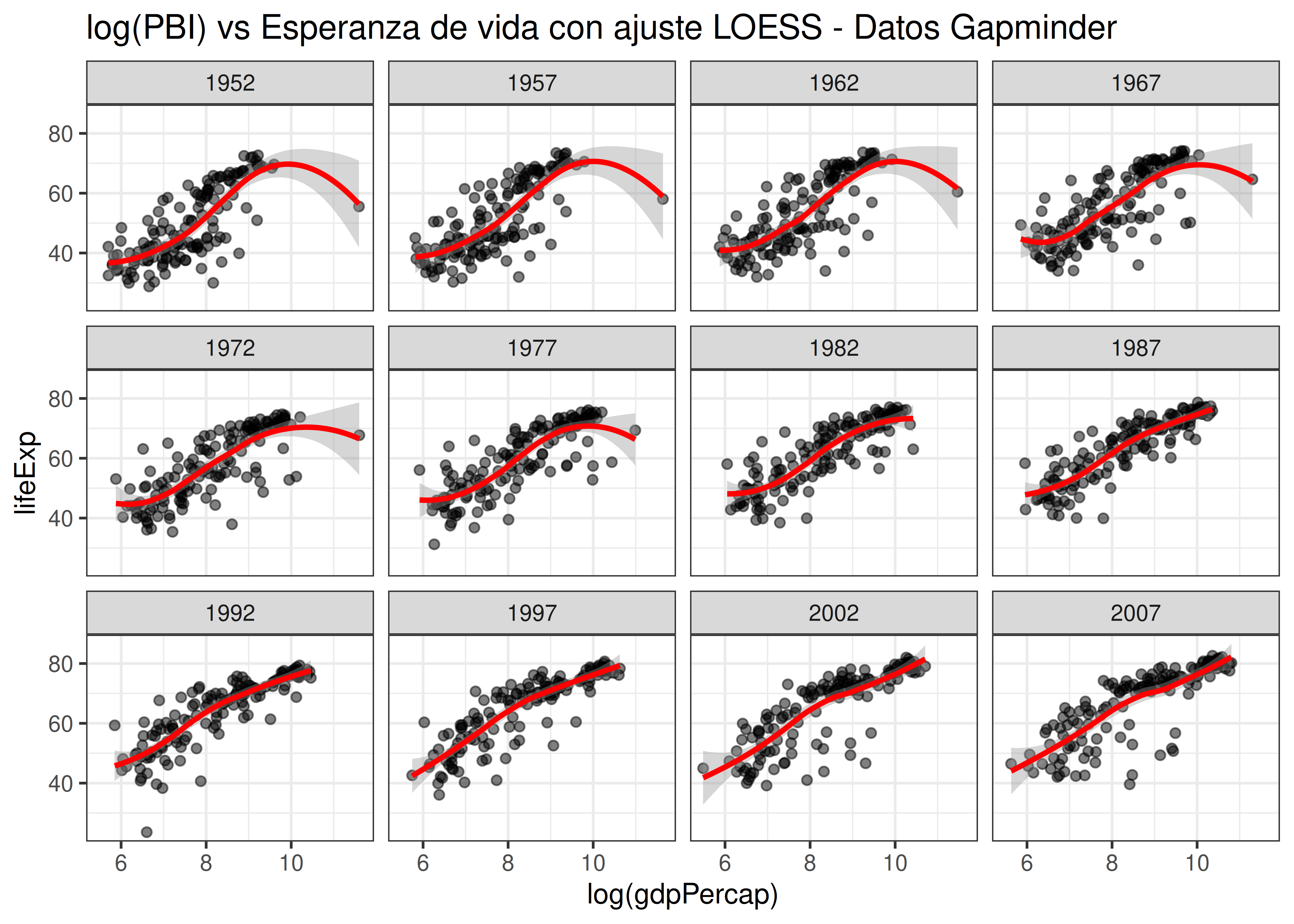 Veamos un ejemplo donde creamos diagramas de dispersión para las variables PBI per cápita y esperanza de vida de varios países, con un ajuste LOESS para cada año por separado. Este tipo de gráfico sería prácticamente imposible de armar en una figura que no use paneles (también llamados trellis plots o faceting en la literatura):