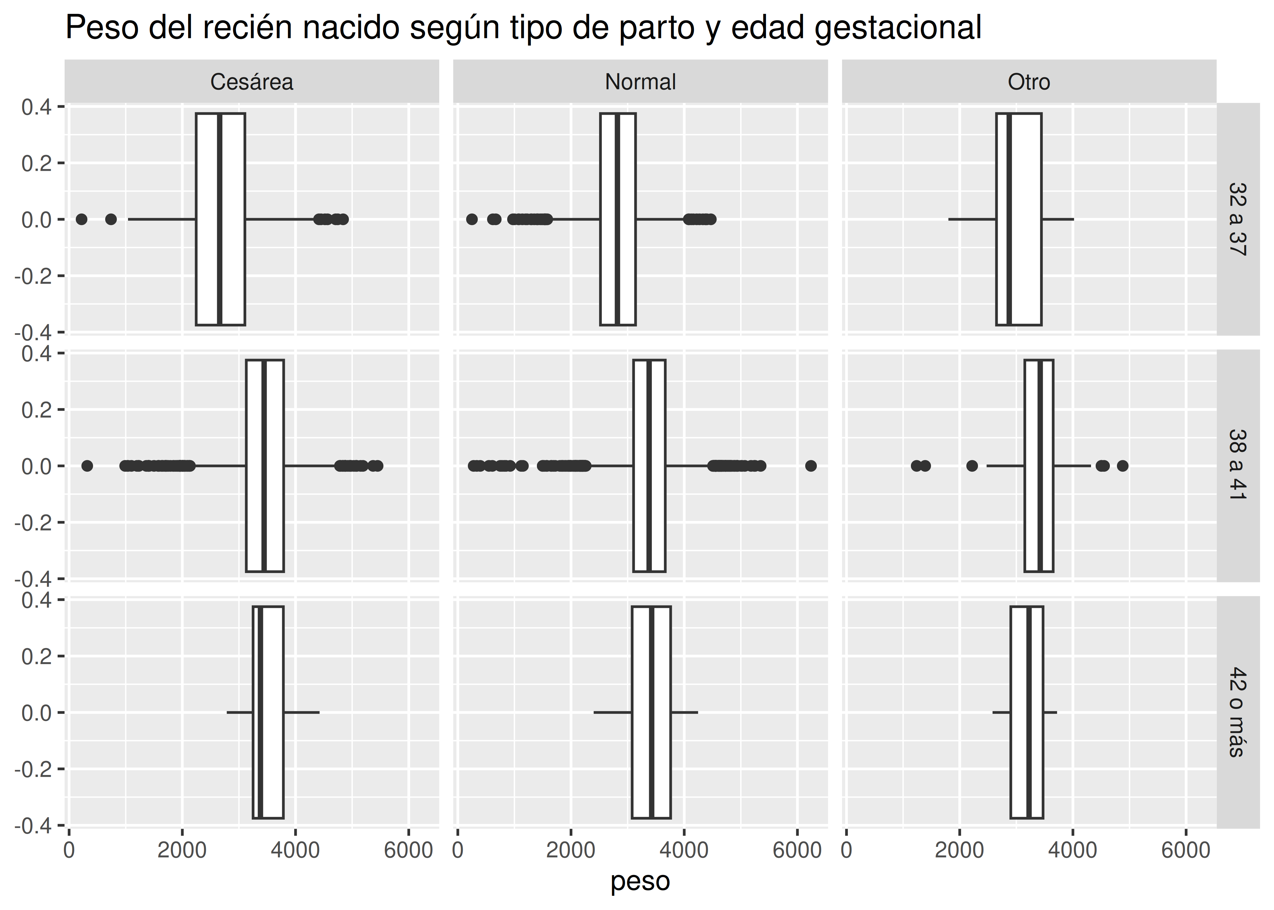 - Ejemplos comunes de faceting también se dan con histogramas, curvas de densidad, boxplots, gráficos de barra, etc. A continuación vemos boxplots de peso del recién nacido para subgrupos de la población conformados por el cruce entre 2 variables: tipo de parto (columnas) y semanas de gestación (filas):