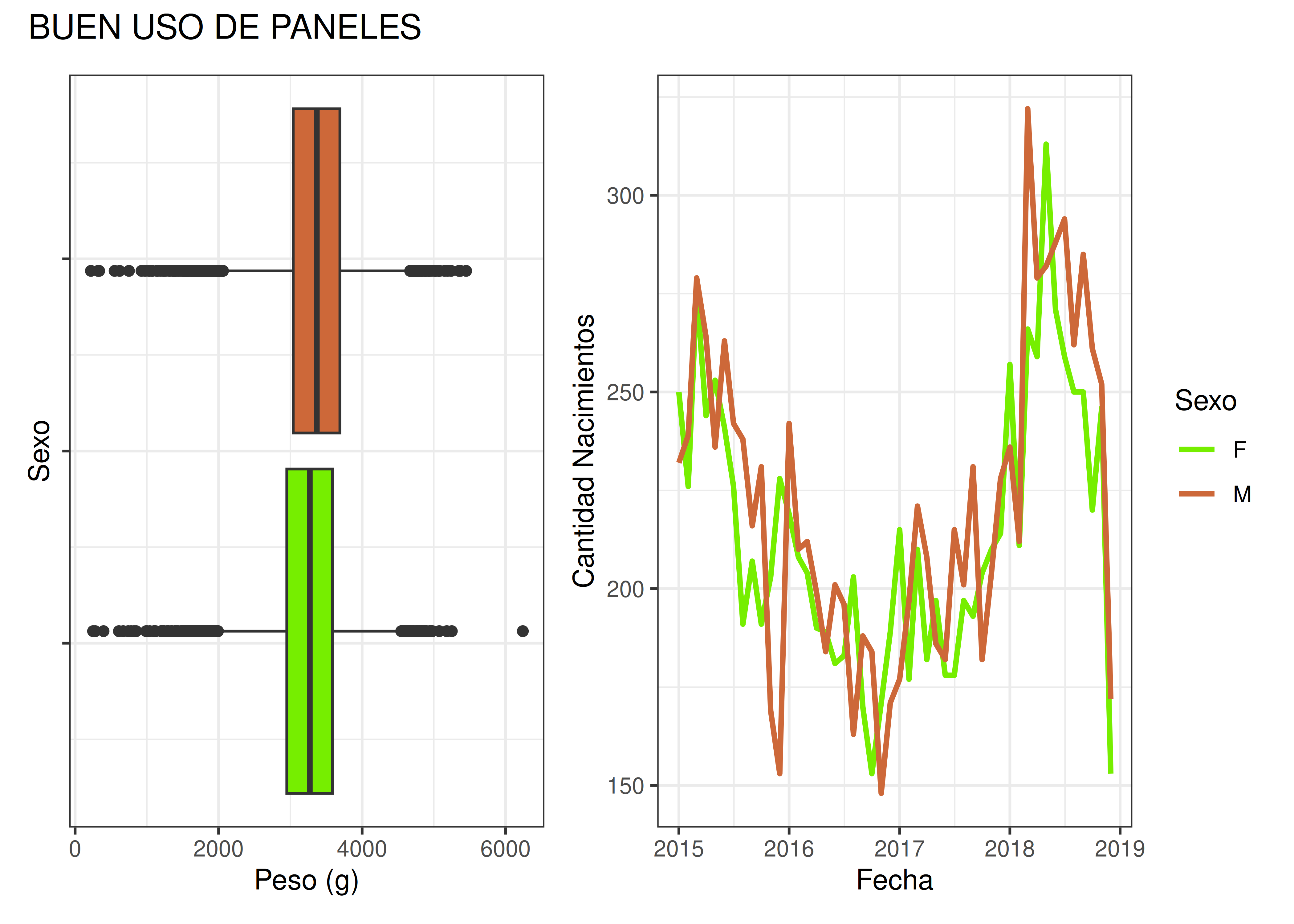 Para evitar este inconveniente podemos usar paneles que repliquen los gráficos construidos en distintos subgrupos de la población, o bien que estructuren de forma ordenada los análisis exploratorios llevados a cabo sobre cada variable.