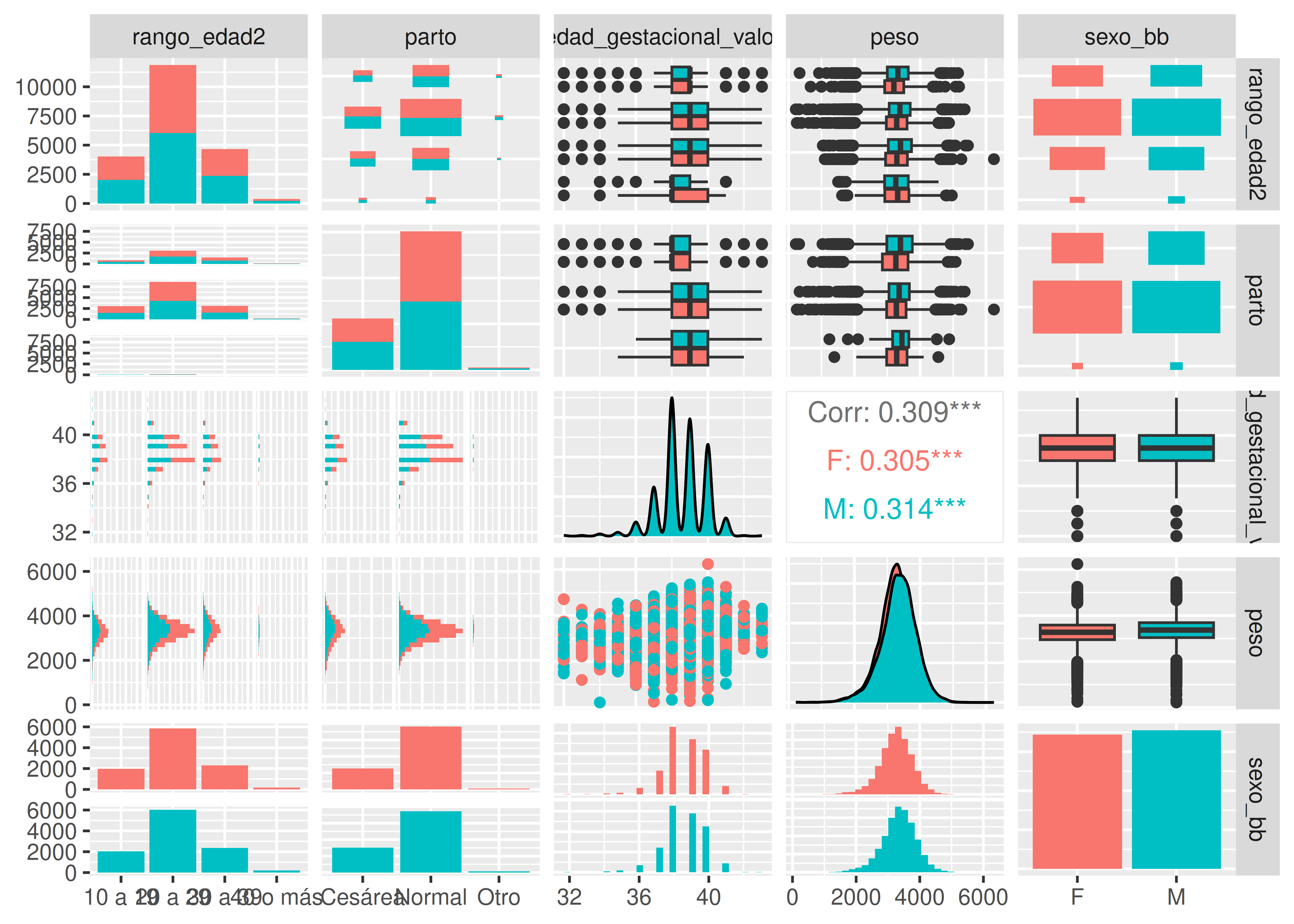 Ejemplo: boxplots para peso del recién nacido y evolución temporal de la cantidad de partos, según sexo del bebé: