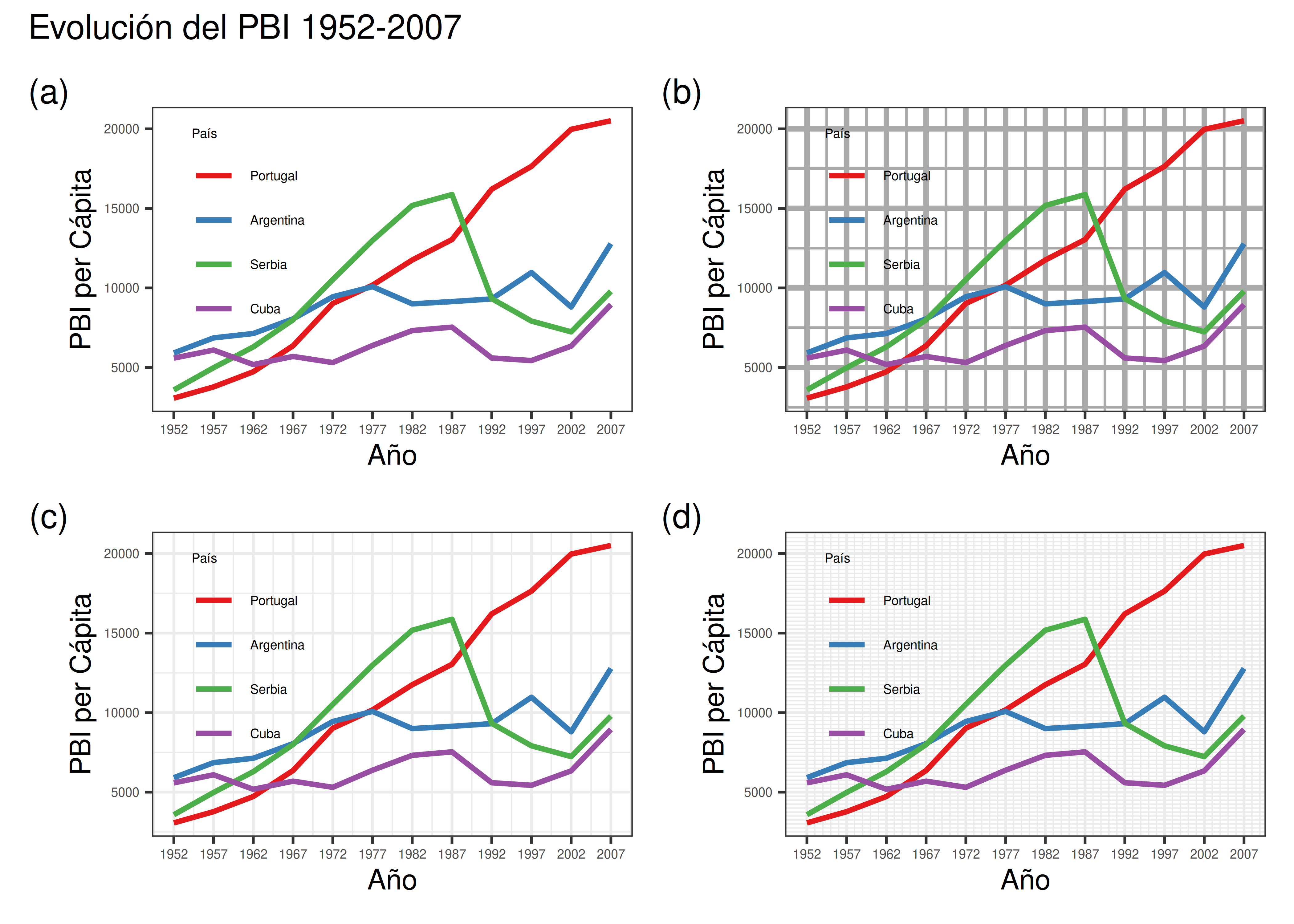 Panel (d): si bien los colores de la grilla son válidos, el problema en este caso es la cantidad innecesaria de líneas utilizadas. Usar una grilla demasiado densa también distrae y puede llegar a ocultar el mensaje principal del gráfico.