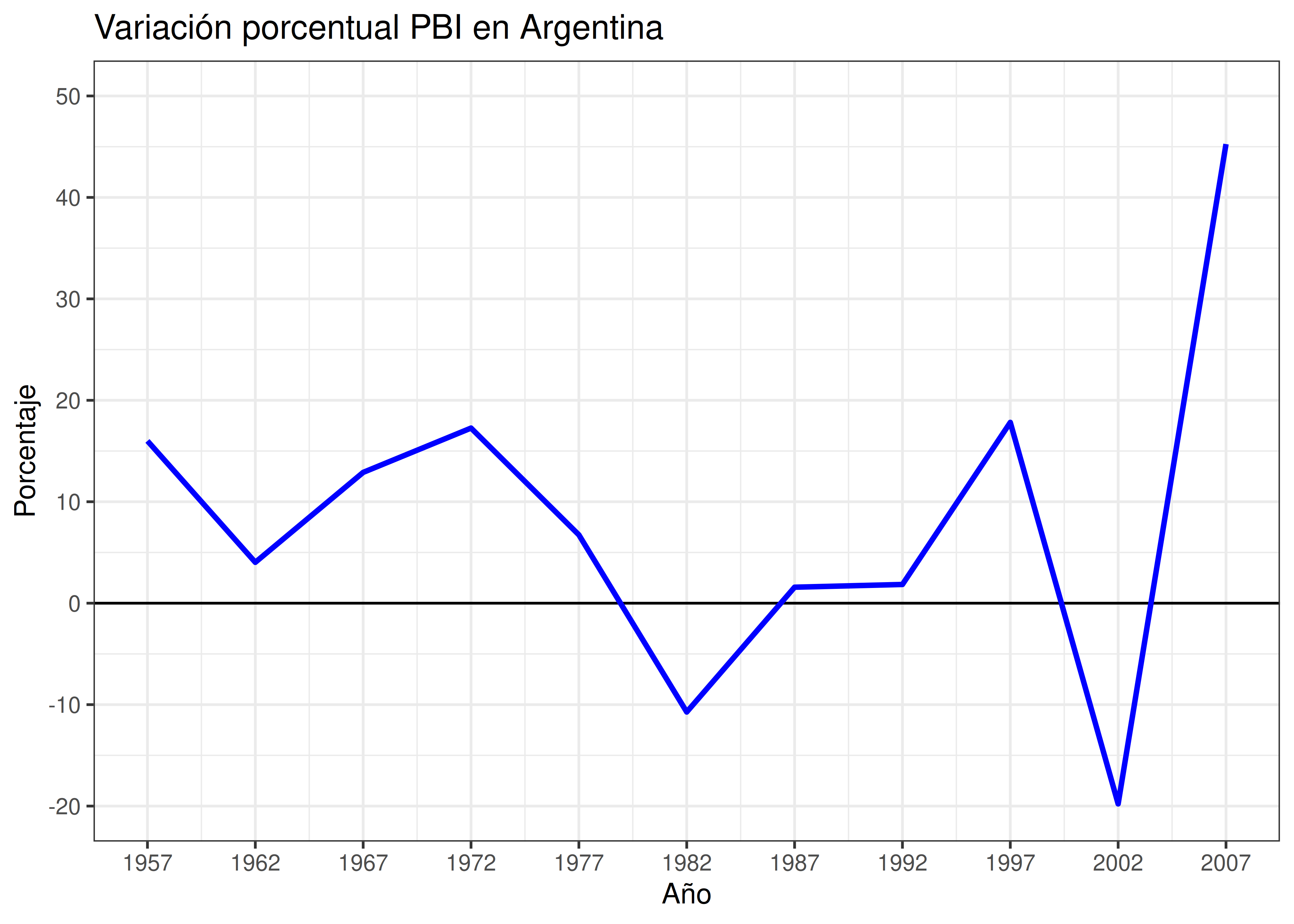 Por ejemplo, veamos el cambio porcentual en el PBI de Argentina para el período 1957-2007. Es natural tratar de ver si entre una medición y la siguiente, el PBI subió (variación mayor a 0) o bajó (menor a 0). Además de trazar la grilla original, se dibuja una línea recta horizontal que corta el eje Y a la altura del 0, reforzando su ubicación y permitiendo una interpretación más directa del gráfico.