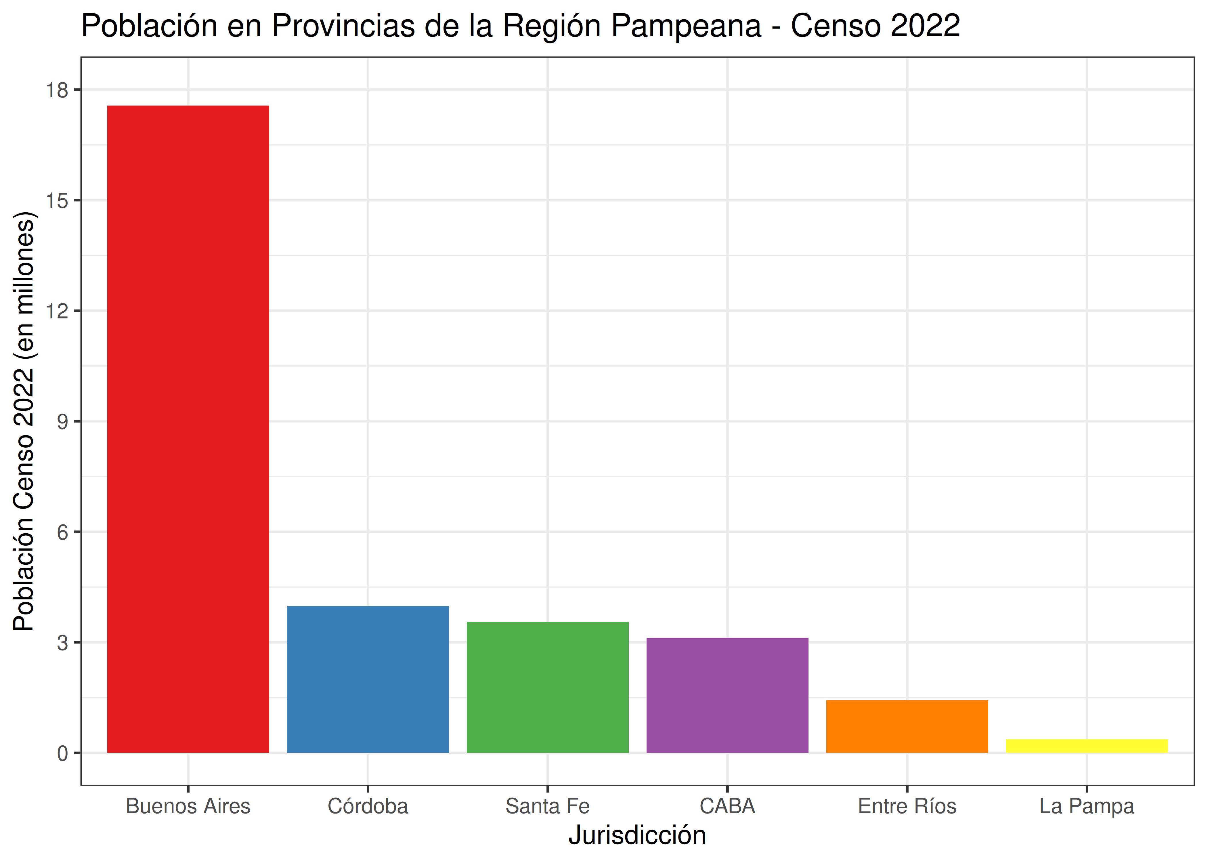 Veamos una vez más los datos de población para provincias pampeanas, pero a través de un gráfico de barras verticales: la proporción correspondiente a Buenos Aires parece mucho mayor que el 58%: