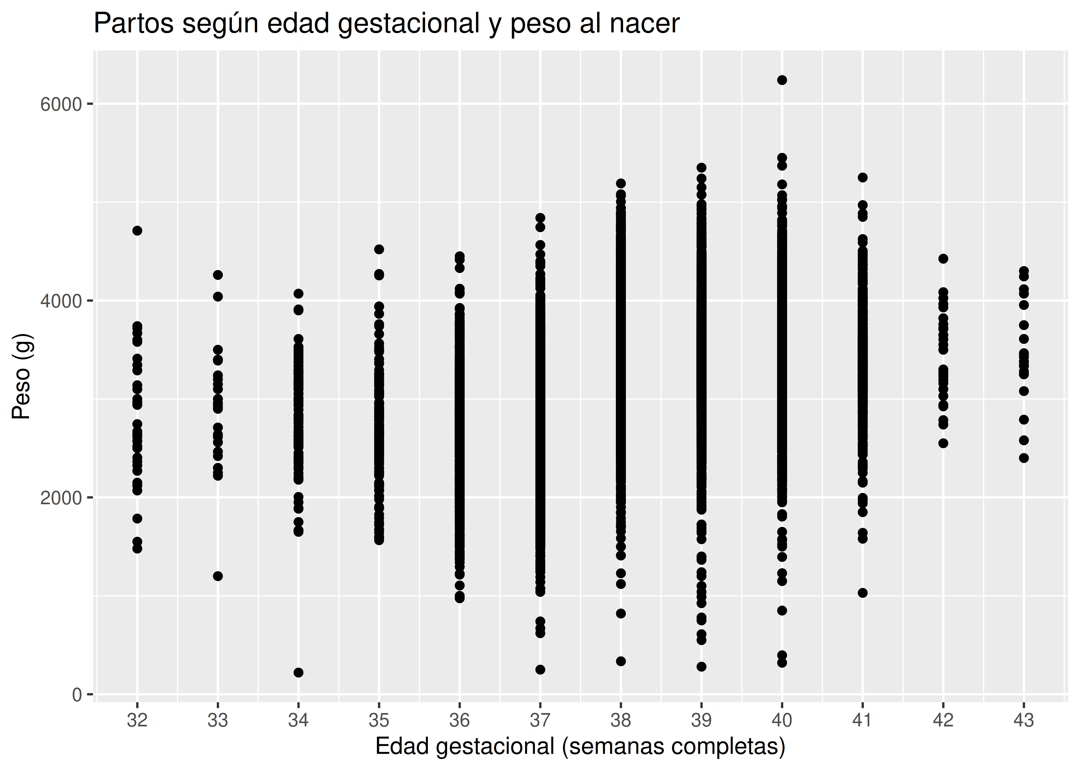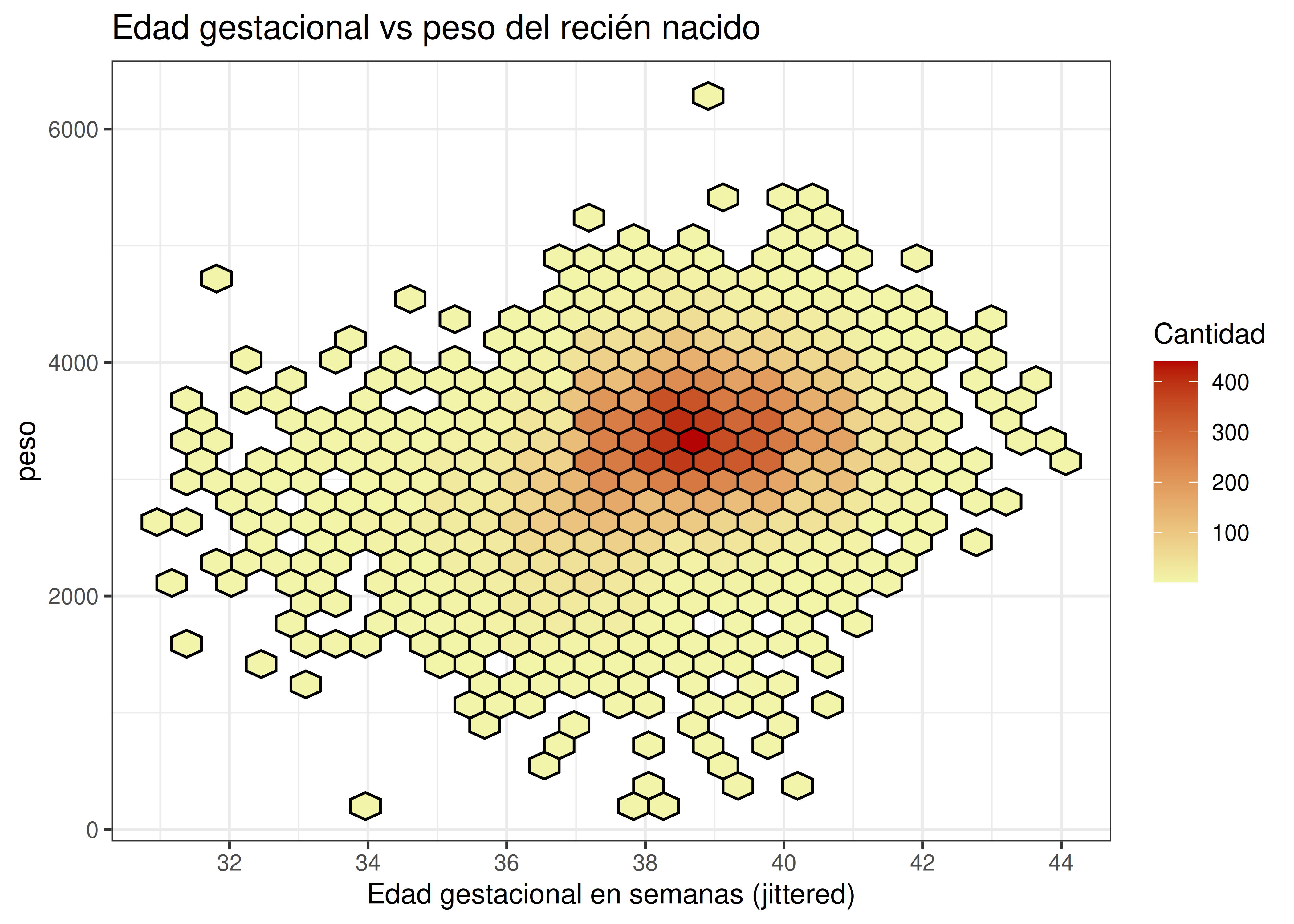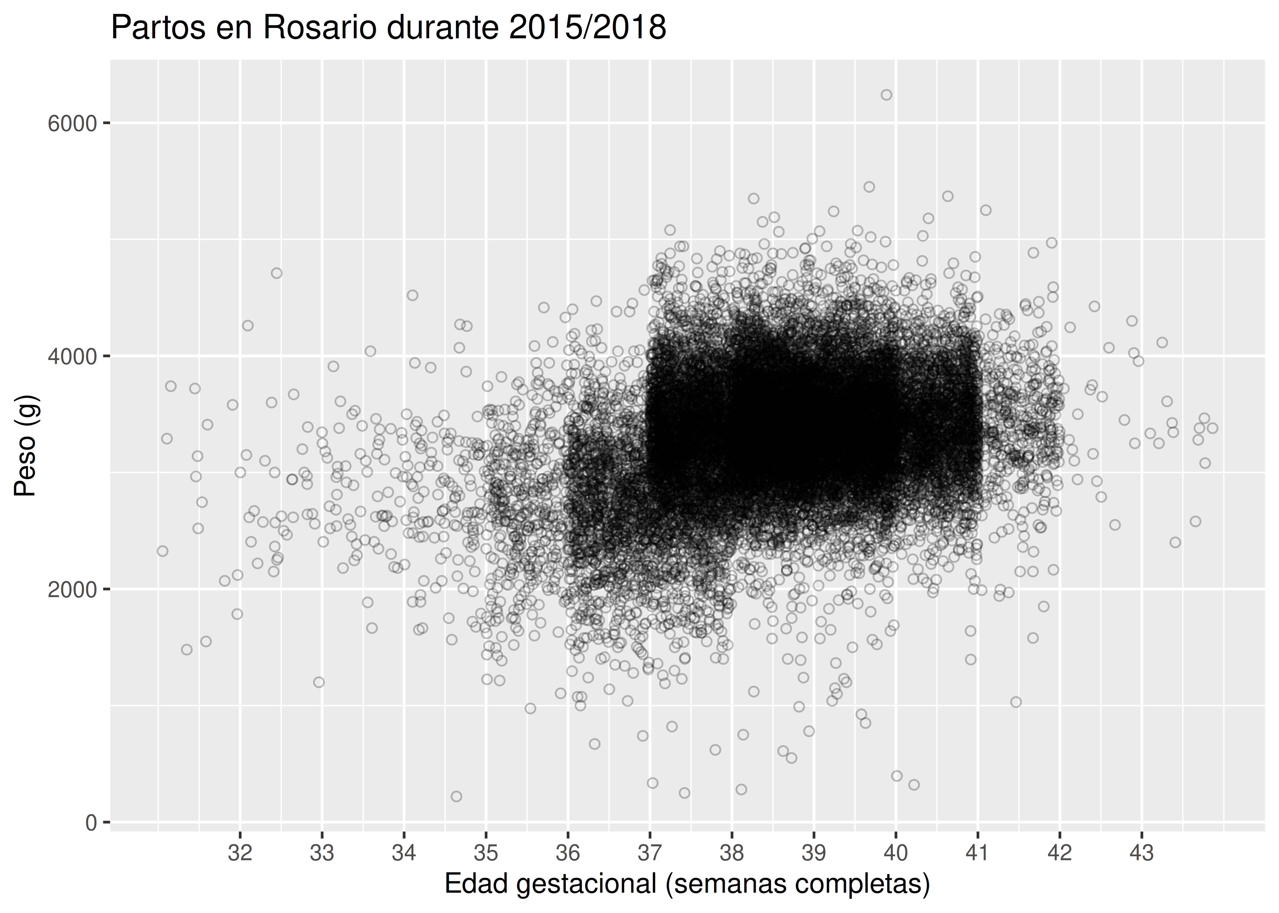 La apariencia de este gráfico de dispersión es muy diferente en comparación al que obtuvimos originalmente. Si bien el patrón general se mantiene, ahora se aprecia un volumen mucho mayor de datos en la sección central del gráfico (recordemos que estamos analizando más de 20.000 partos; en el gráfico original, se pueden apreciar a simple vista aproximadamente entre 350 y 600 puntos diferentes, dependiendo de la agudeza visual para distinguir diferencias en el sentido vertical).