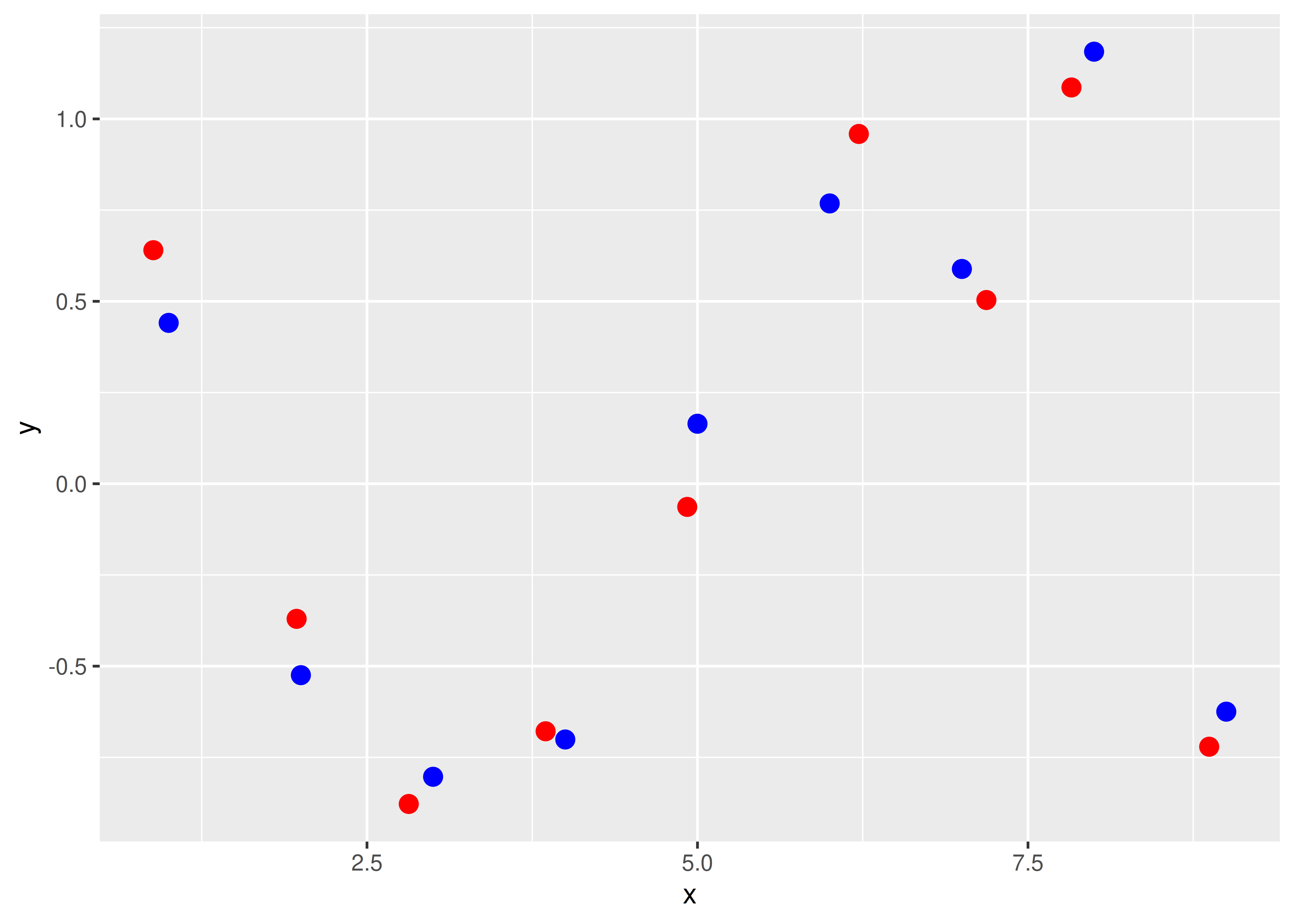 Ejemplo: puntos originales (azul) y puntos nuevos (rojo) luego de aplicar una perturbación de a lo sumo 0.25 unidades en cualquier dirección (horizontal y/o vertical).