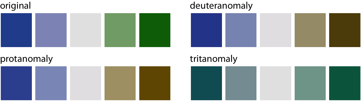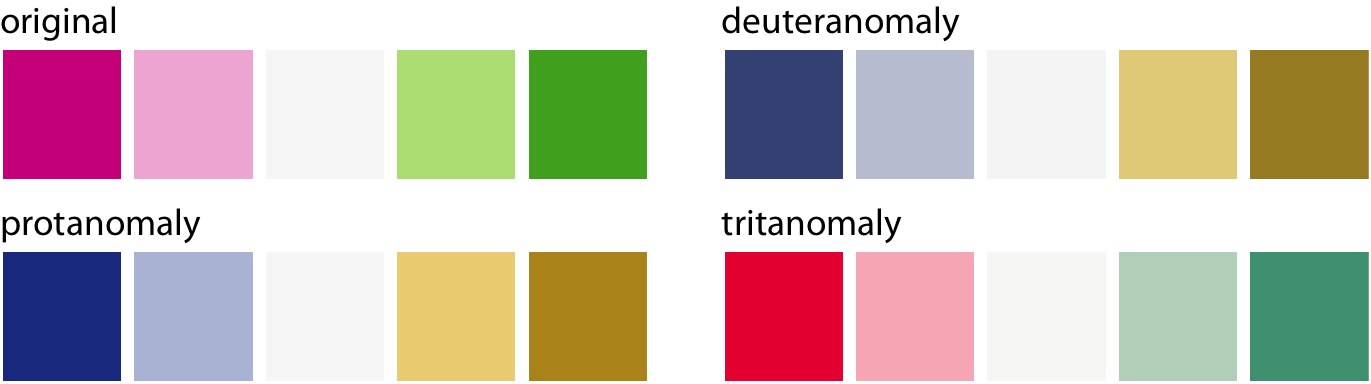 - Como alternativa, tenemos la paleta PiYG de Brewer (llamada original abajo). A su lado vemos cómo la visualizarían personas con diferentes tipos de daltonismo; todas las versiones siguen siendo fácilmente distinguibles: