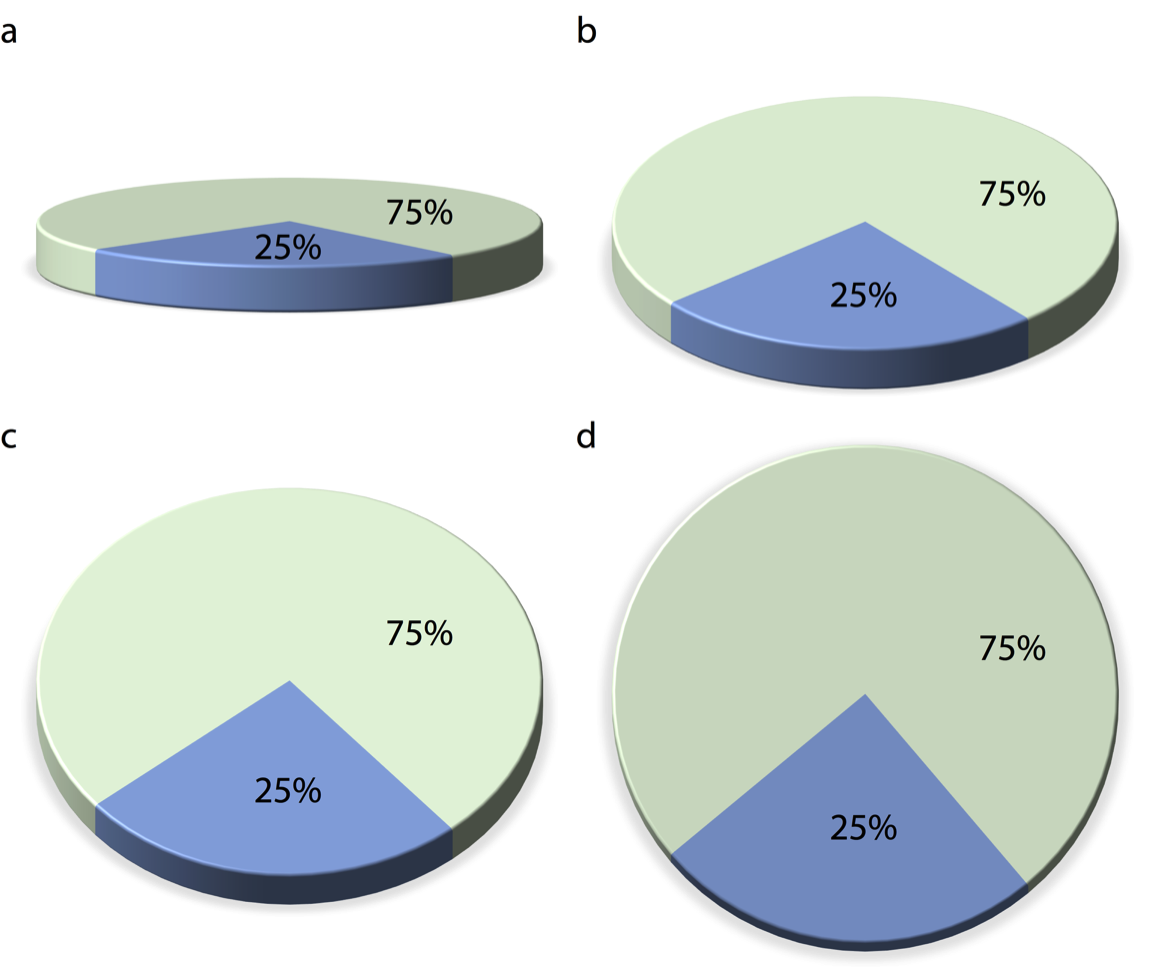 - Veamos cómo afecta el 3D a un gráfico de torta: a medida que rotamos el ángulo desde el cual vemos el gráfico, la porción más pequeña (25%) puede volverse artificialmente grande, enviando un mensaje contradictorio al espectador del gráfico.
