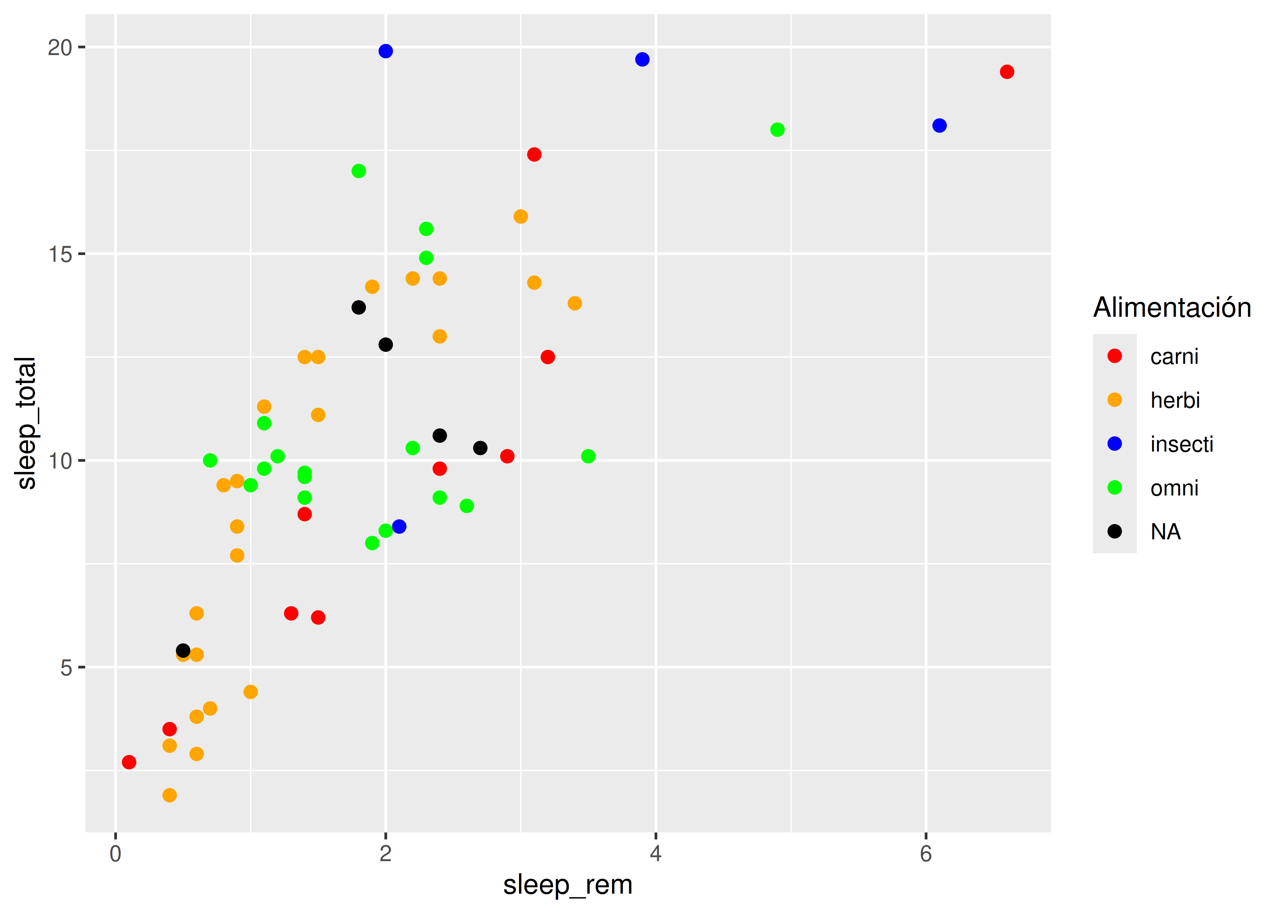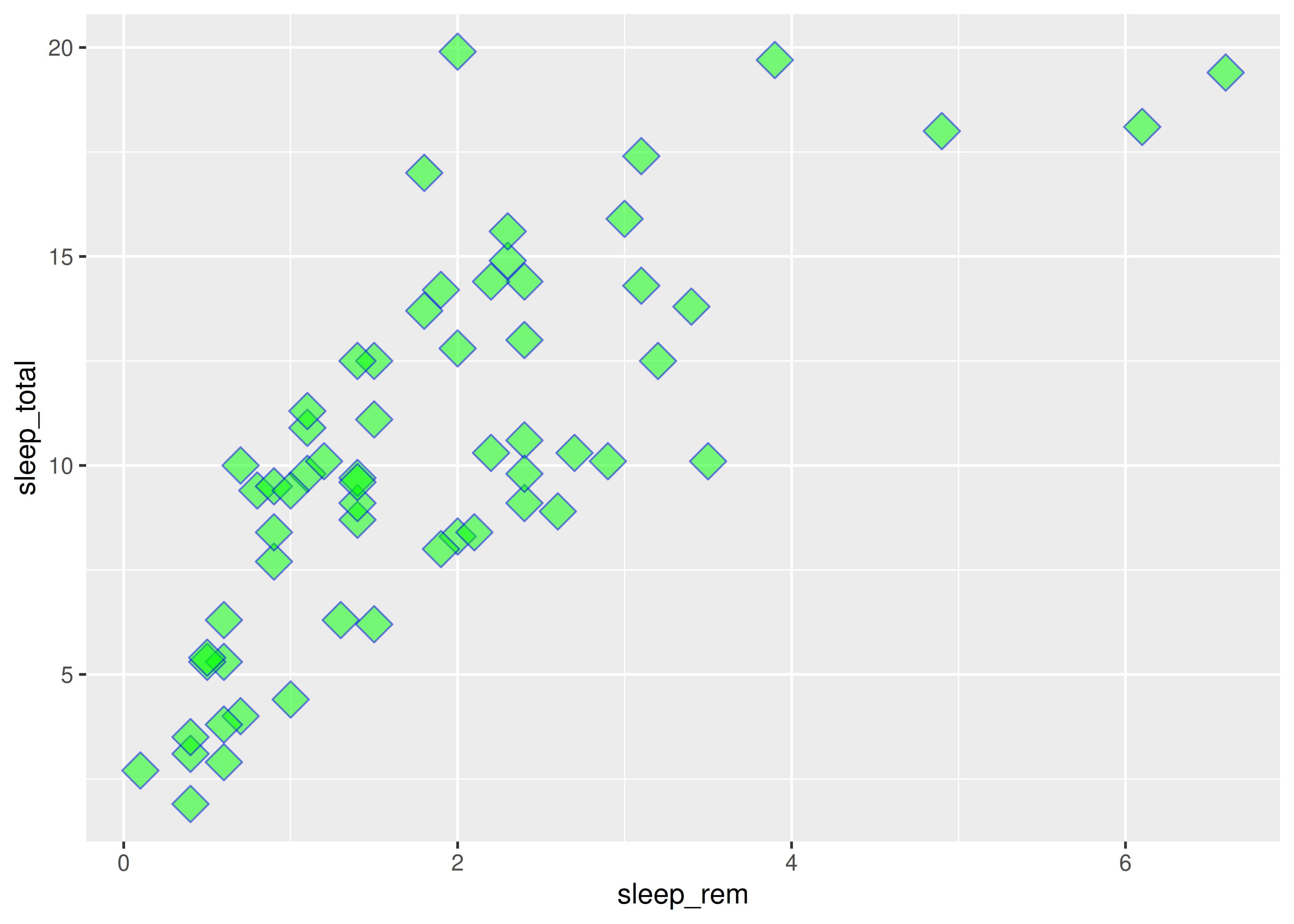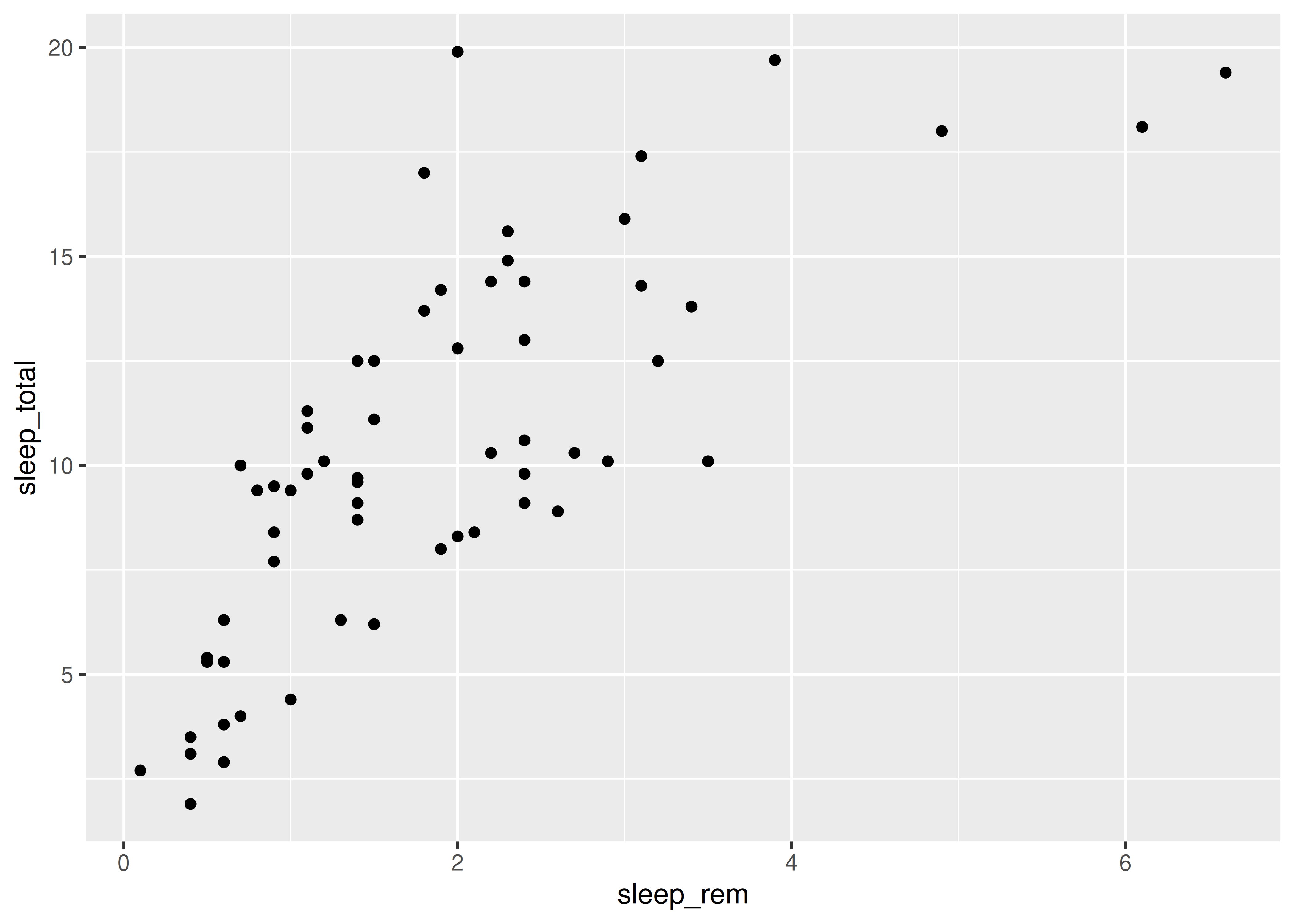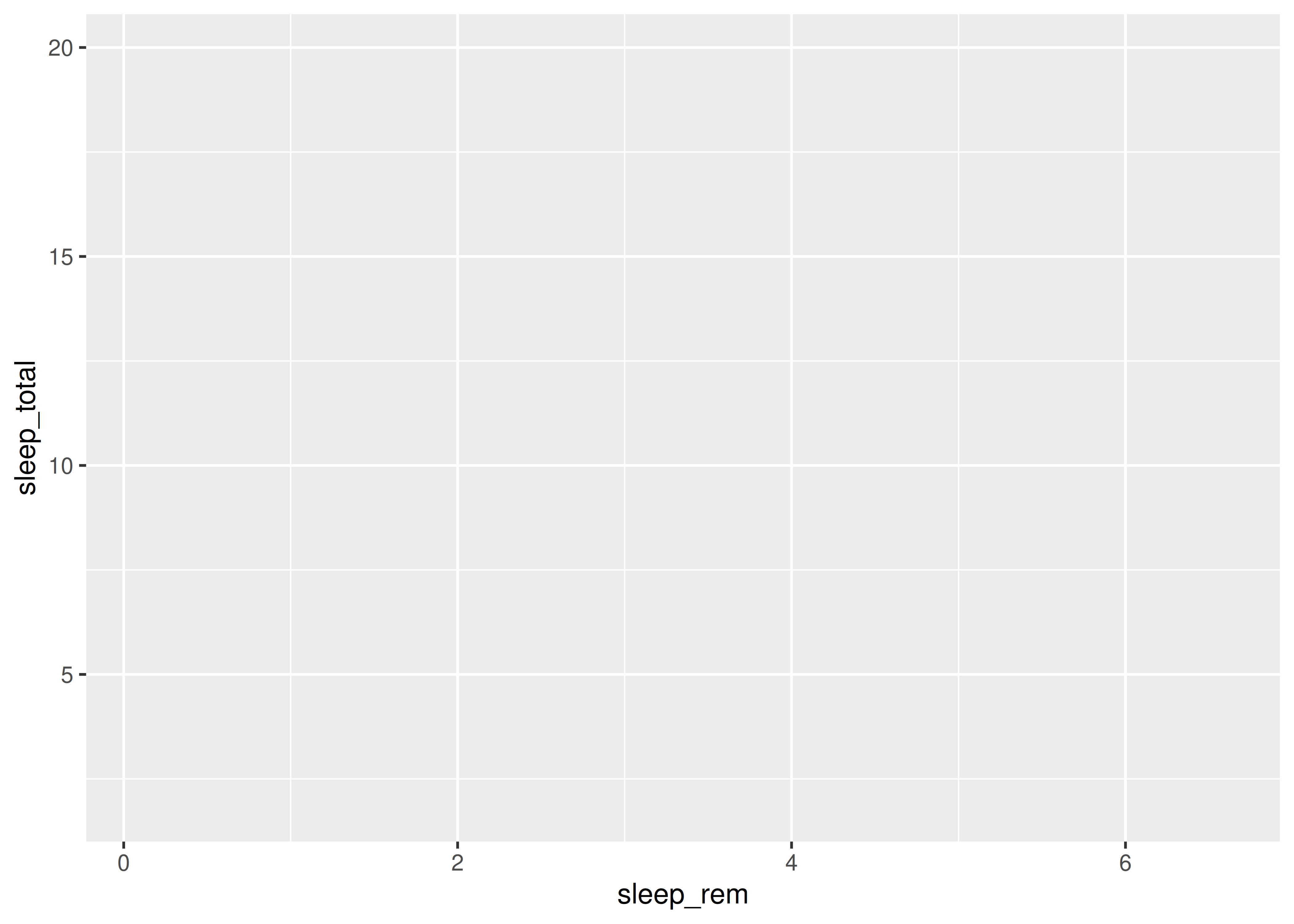 sleep_totalvssleep_rem, vamos a mapear la variablesleep_remal elemento de mapeo \(x\) y la variablesleep_totalal elemento de mapeo \(y\).Esto se hace sumando una capa al código inicial, con el operador