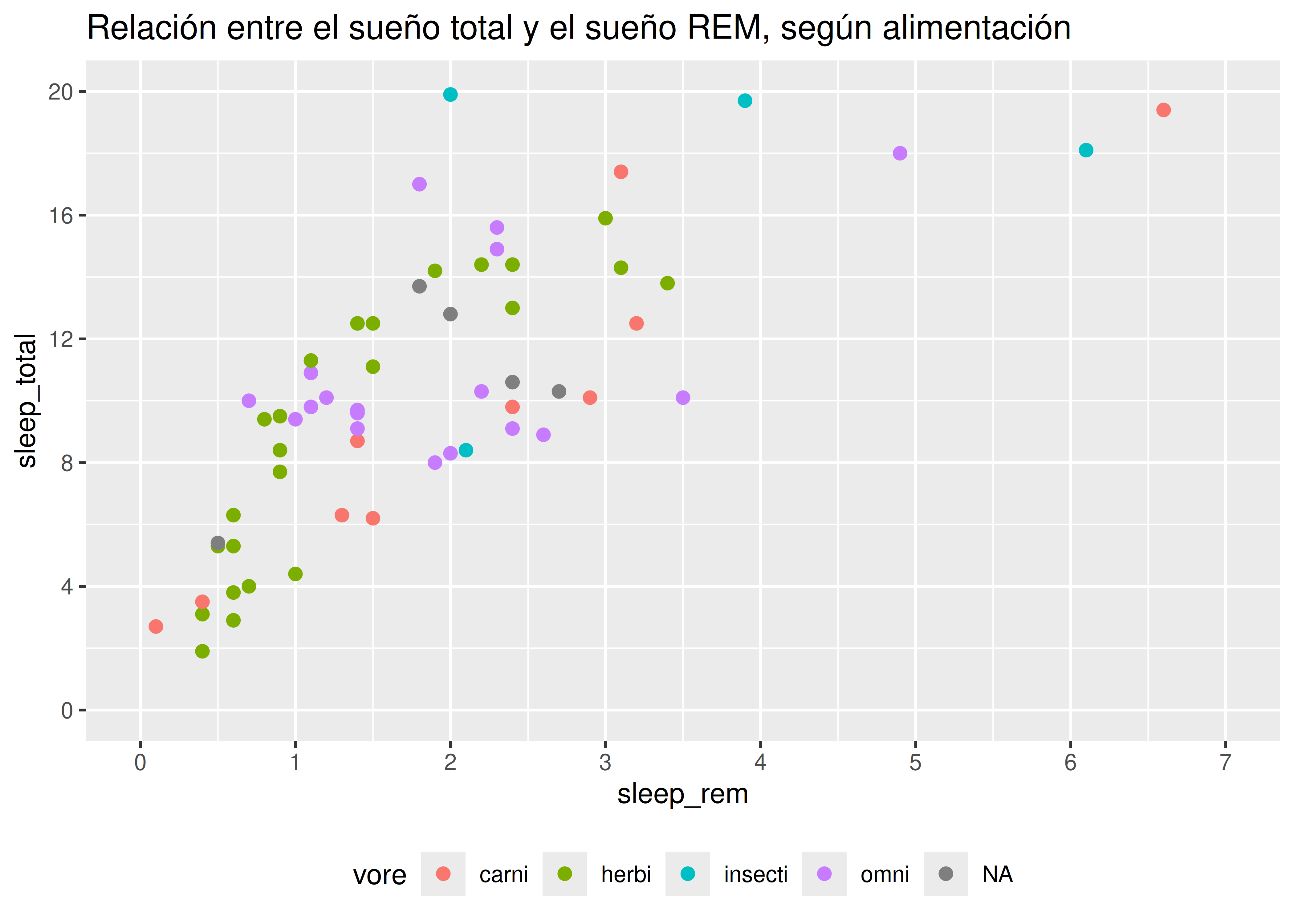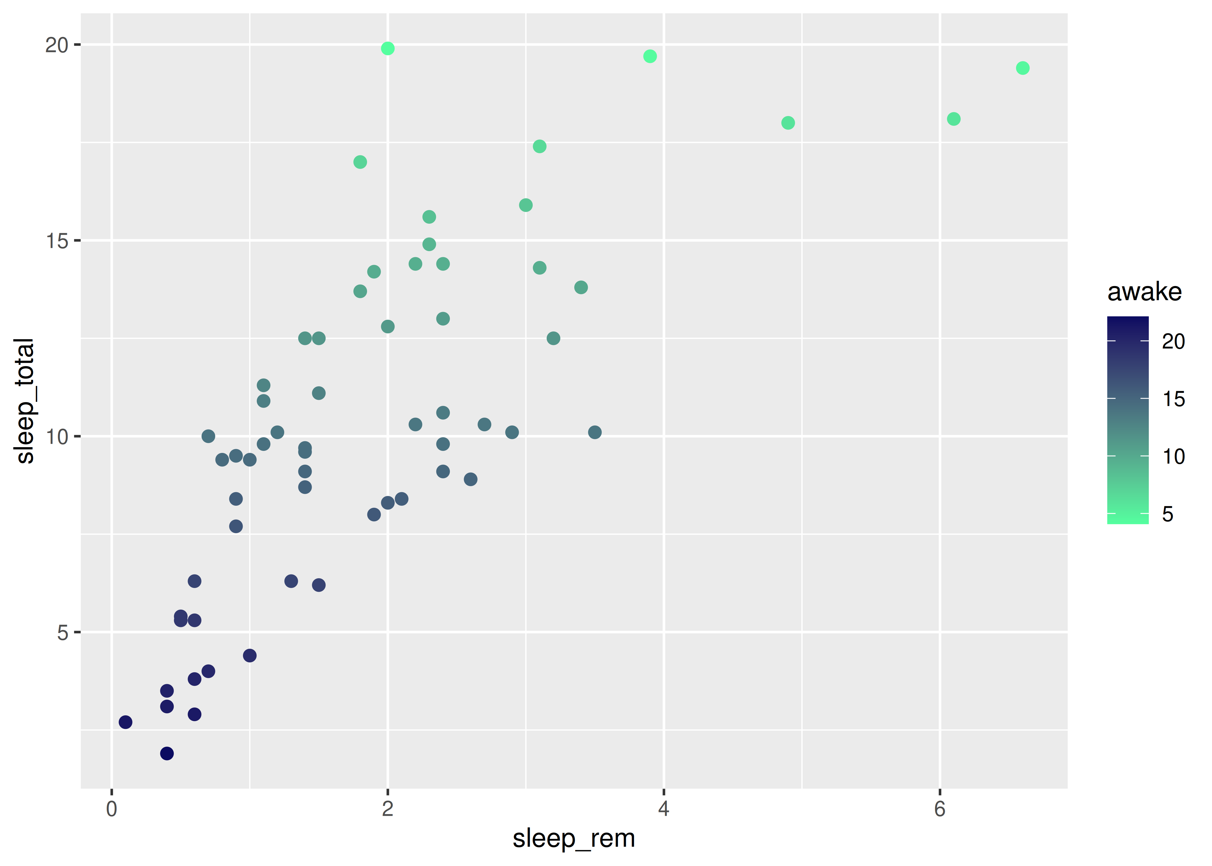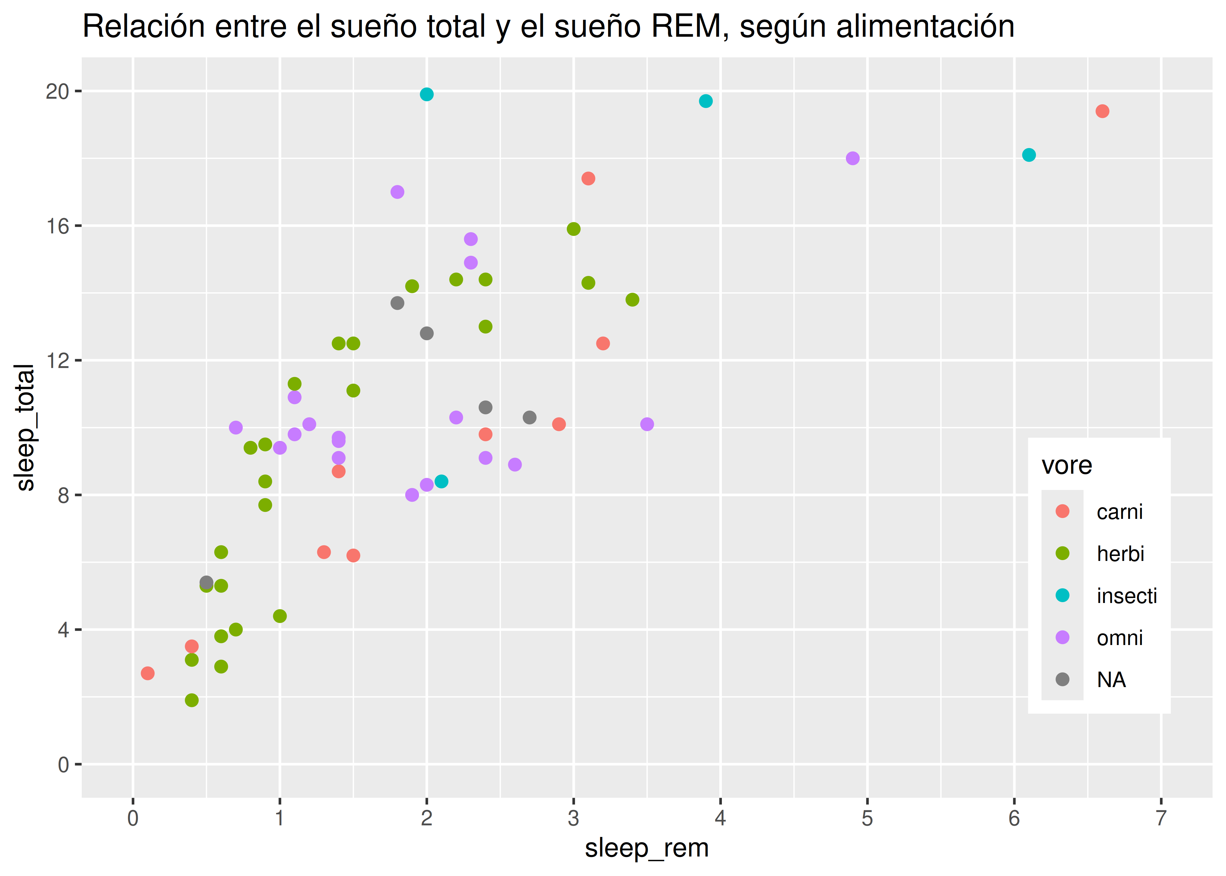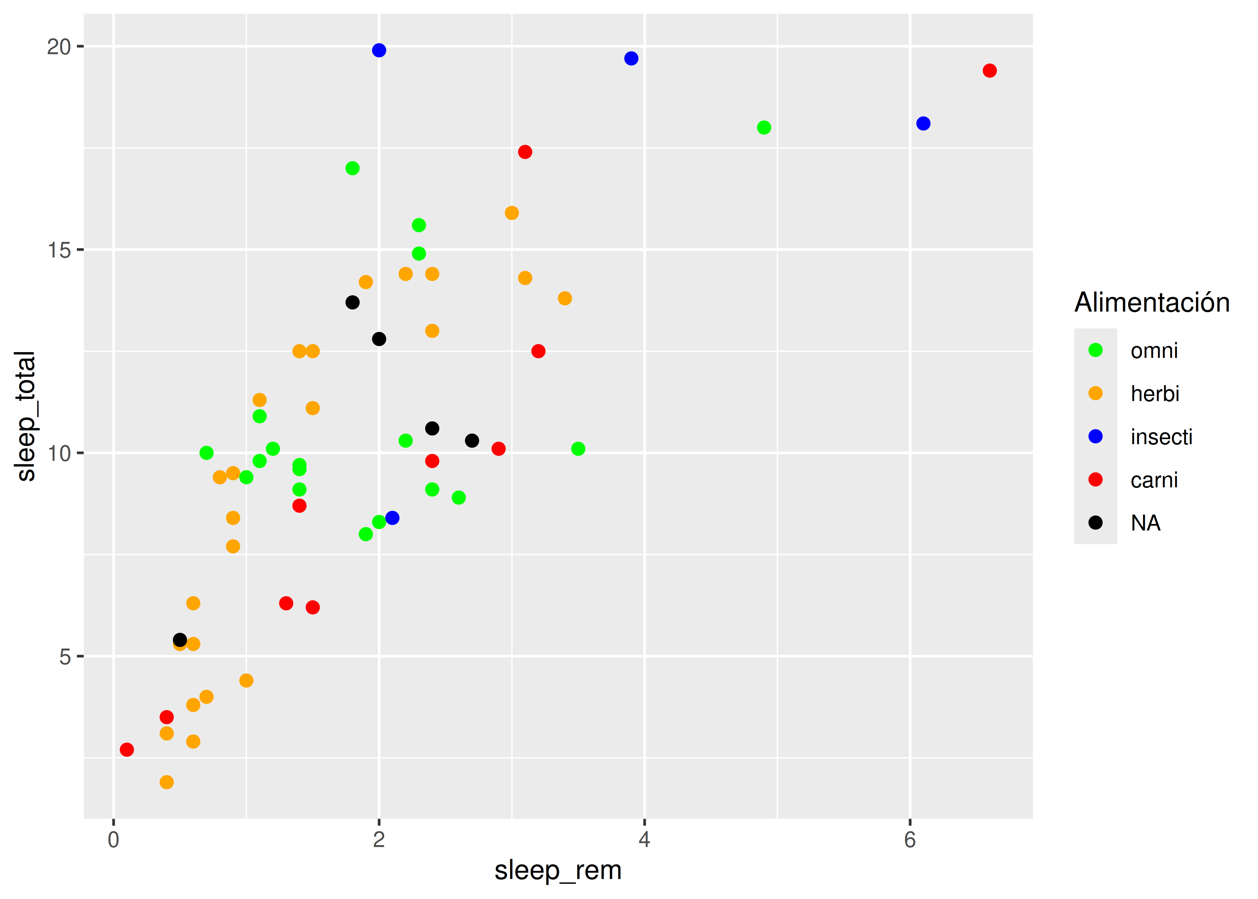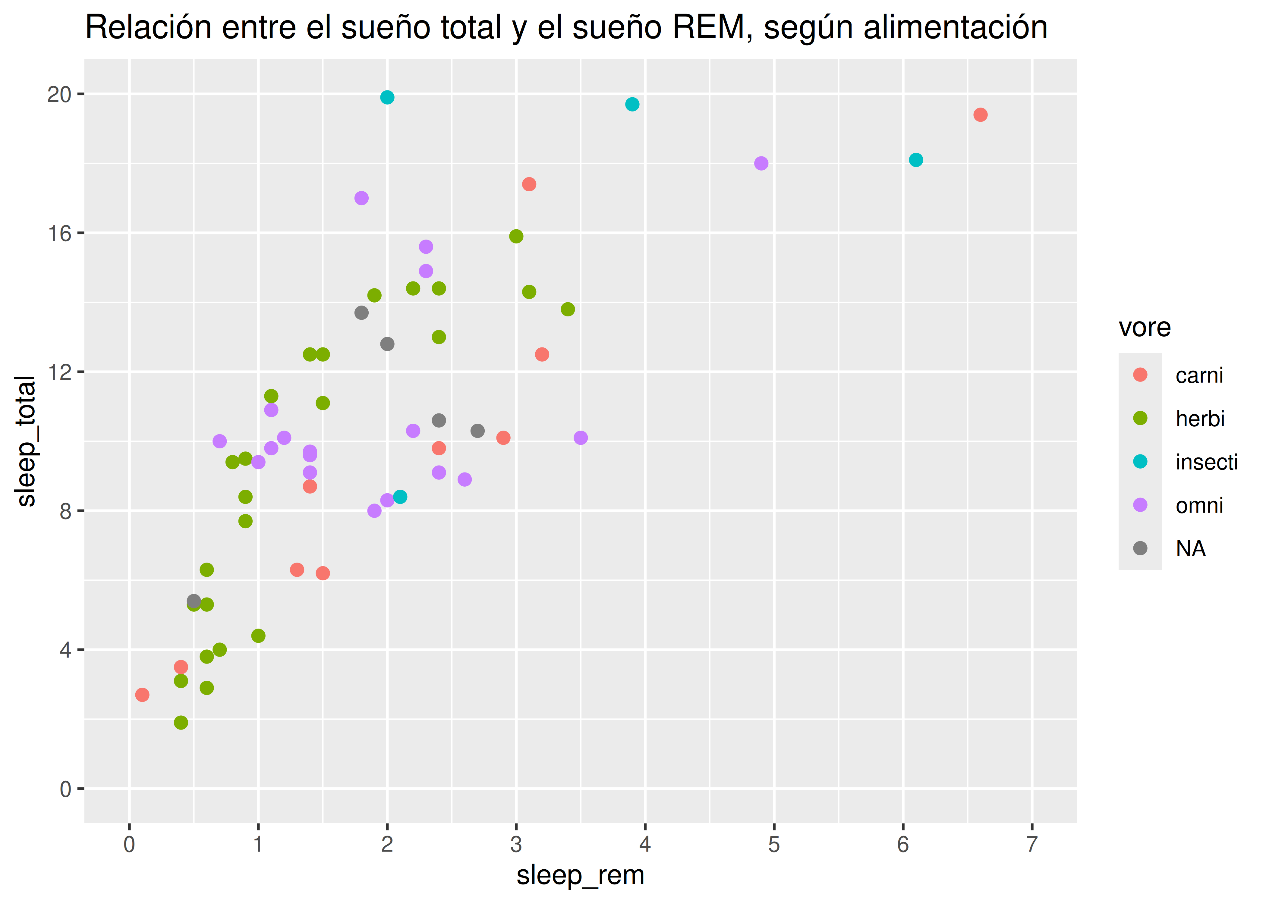 sleep_totalvssleep_rem, vamos a mapear la variablesleep_remal elemento de mapeo \(x\) y la variablesleep_totalal elemento de mapeo \(y\).Esto se hace sumando una capa al código inicial, con el operador