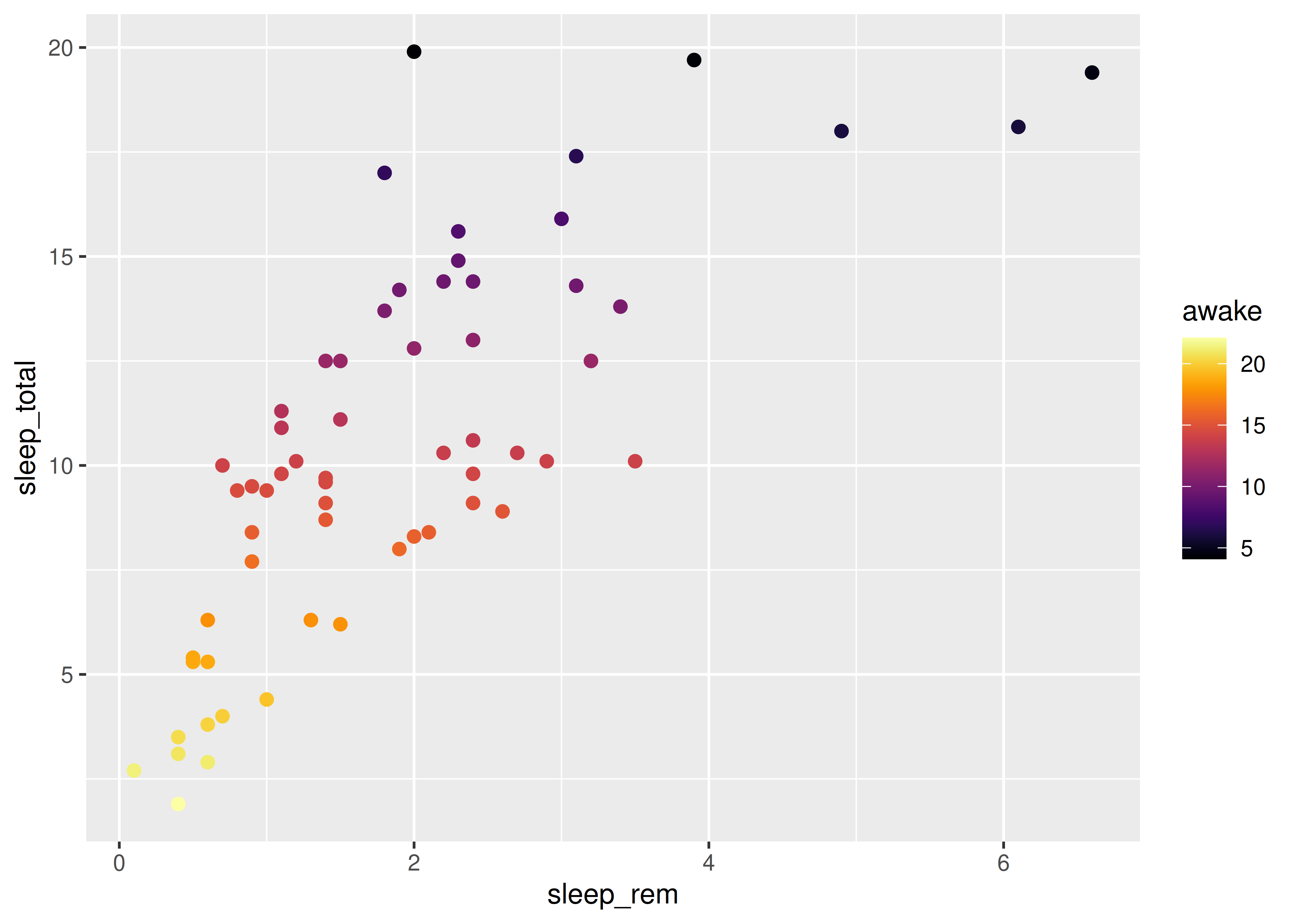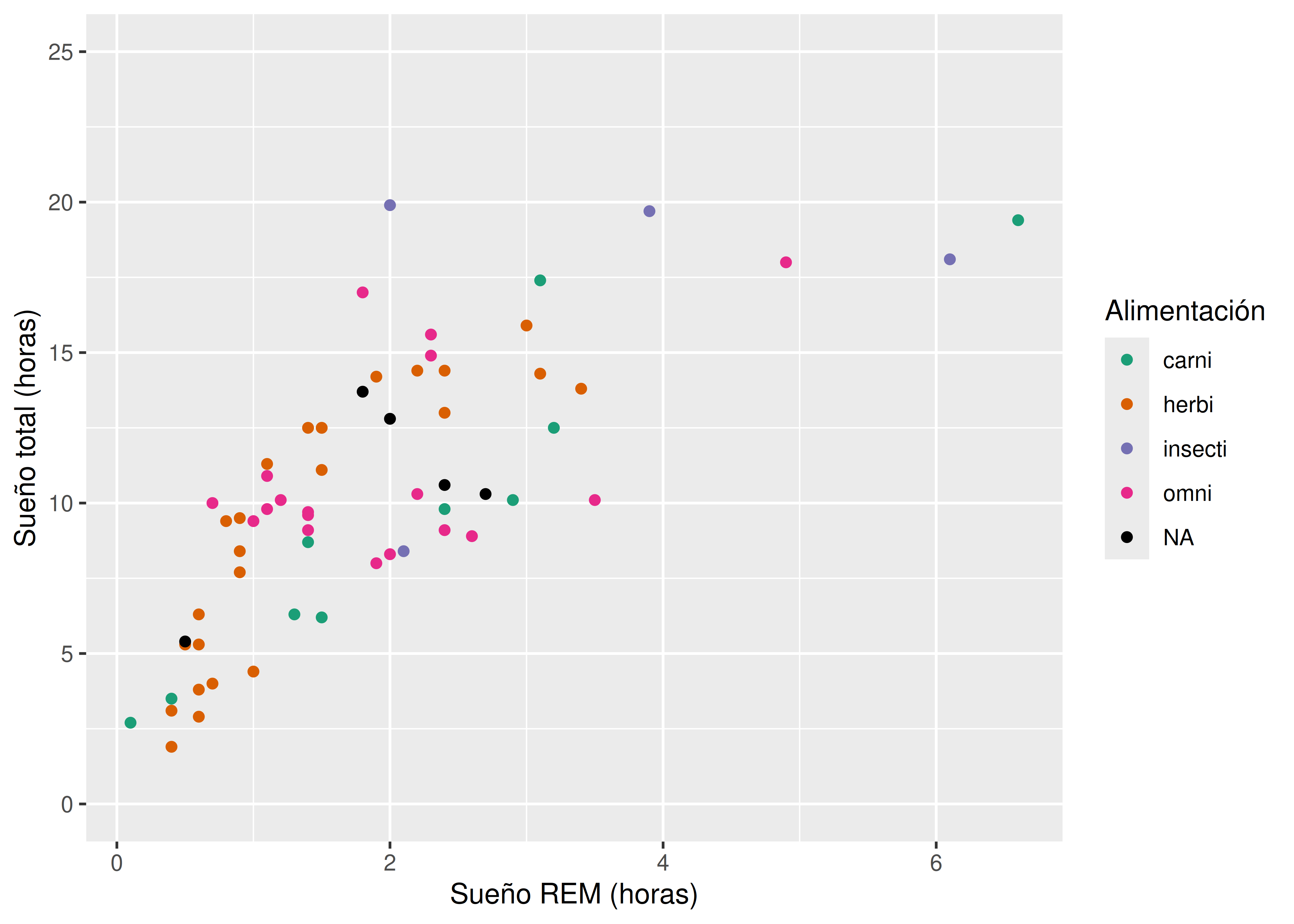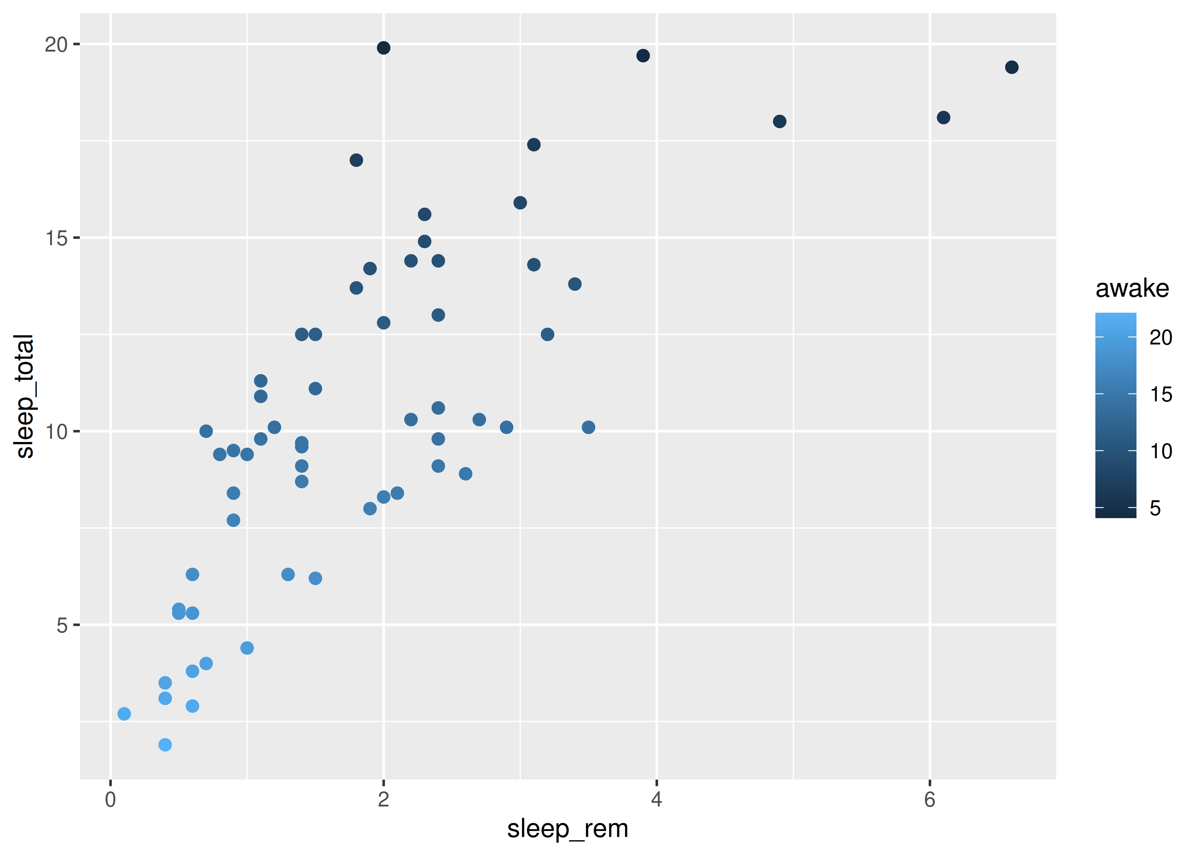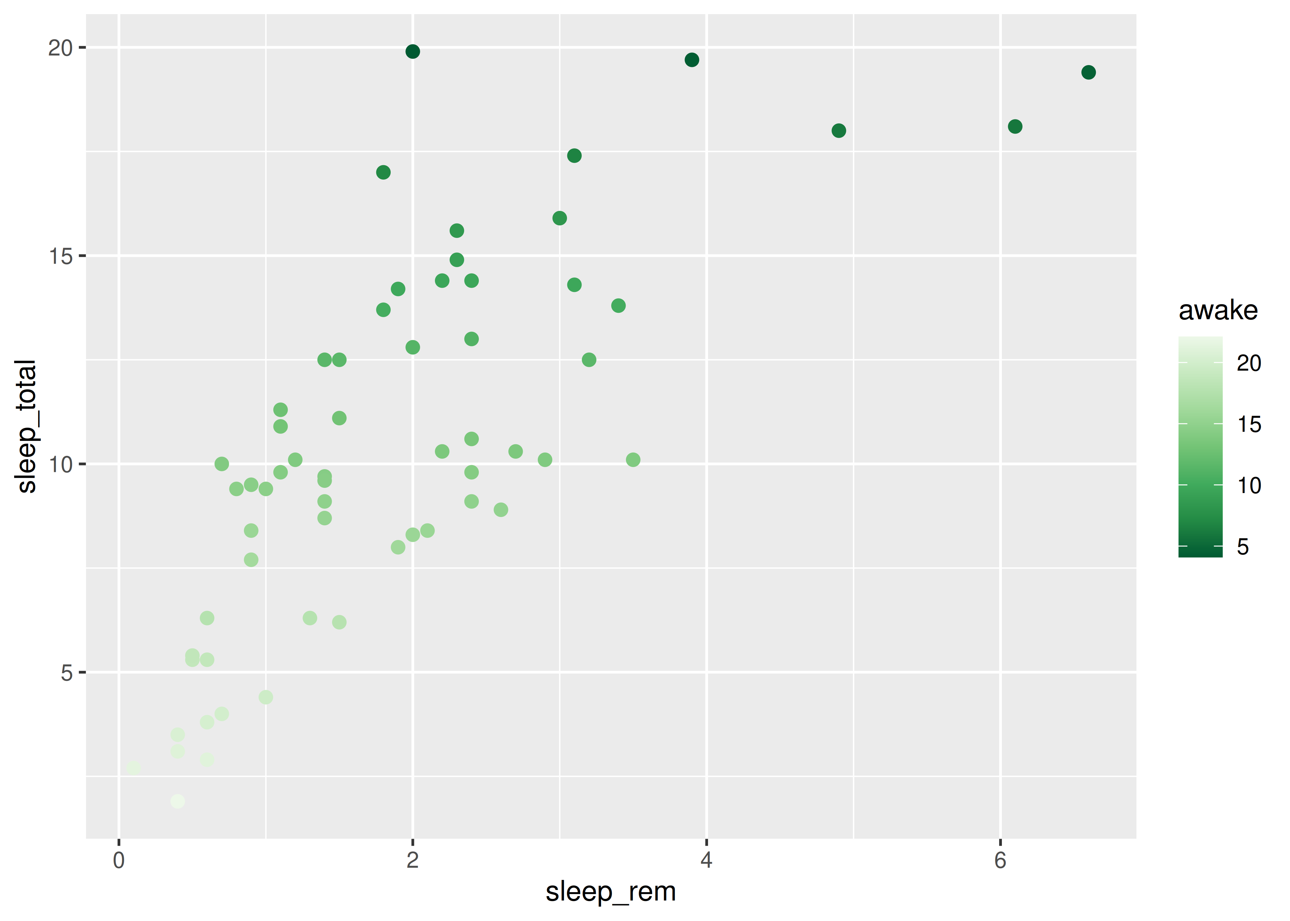 sleep_totalvssleep_rem, vamos a mapear la variablesleep_remal elemento de mapeo \(x\) y la variablesleep_totalal elemento de mapeo \(y\).Esto se hace sumando una capa al código inicial, con el operador