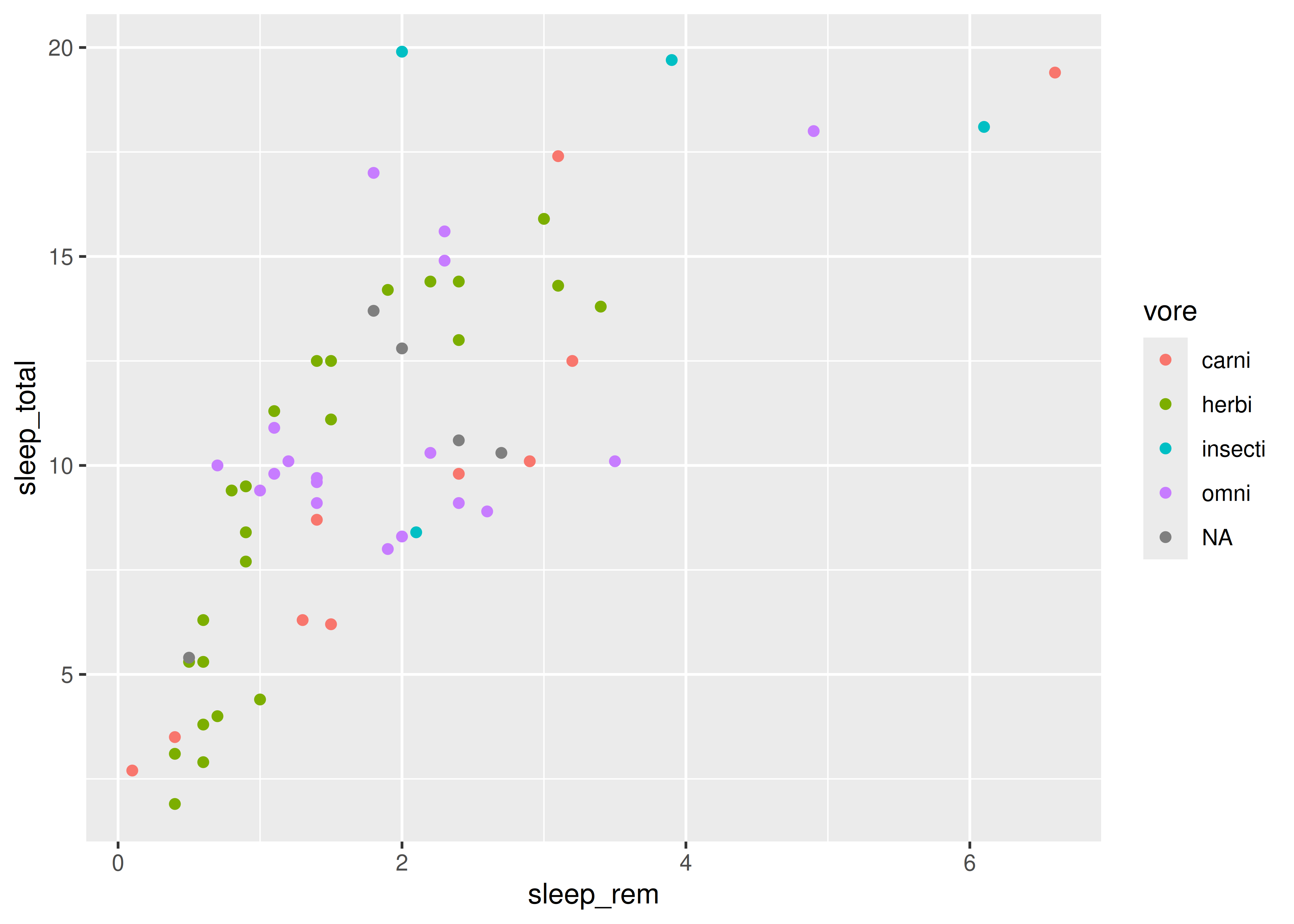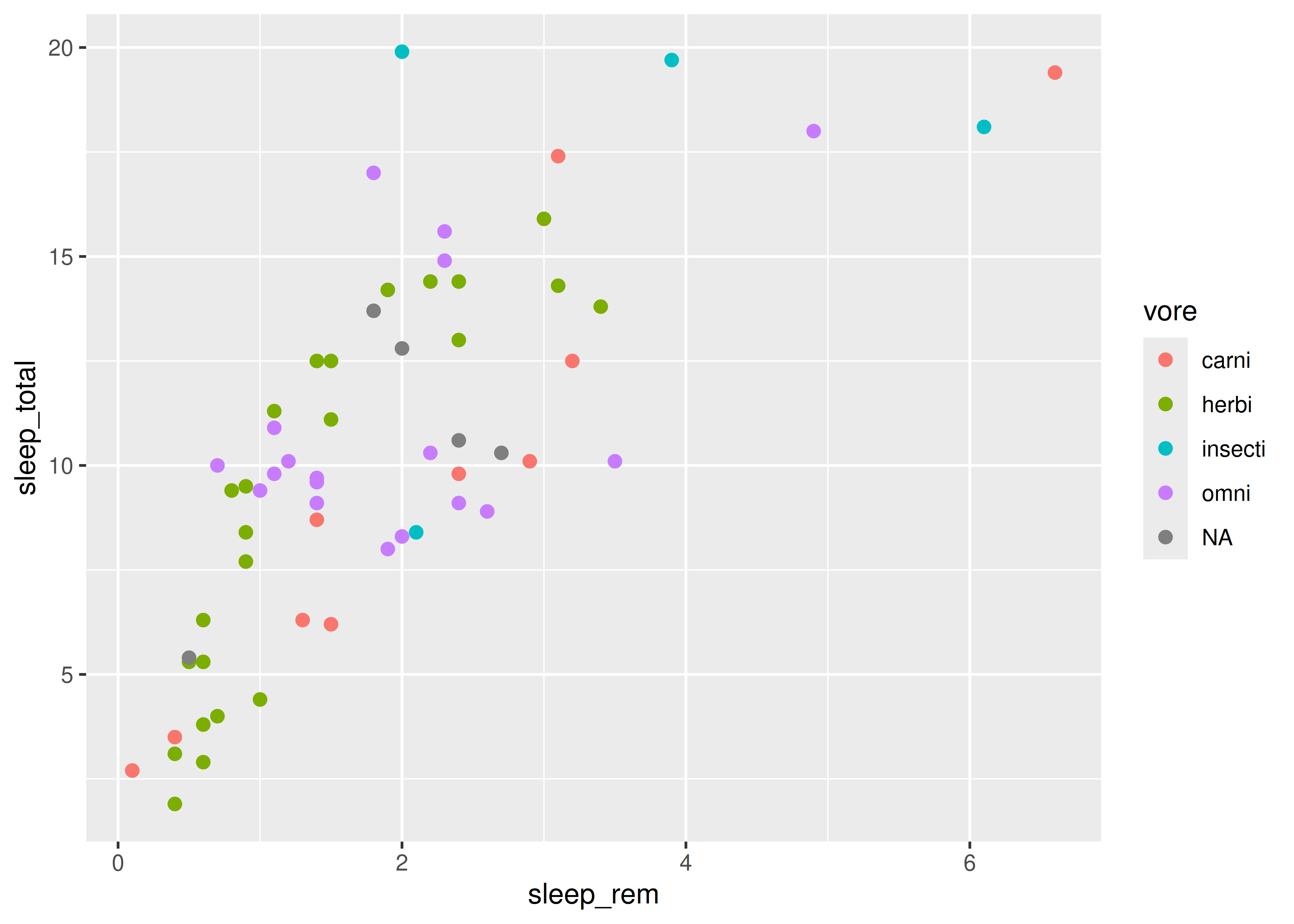 aes(x = sleep_rem, y = sleep_total, color = vore) +