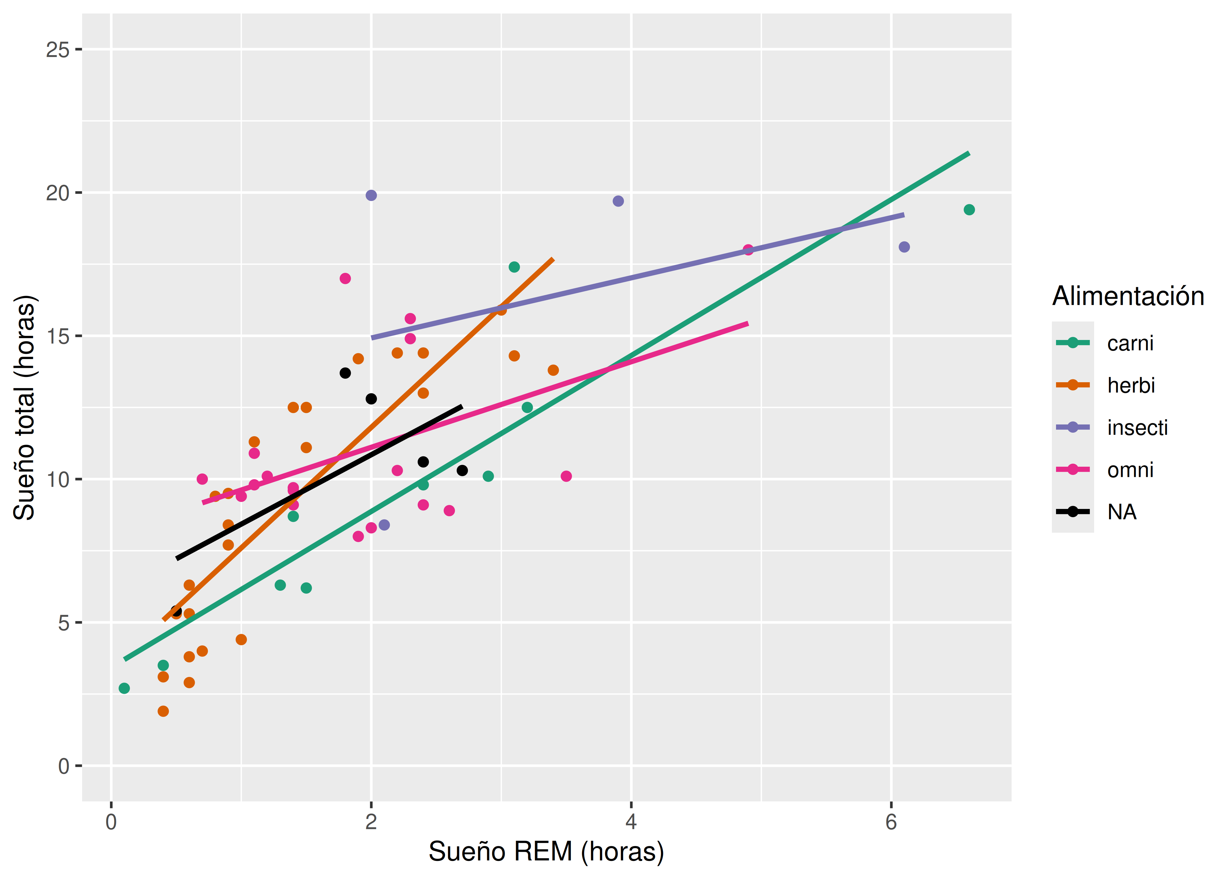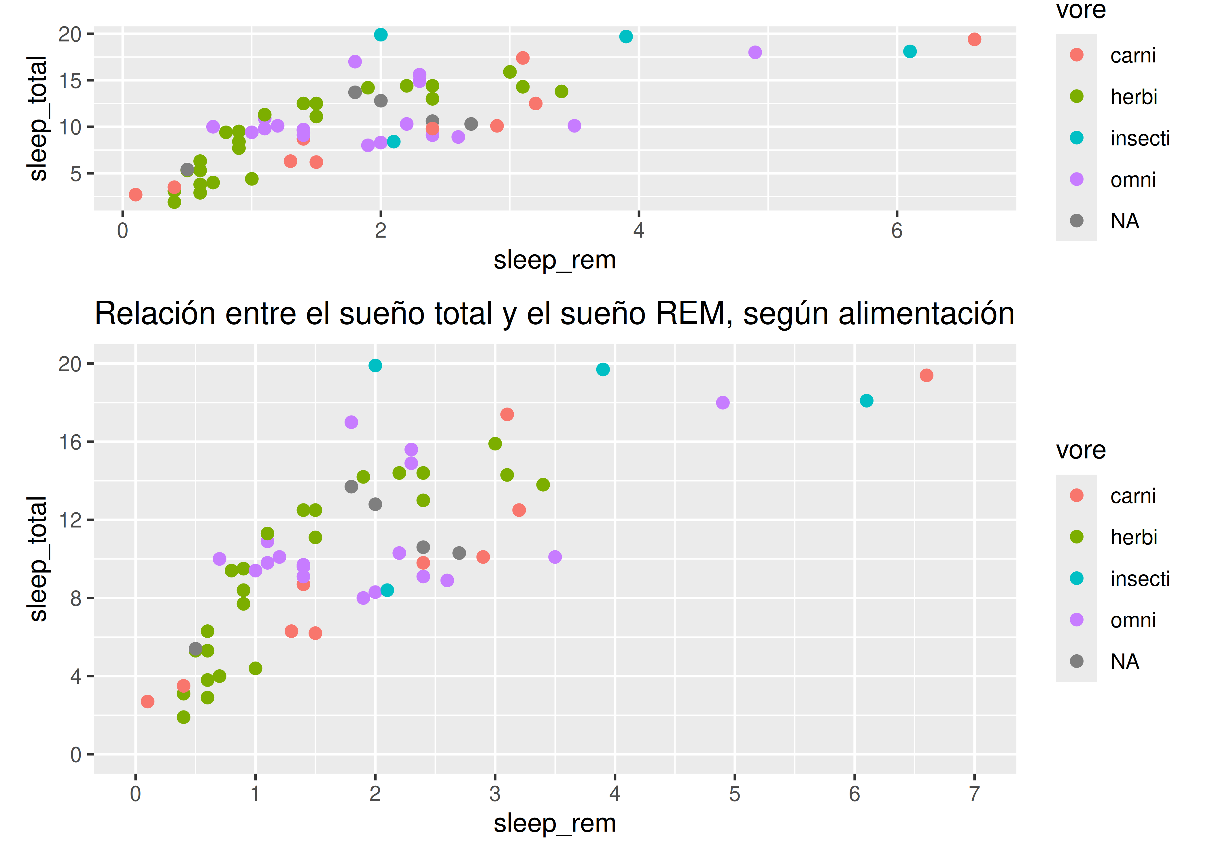 ggtitle("Relación entre el sueño total y el sueño REM, según alimentación")# Podemos crear una nueva versión, con título y alguna otra modificación