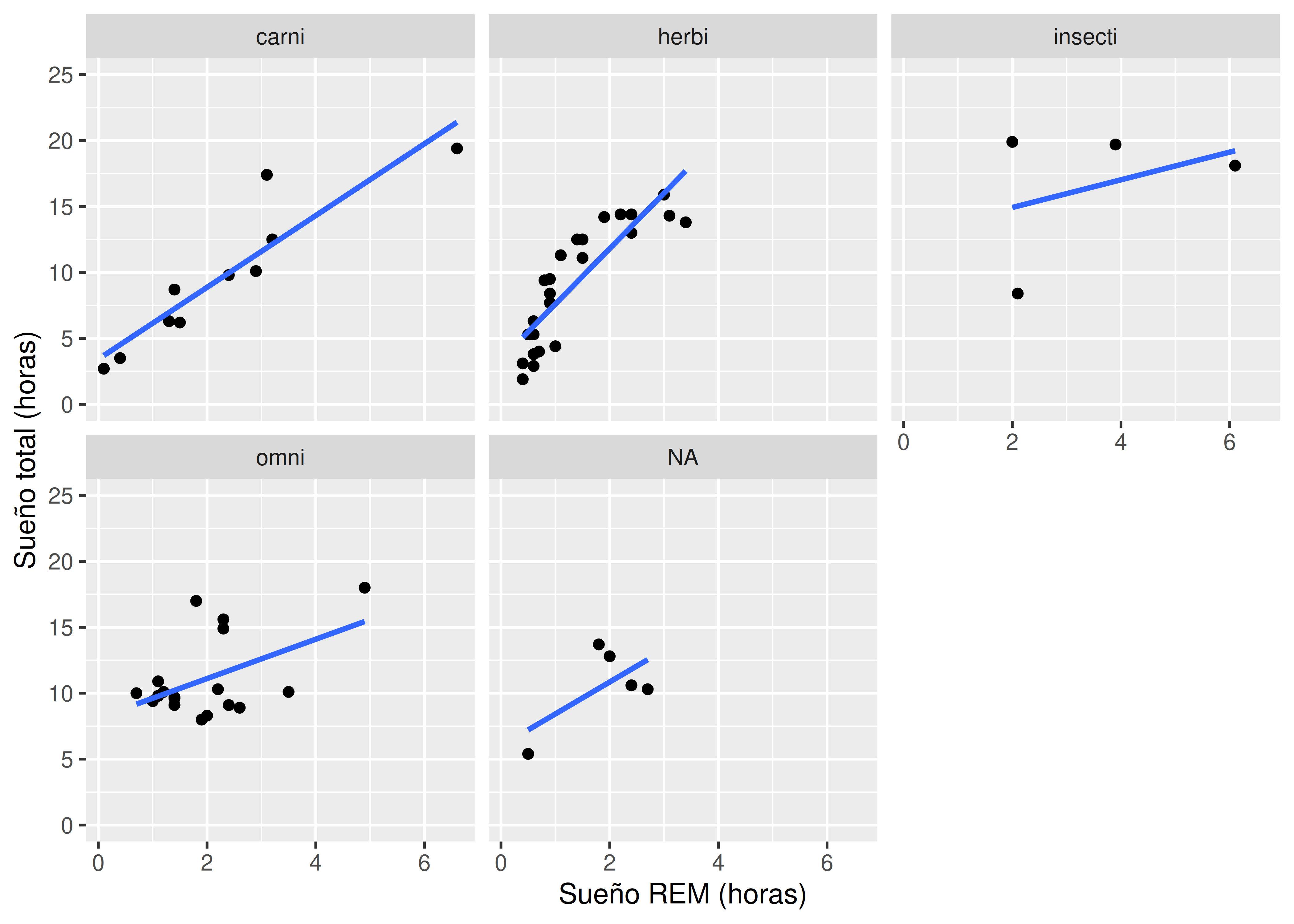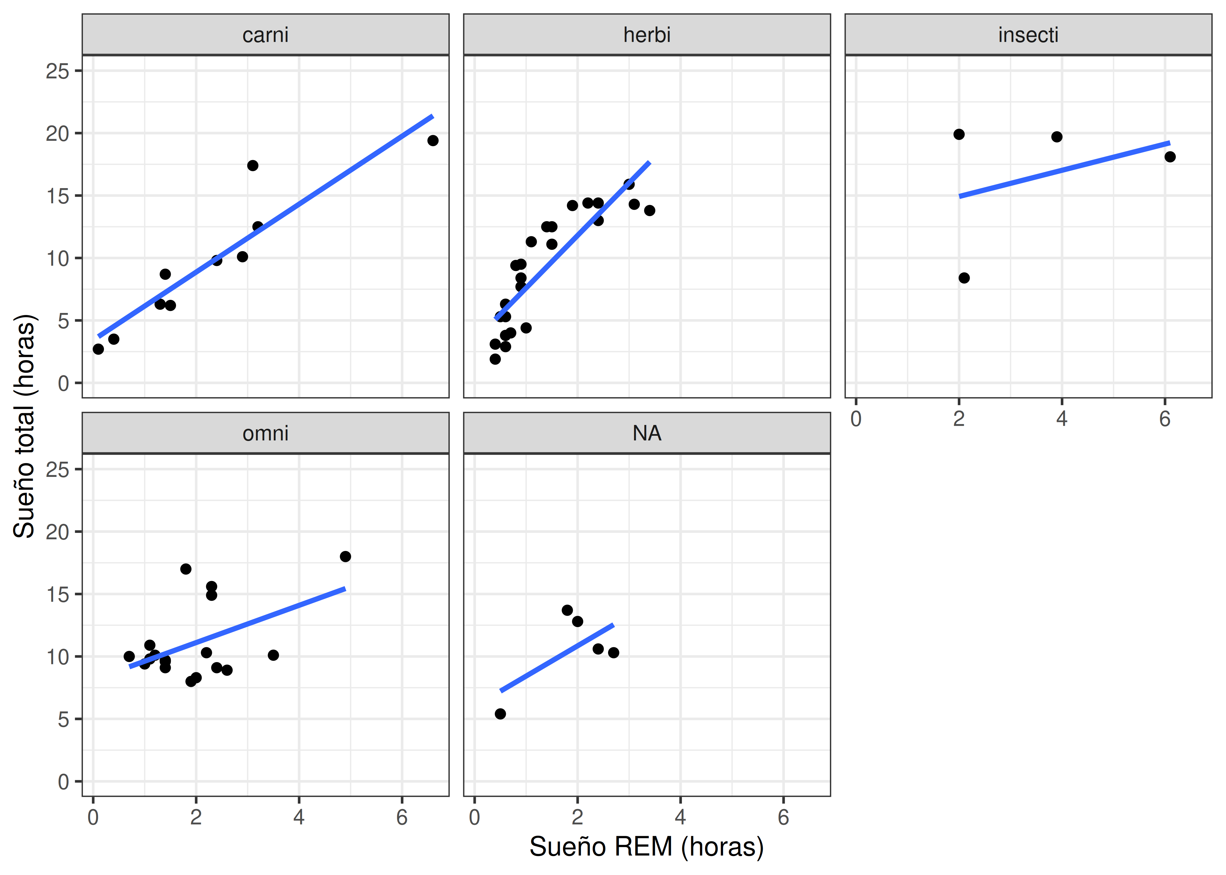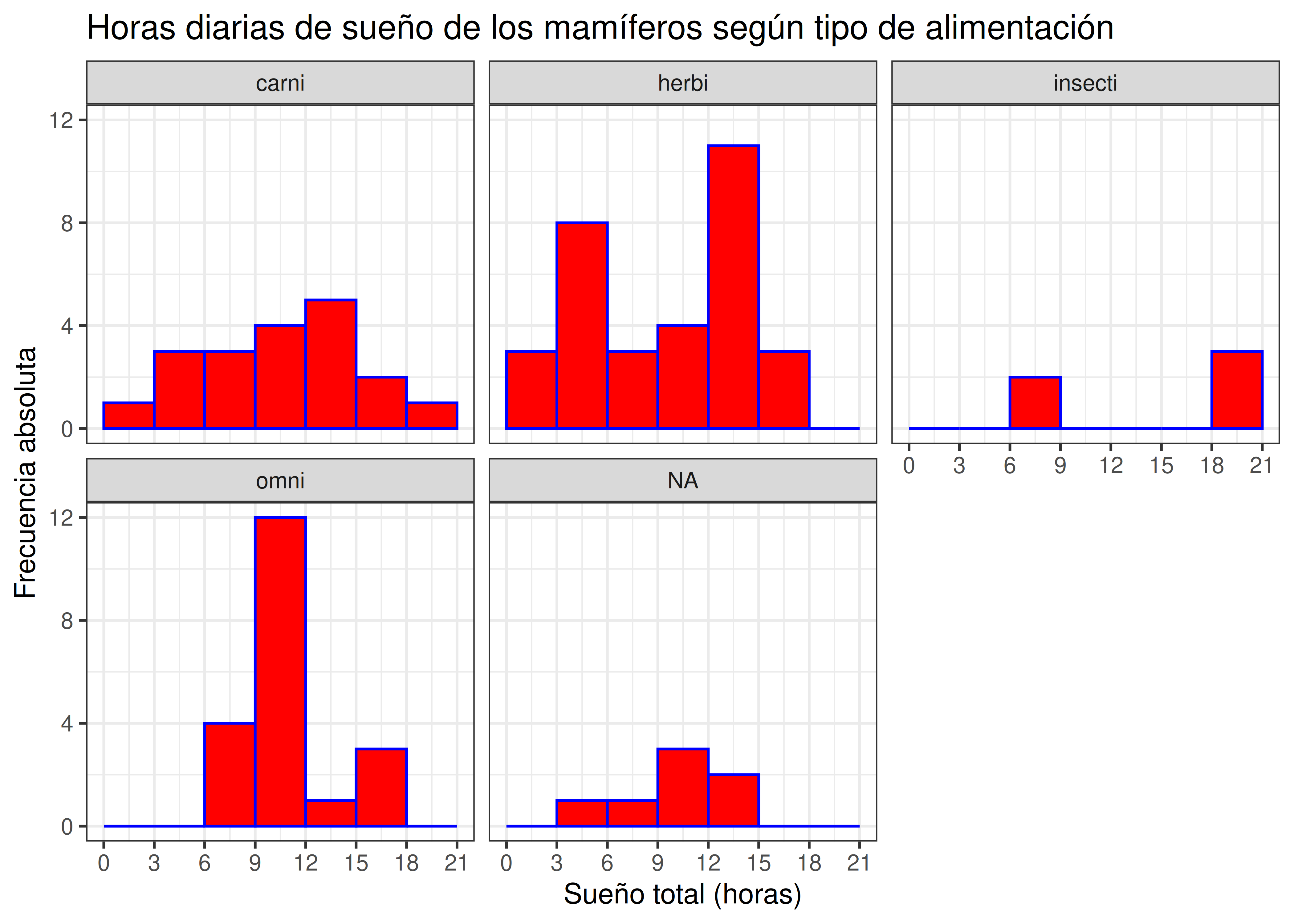 theme_bw()Reproducir el siguiente gráfico que analiza las horas diarias de sueño según el tipo de alimentación de cada mamífero, a través de histogramas: