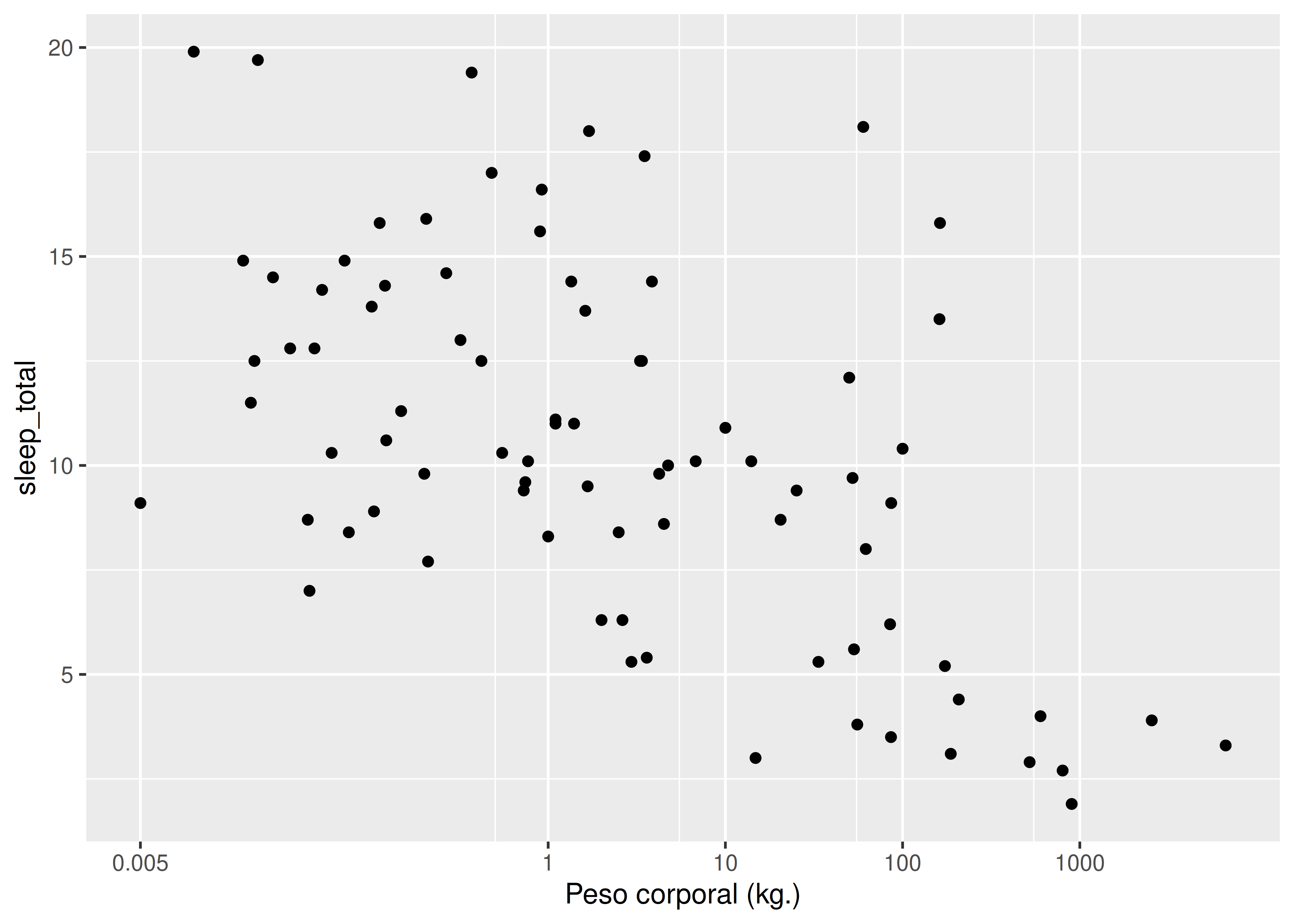 - Para ejemplificar las modificaciones al sistema de coordenadas aplicaremos una transformación logarítmica, que en este caso puede servir para visualizar mejor la relación entre las horas de sueño y el peso corporal, ya que esta última posee una distribución muy asimétrica: