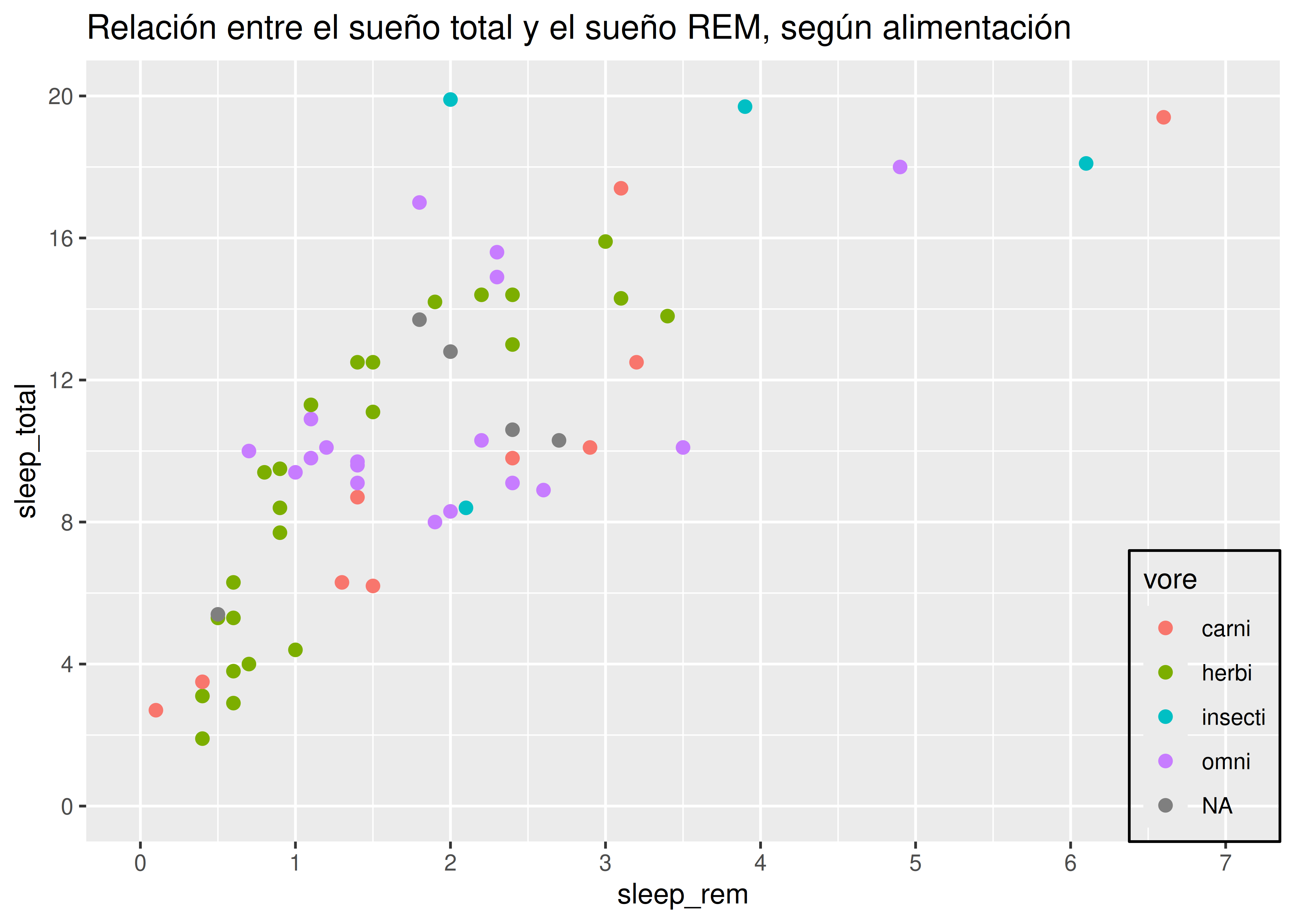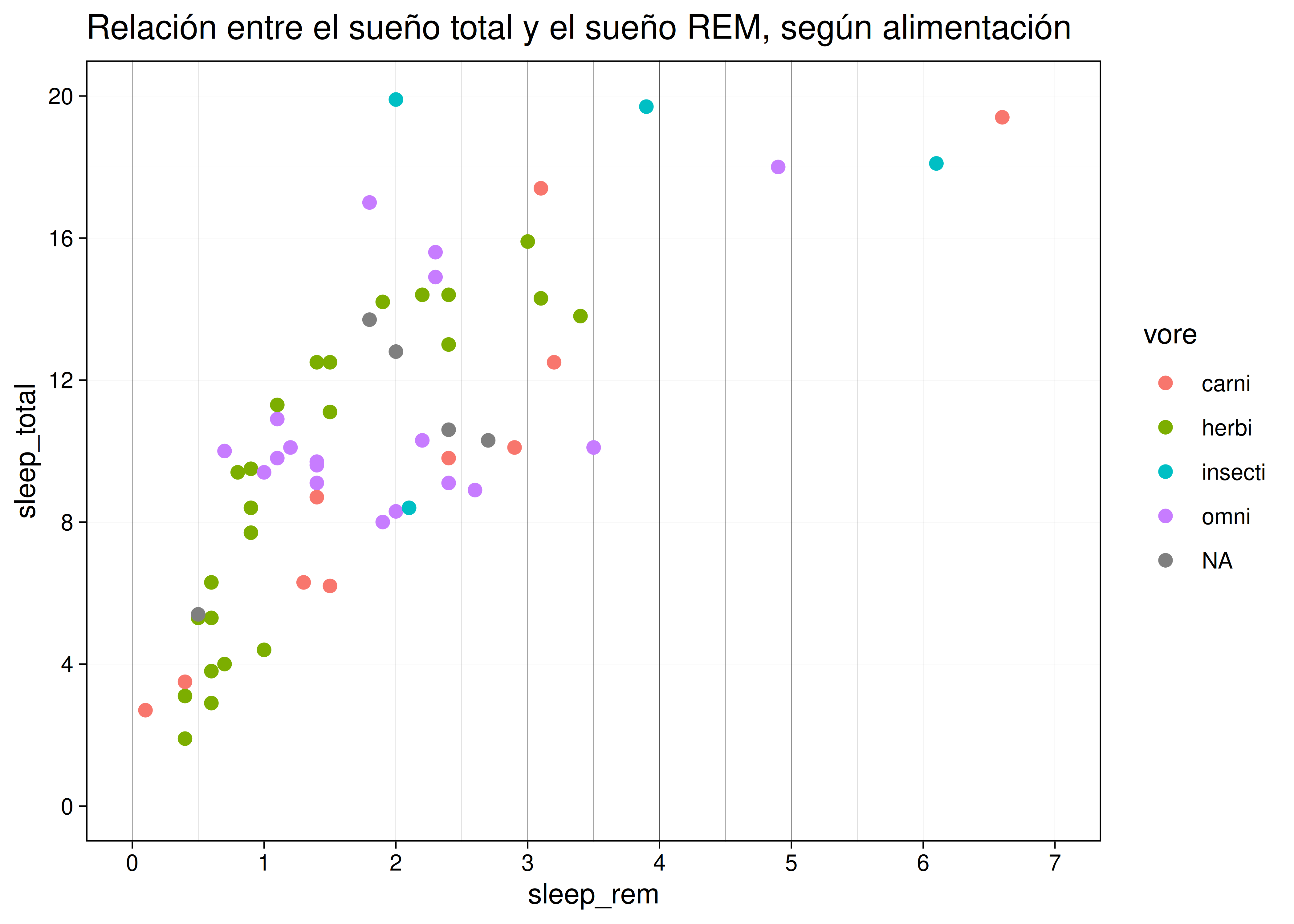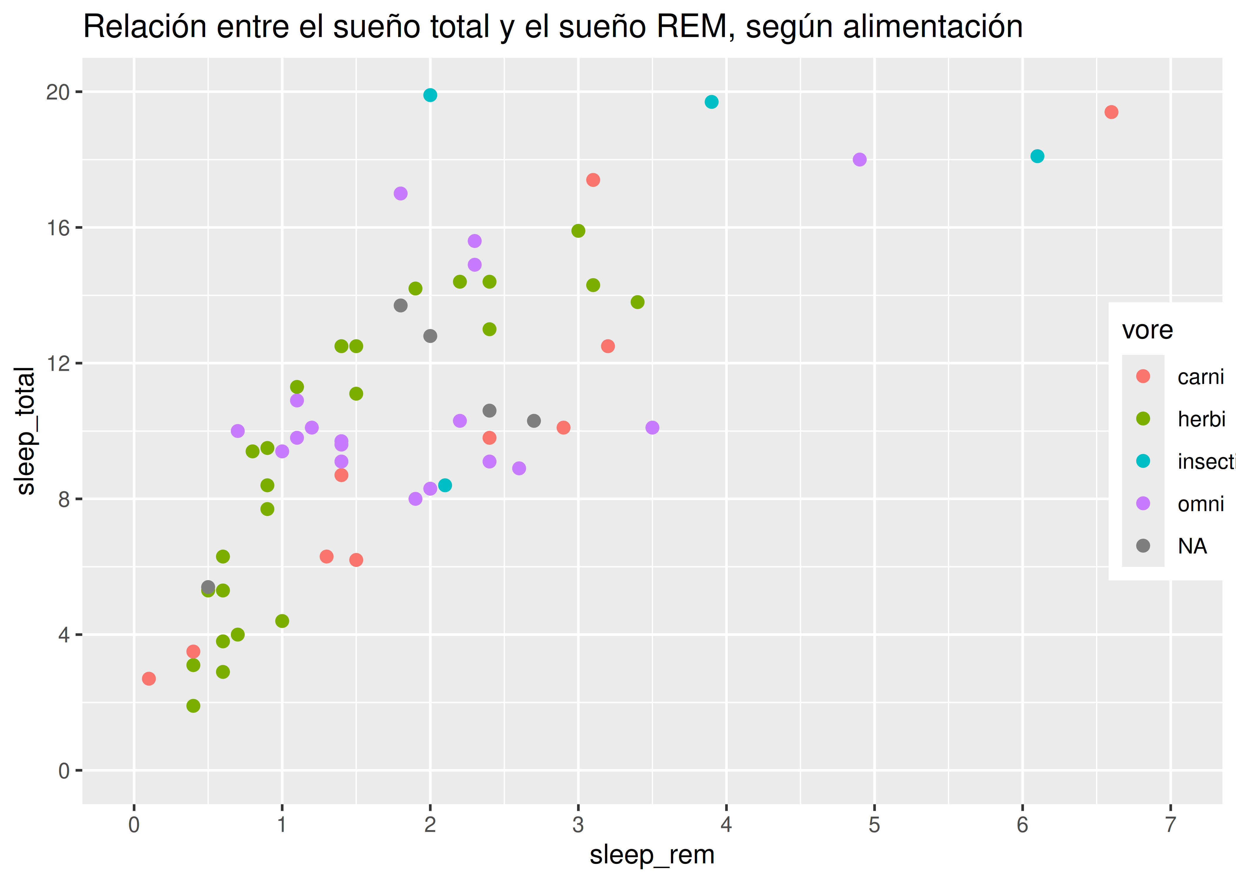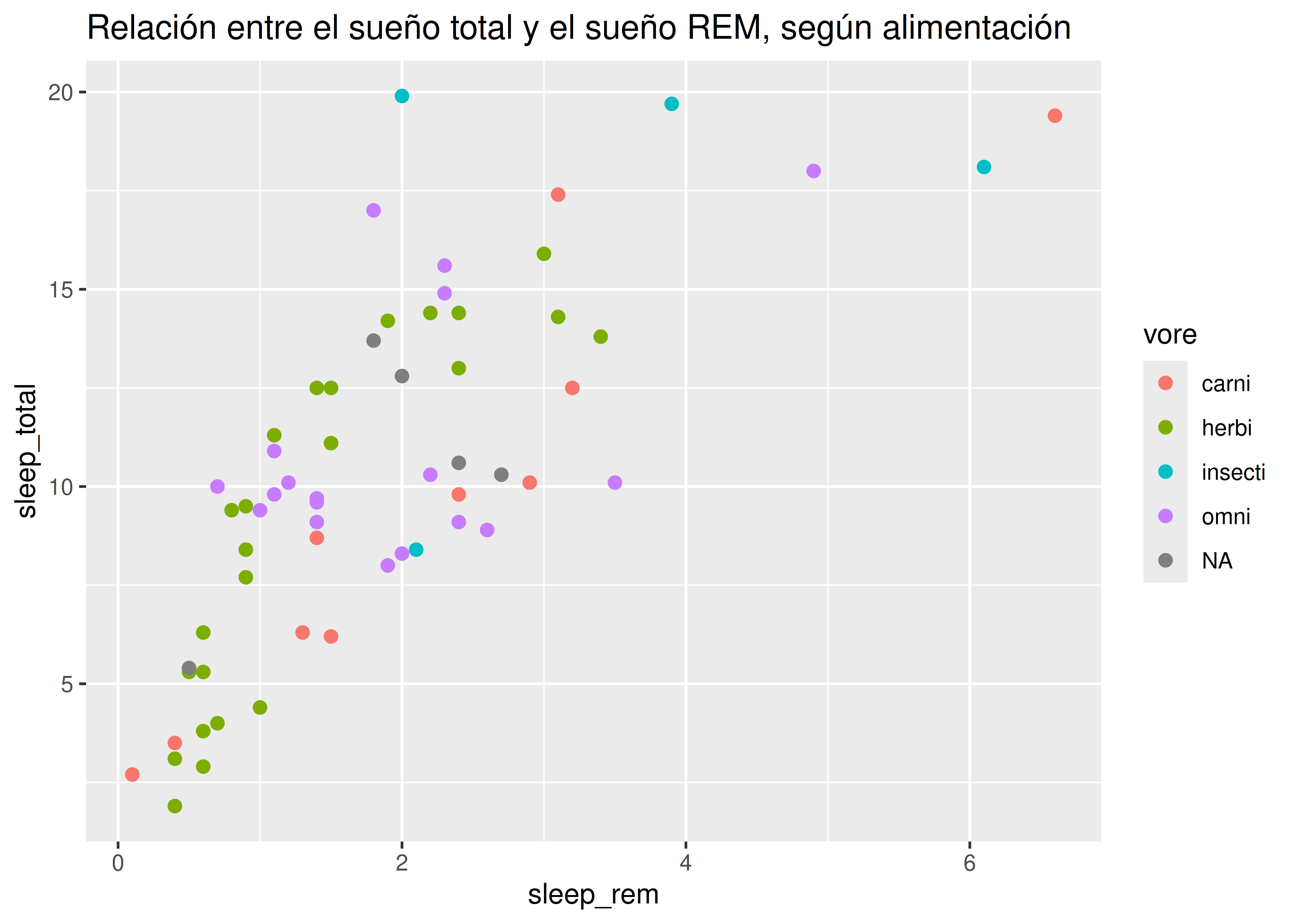 vore(tipo de alimentación: herbívoro, carnívoro, etc.), debemos agregar la opcióncolor = voreen la capa de estéticas.De esta manera asociamos el color de todos nuestros geoms con la variable