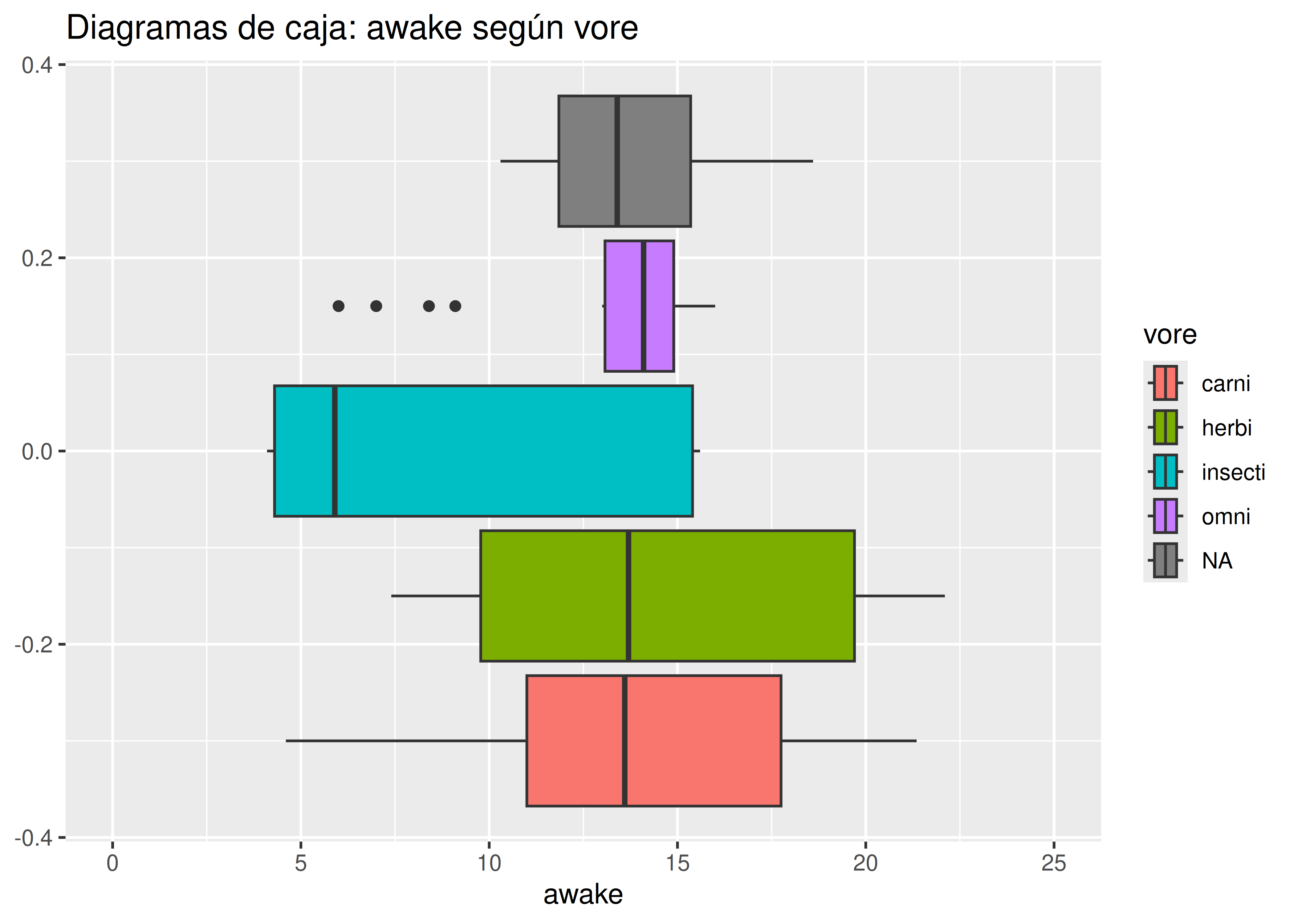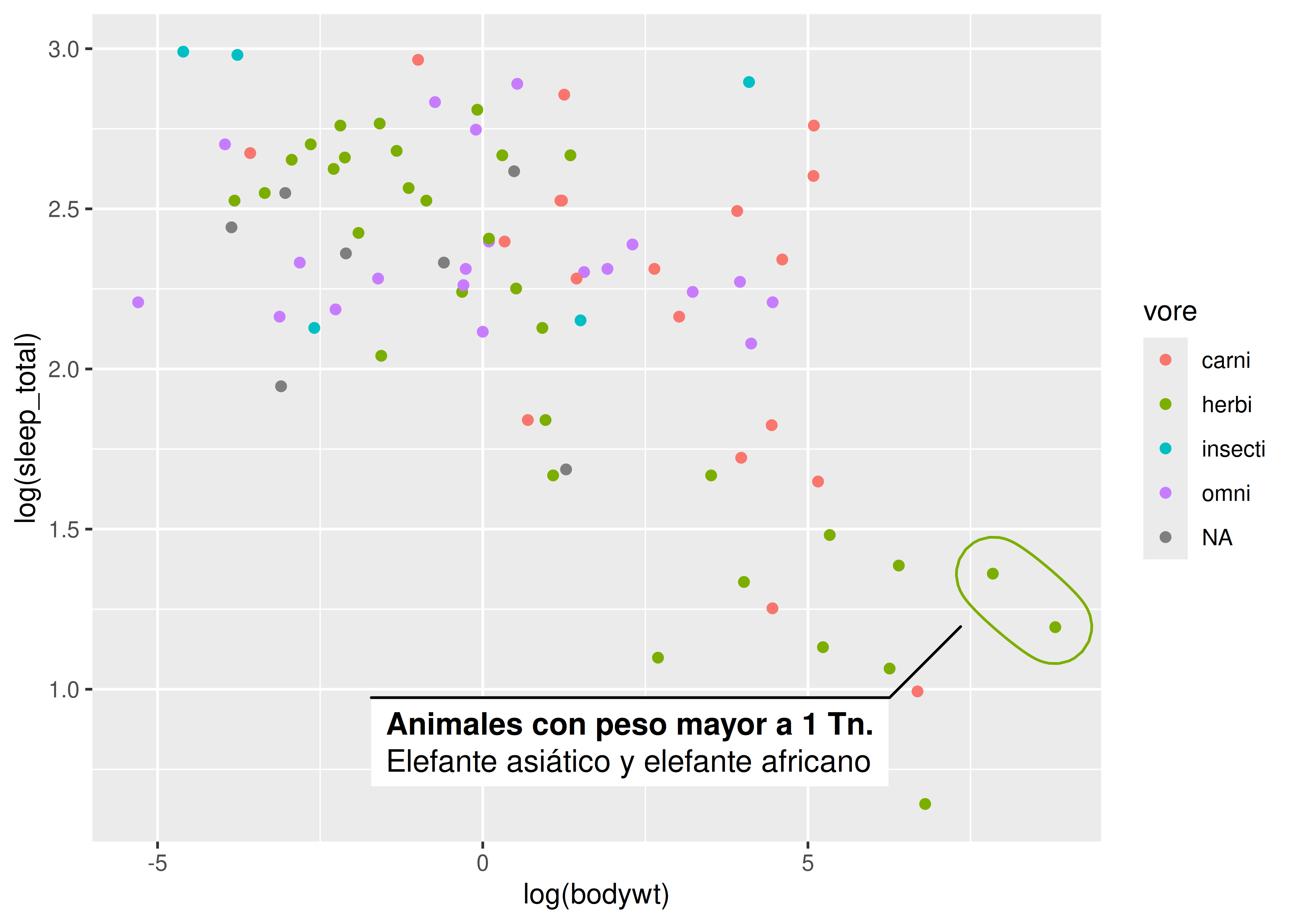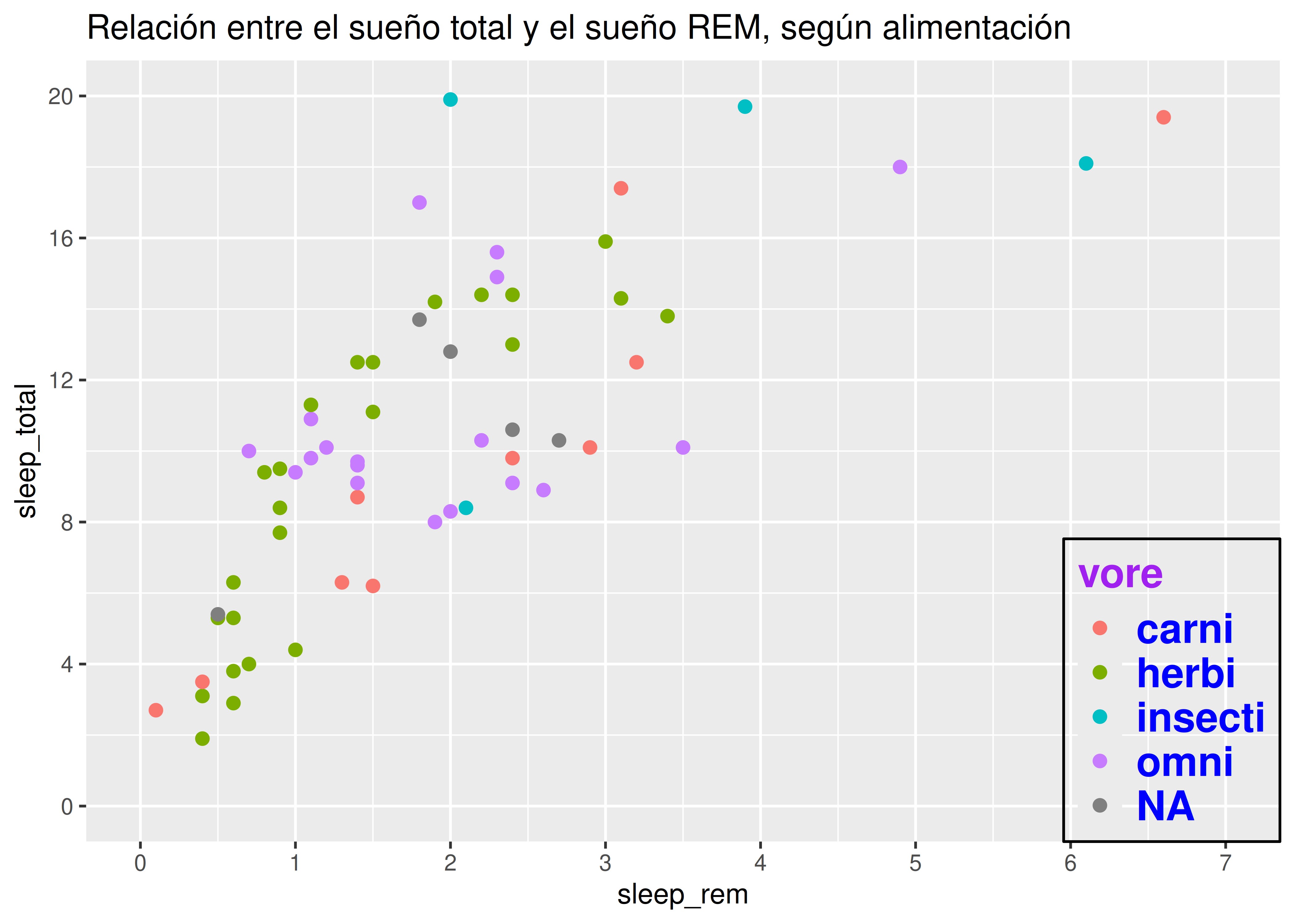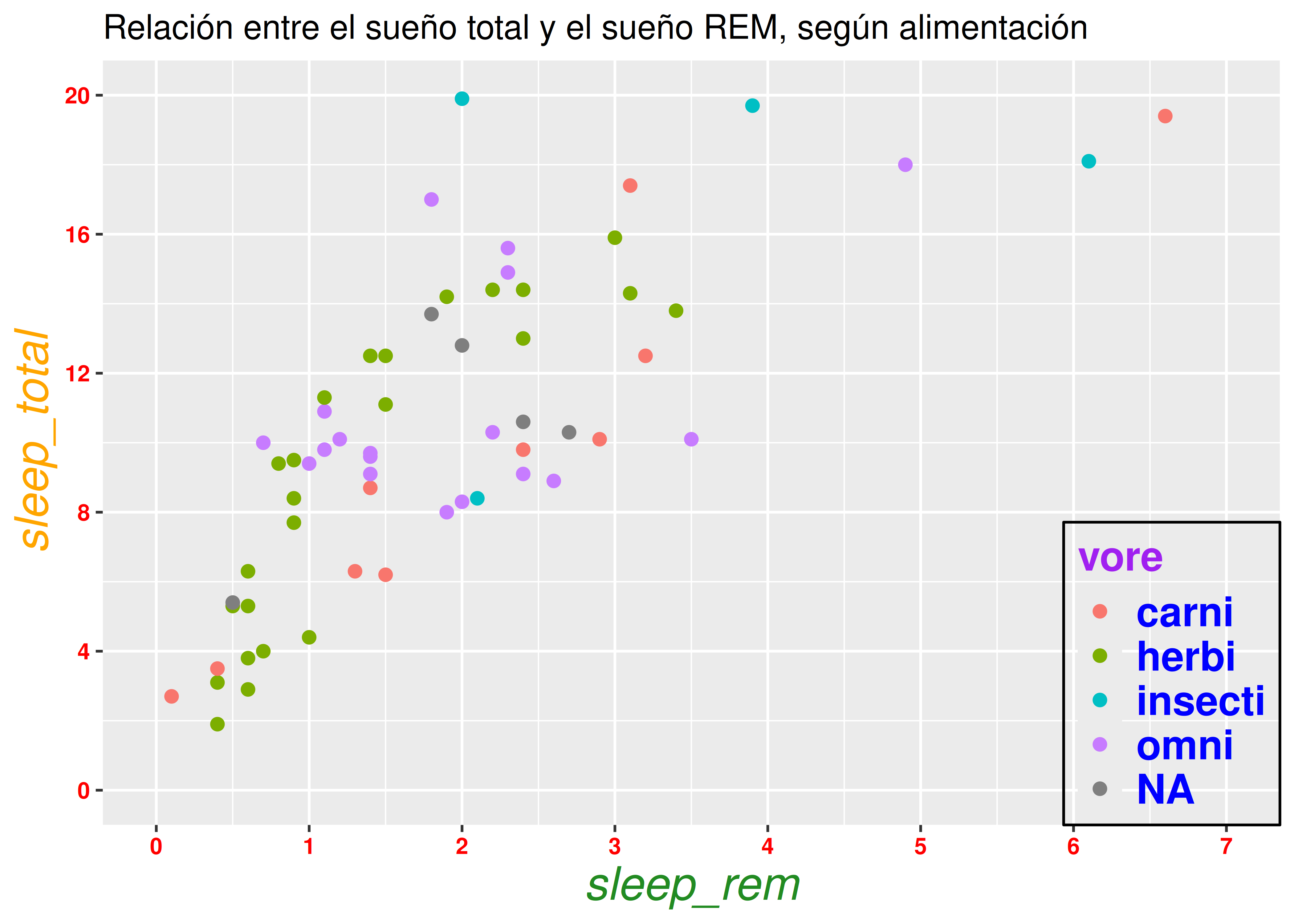 vore(tipo de alimentación: herbívoro, carnívoro, etc.), debemos agregar la opcióncolor = voreen la capa de estéticas.De esta manera asociamos el color de todos nuestros geoms con la variable