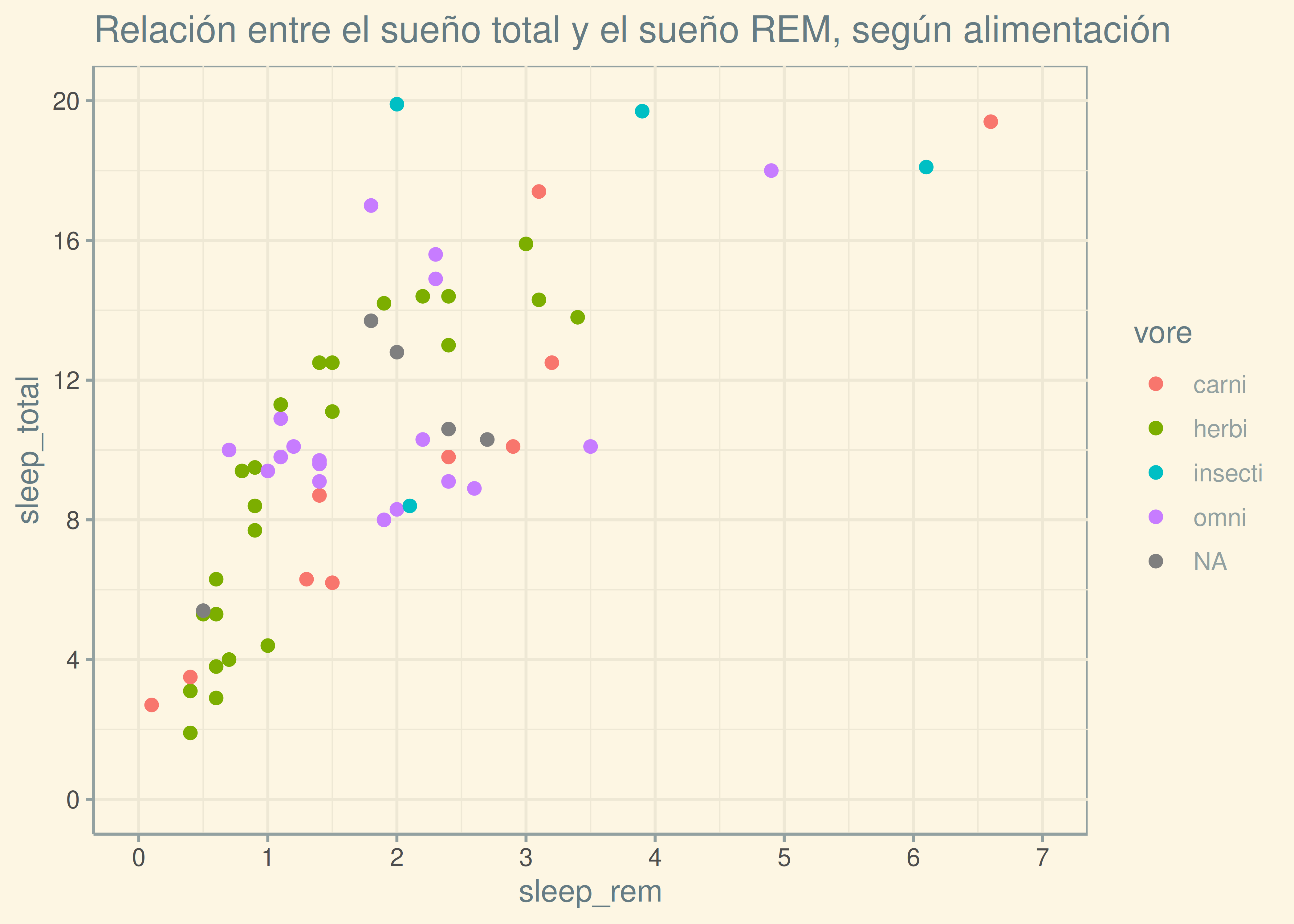 A continuación, construiremos paso a paso un diagrama de dispersión entre las variables cantidad total de horas de sueño (sleep_total) y la cantidad de horas de sueño en la fase REM (sleep_rem), presentes en el dataset sobre patrones de sueño de animales mamíferos.