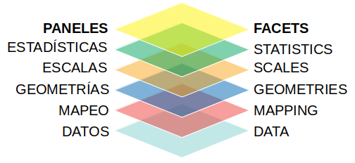 - Paneles (facet): permite dividir el gráfico original en varios paneles distintos, uno para cada grupo posible definido por cierta variable categórica o discreta.