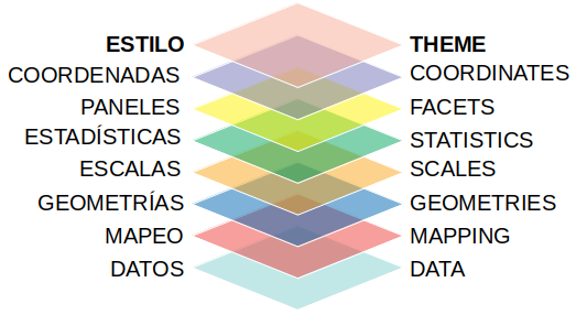 - Estilos (themes): controlan el aspecto general del gráfico en cuestiones que no tienen que ver con los datos, por ejemplo, si queremos el título en negrita o el fondo blanco. Es decir, controla la parte estética (en el sentido usual de la palabra) o lo que se conoce como “tinta libre de datos” (non-data ink).