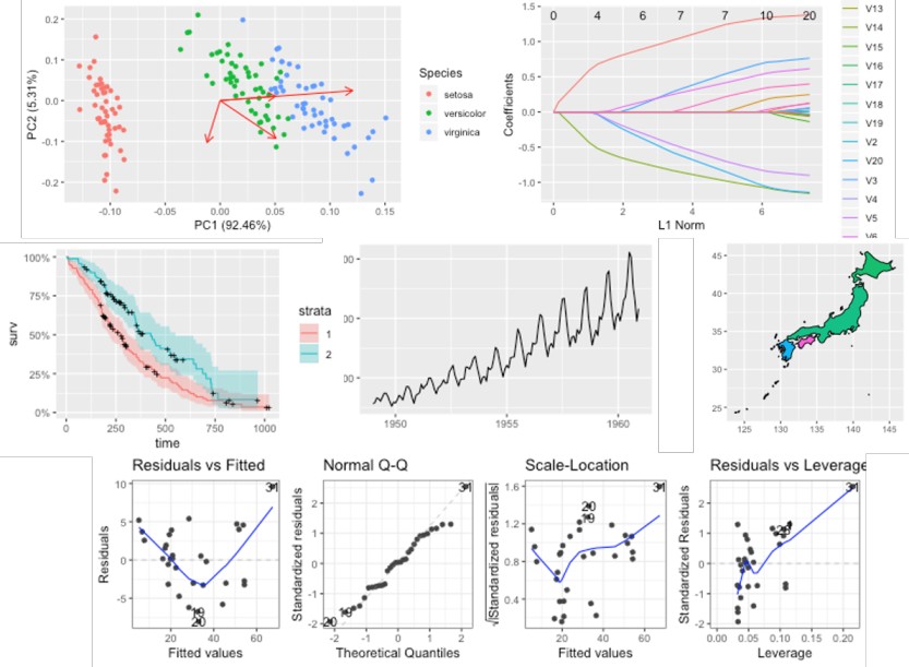 ggplot2para salidas de métodos estadísticos como modelos lineales, curvas de supervivencia, regresiones penalizadas, georreferenciamiento, series de tiempo, componentes principales, clustering, etc.