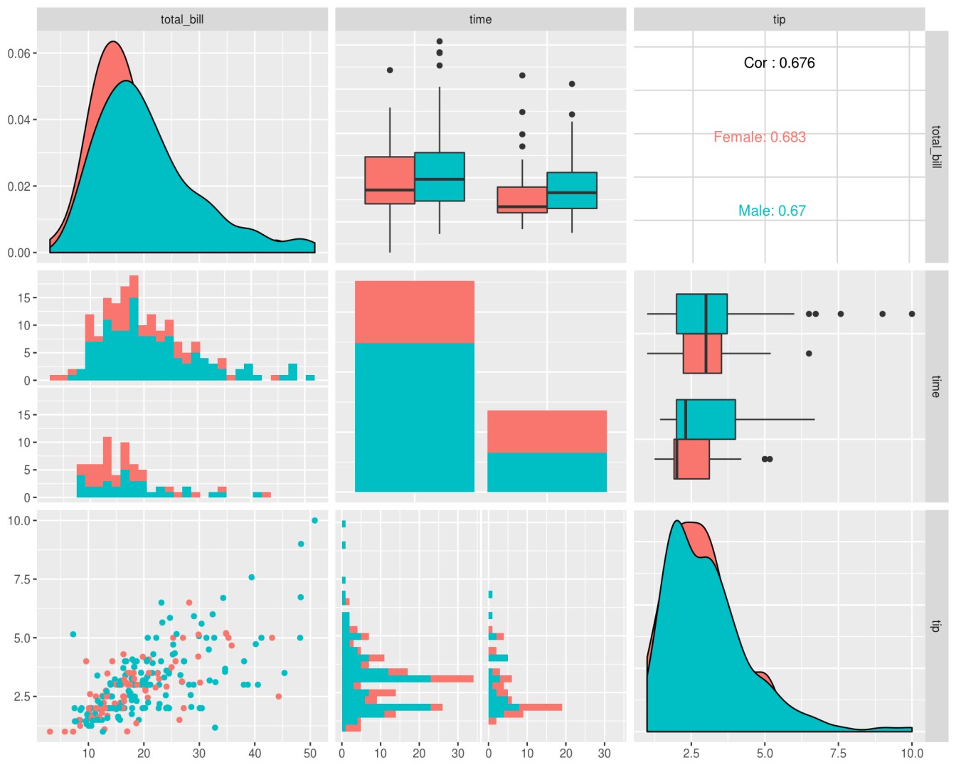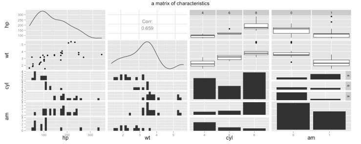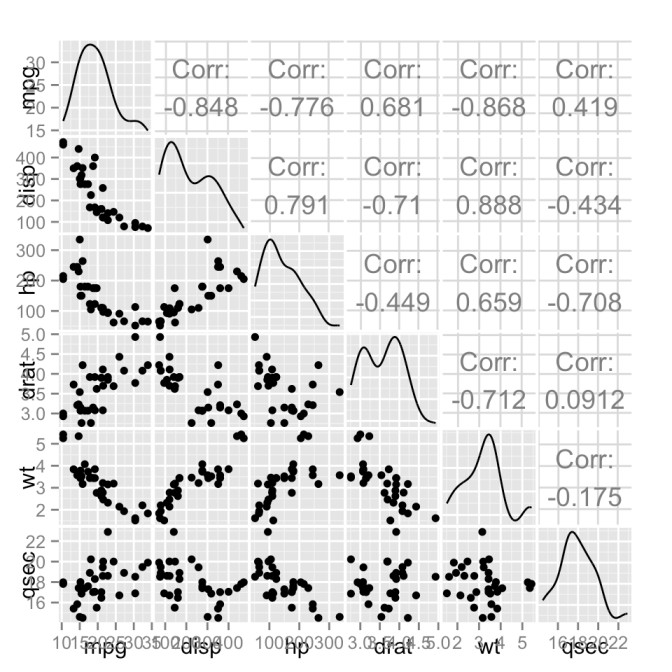 ggpairs()que permite hacer matrices de gráficos para ver la relación de a pares entre conjuntos de variables: