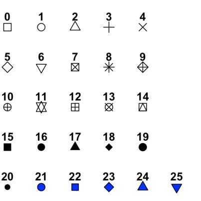 - Veamos un ejemplo donde cambiamos el color, el tamaño, la forma y la transparencia de los puntos: