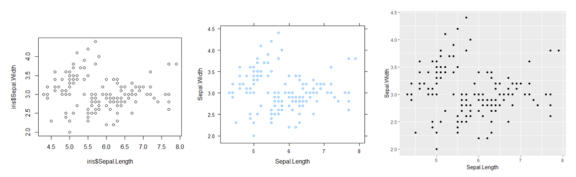 Debajo vemos diagramas de dispersión básicos realizados con los tres sistemas nombrados (de izquierda a derecha: