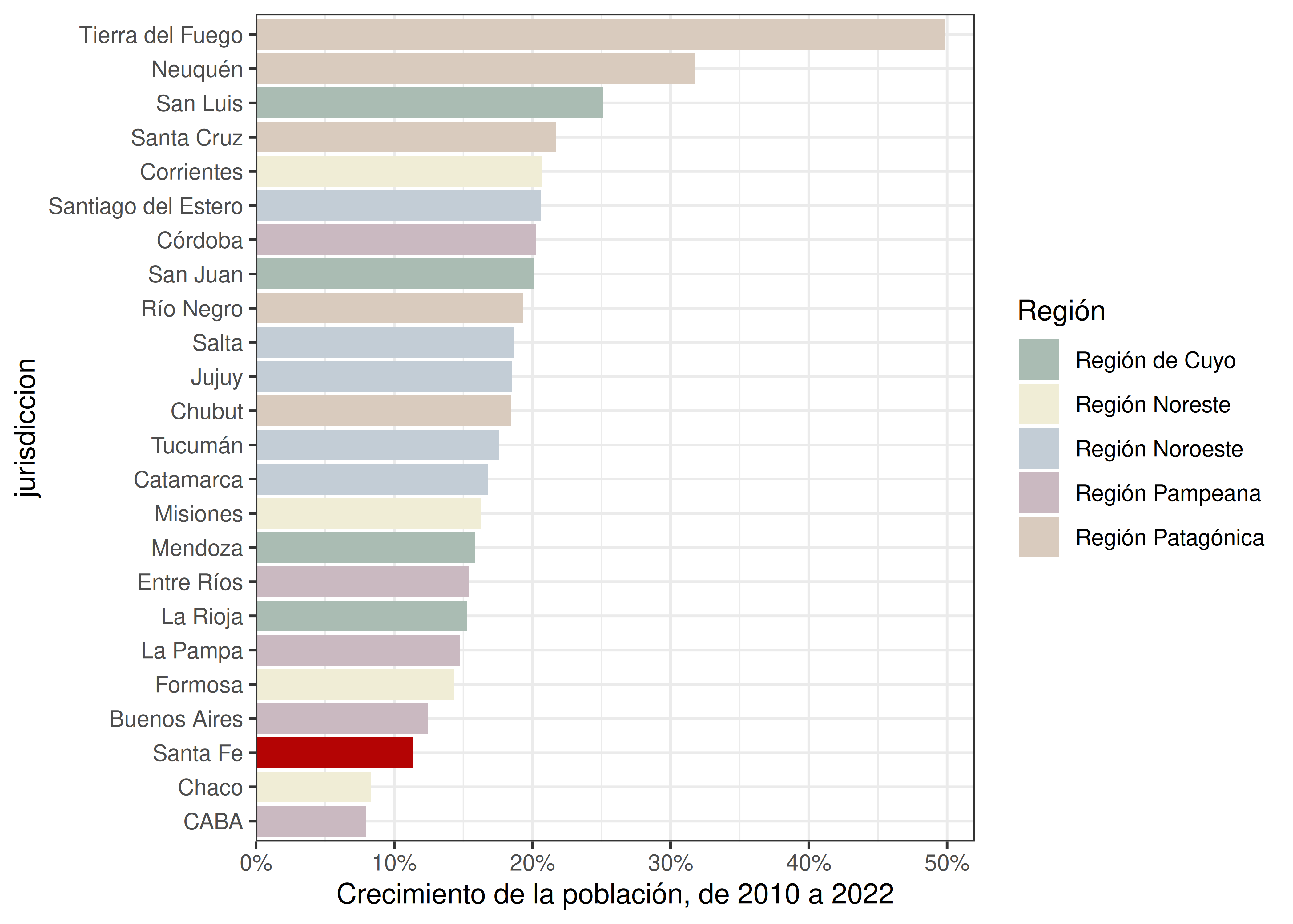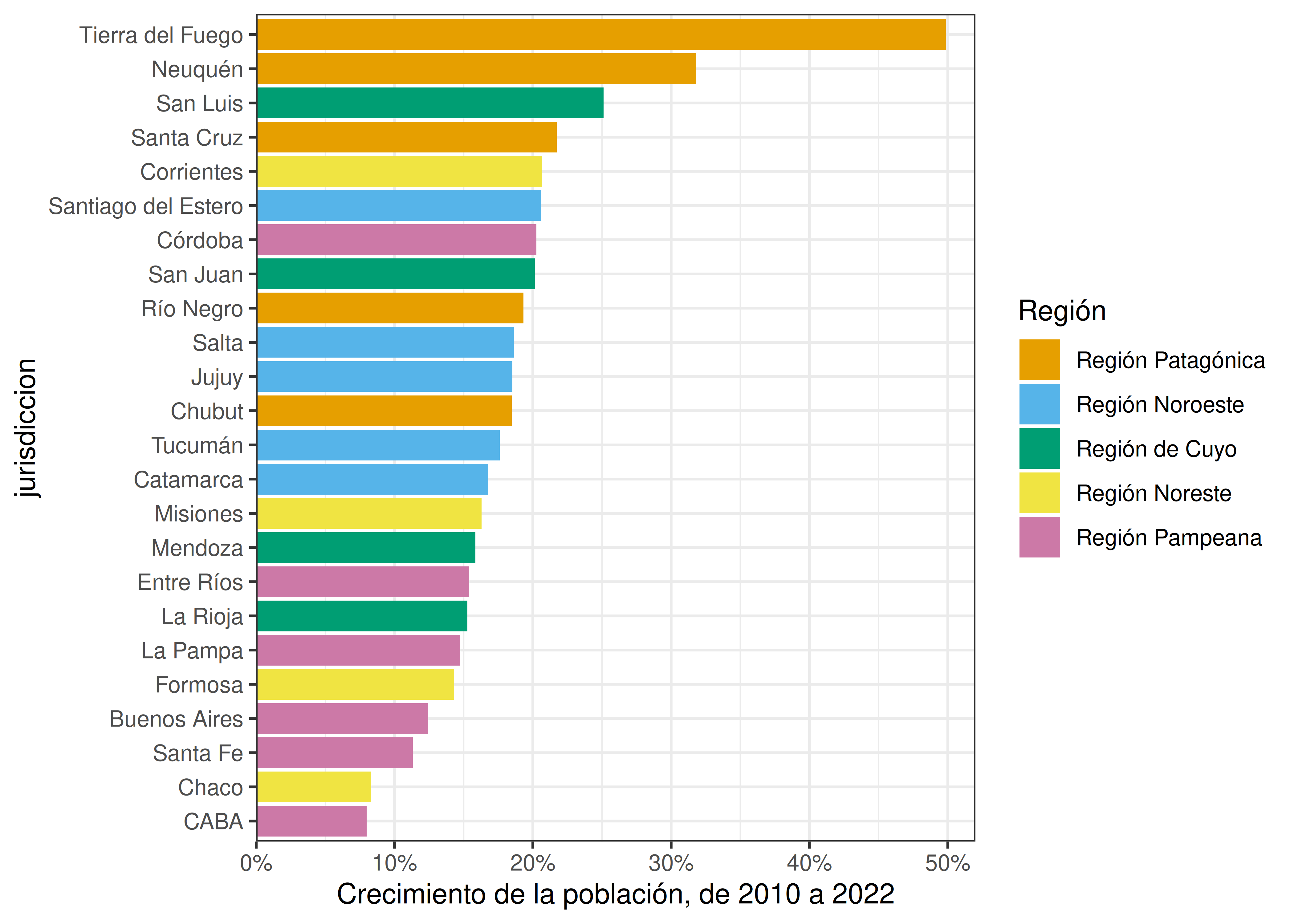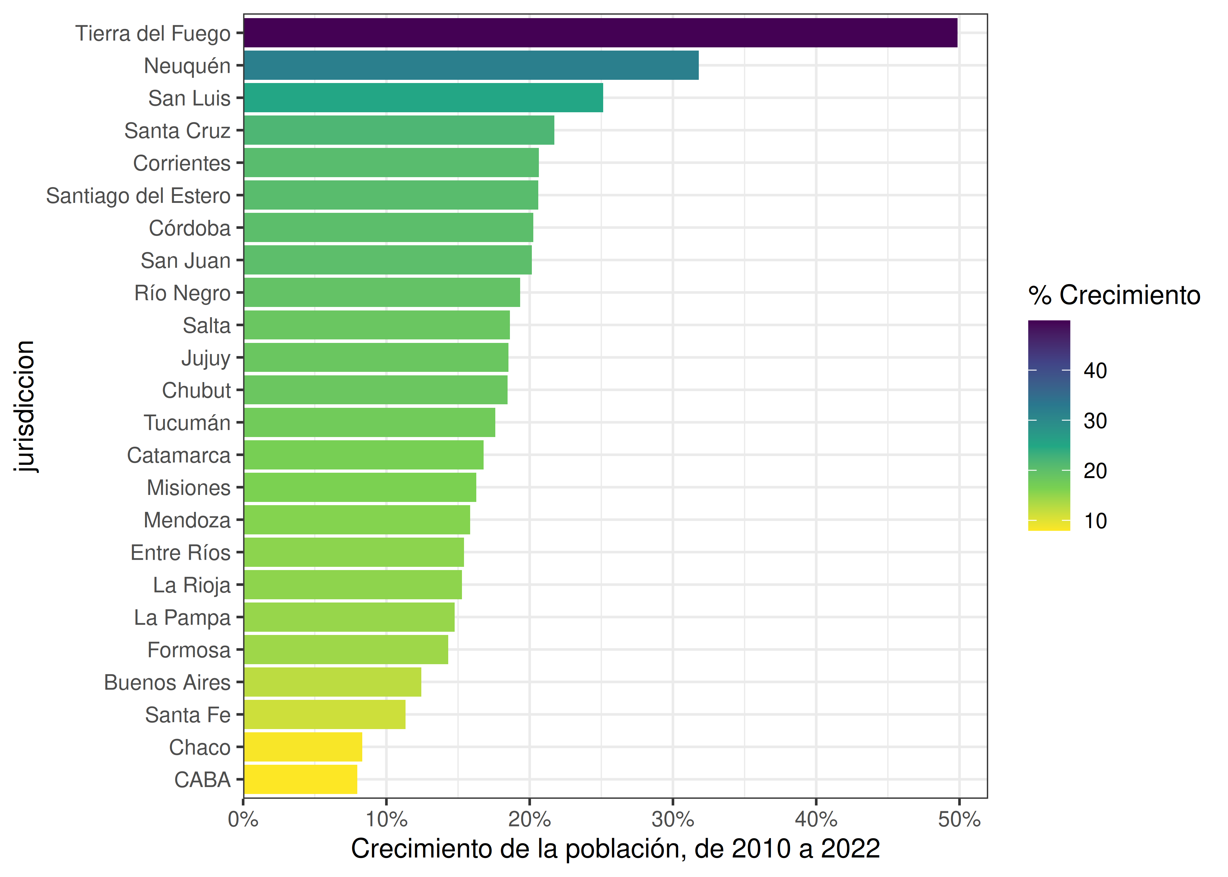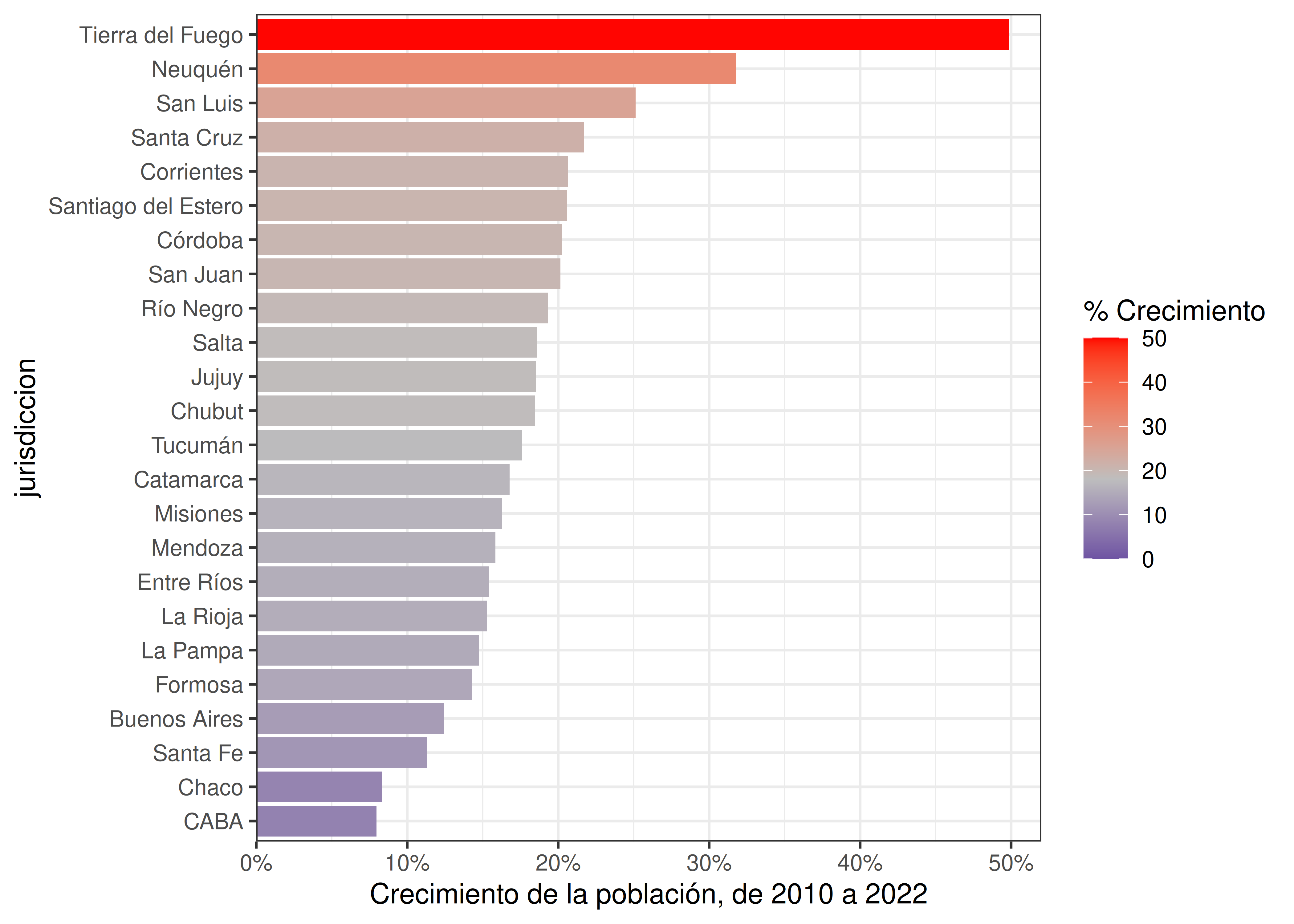 - Las escalas divergentes suelen funcionar mejor cuando los datos son aproximadamente simétricos; en este caso, el punto medio corresponde a 18%, la mediana de los crecimientos observados entre ambos censos para cada jurisdicción. Tierra del Fuego, que podría llegar a considerarse como un outlier (crecimiento de casi 50%), hace que la escala de colores no se visualice en todo su rango.
