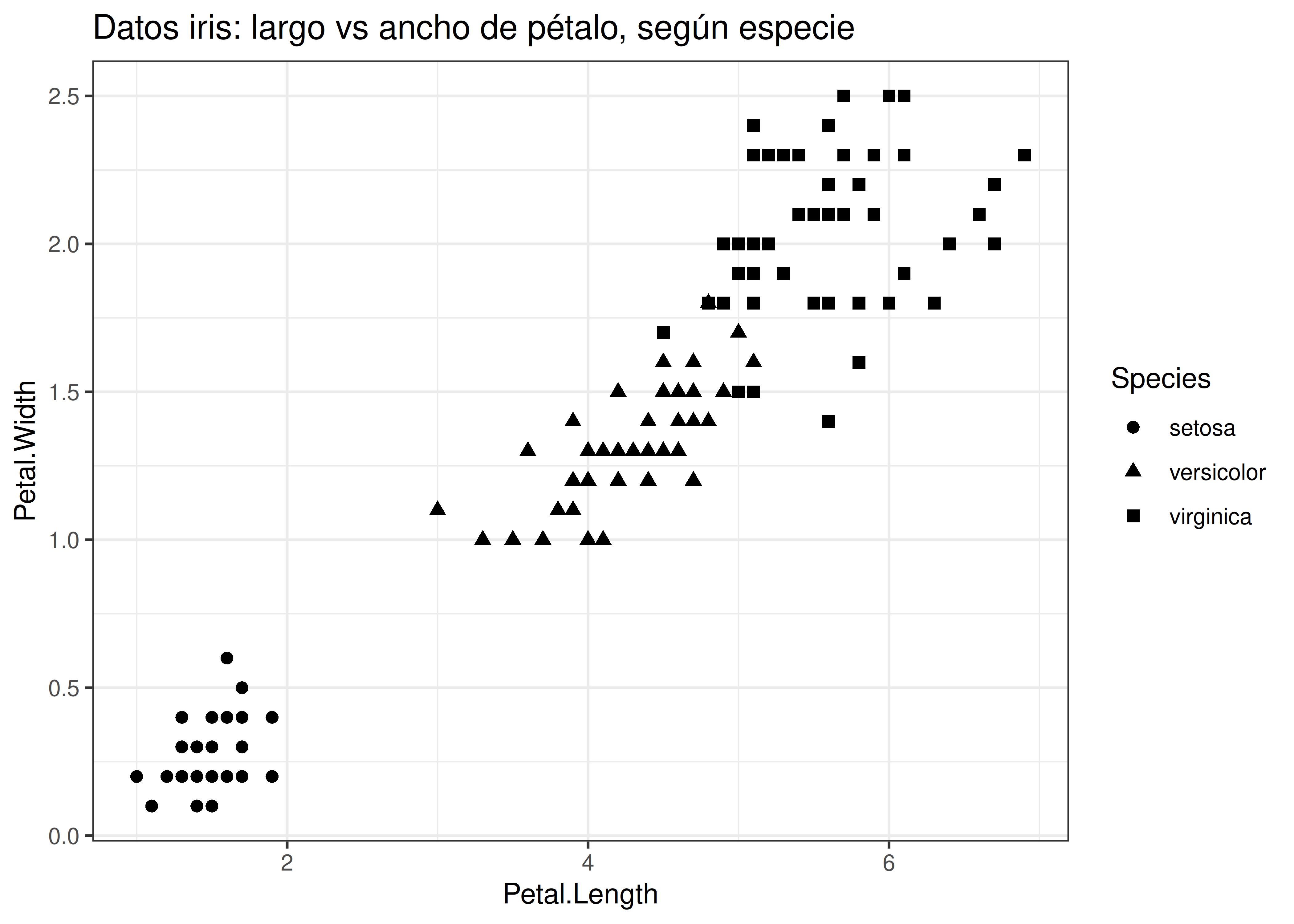 Utilizamos la estética ‘forma’ para representar una variable categórica (especie) que agrega información. Recordemos que la forma sólo puede asociarse a una cantidad finita (discreta) de valores; no tendría sentido asociar el ancho del pétalo con la forma. Notemos además la necesidad de incorporar una leyenda al gráfico que permita relacionar formas con valores puntuales de los datos.
