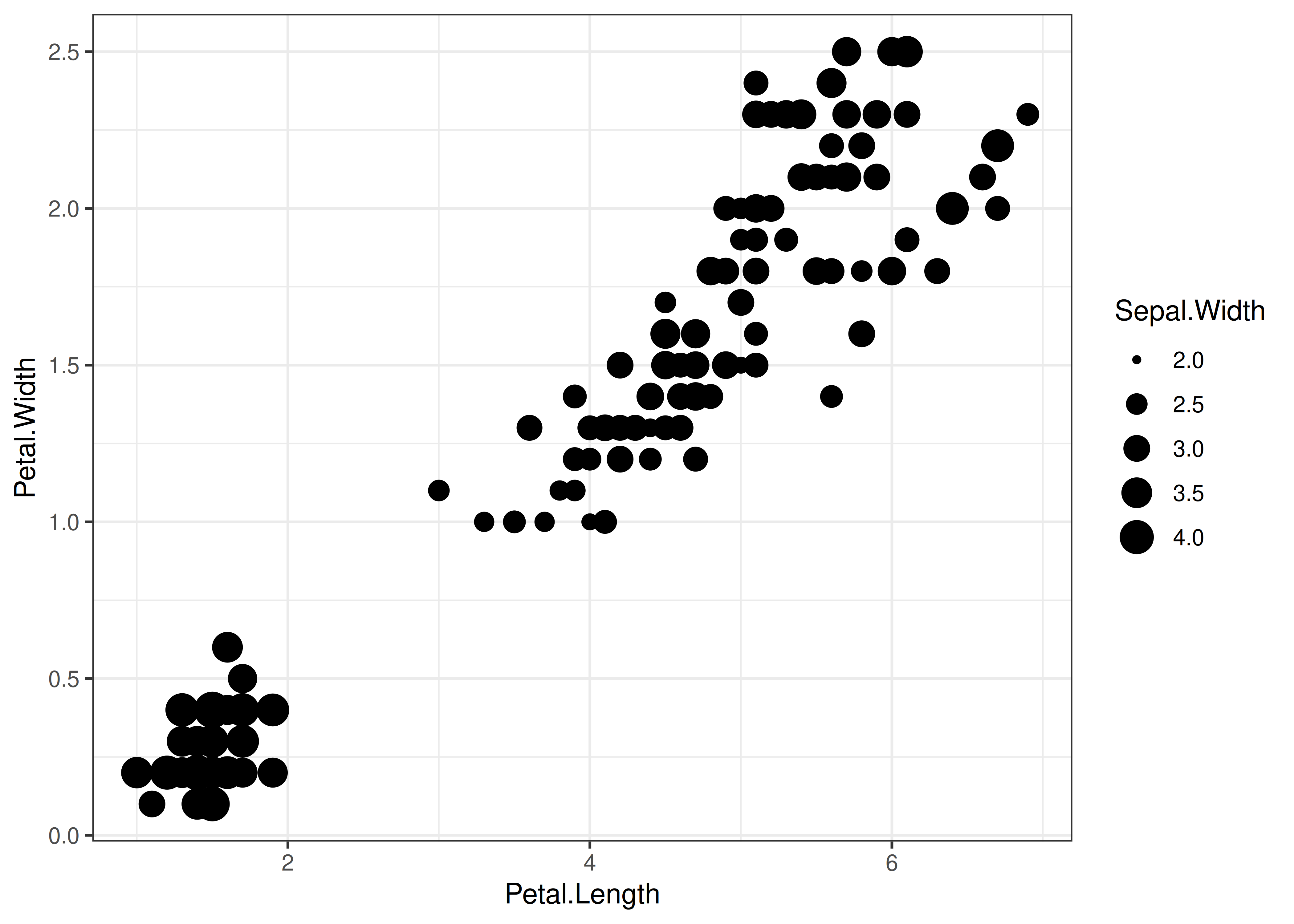 Usamos la estética ‘tamaño’ para representar una tercera variable, en este caso ancho del sépalo. El diámetro de cada punto ahora depende de esta variable: flores con sépalo más anchos se grafican con puntos de mayor diámetro. Una vez más, necesitamos una leyenda adecuada para interpretar el gráfico.