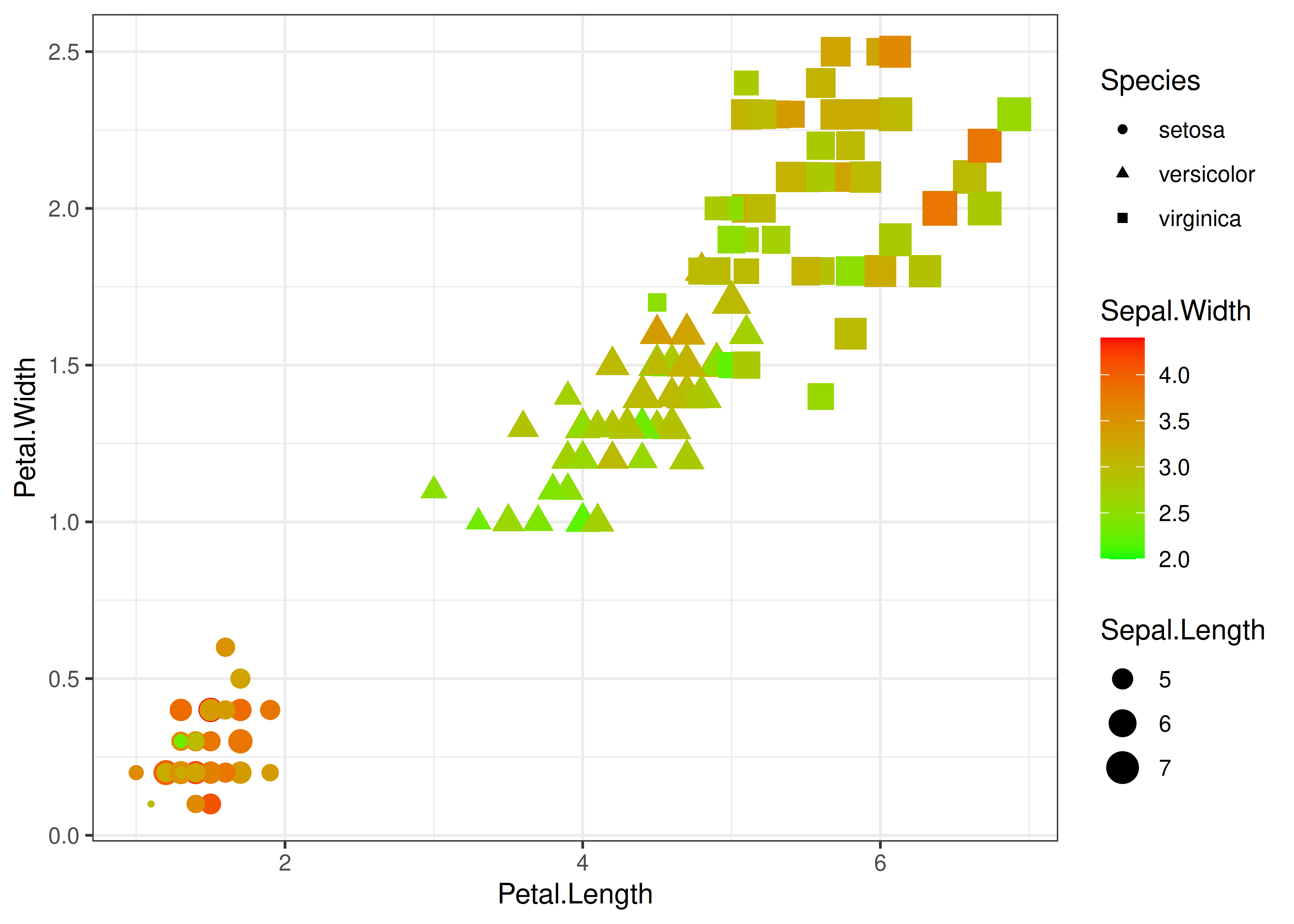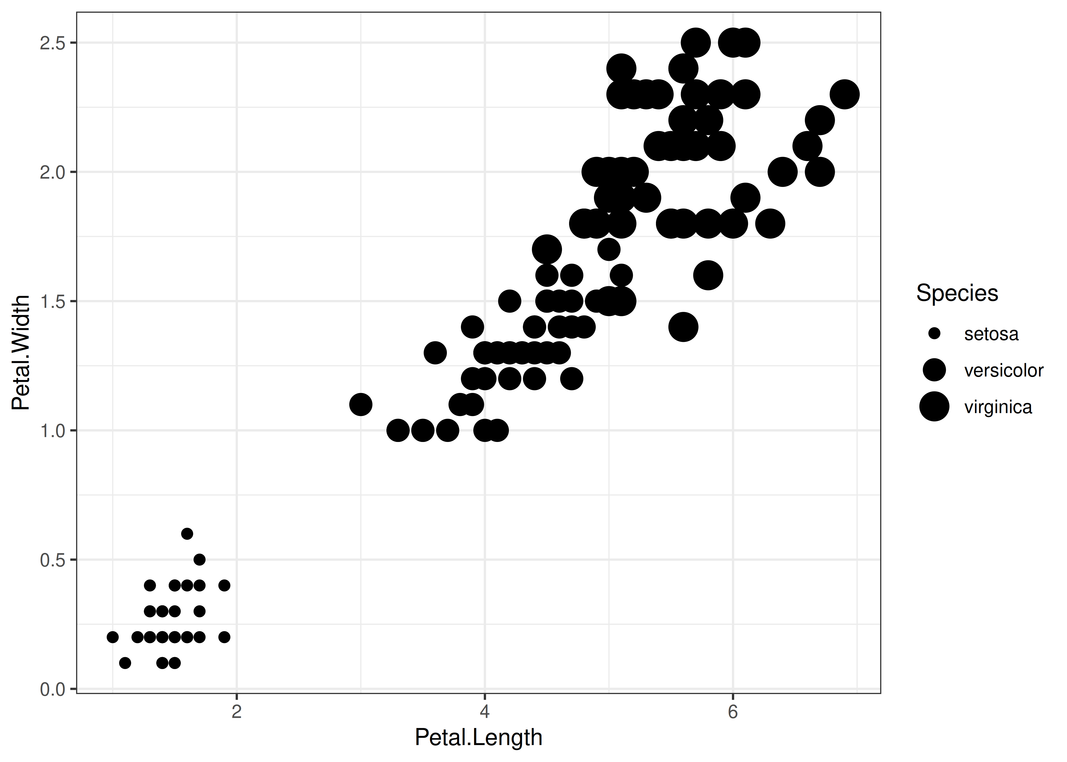 Estéticas que se pueden usar para datos continuos, como el tamaño, también sirven para representar datos discretos. Advertimos que este uso no es recomendable, ya que la diferencia de tamaño entre especies dificulta la correcta interpretación de los datos graficados.