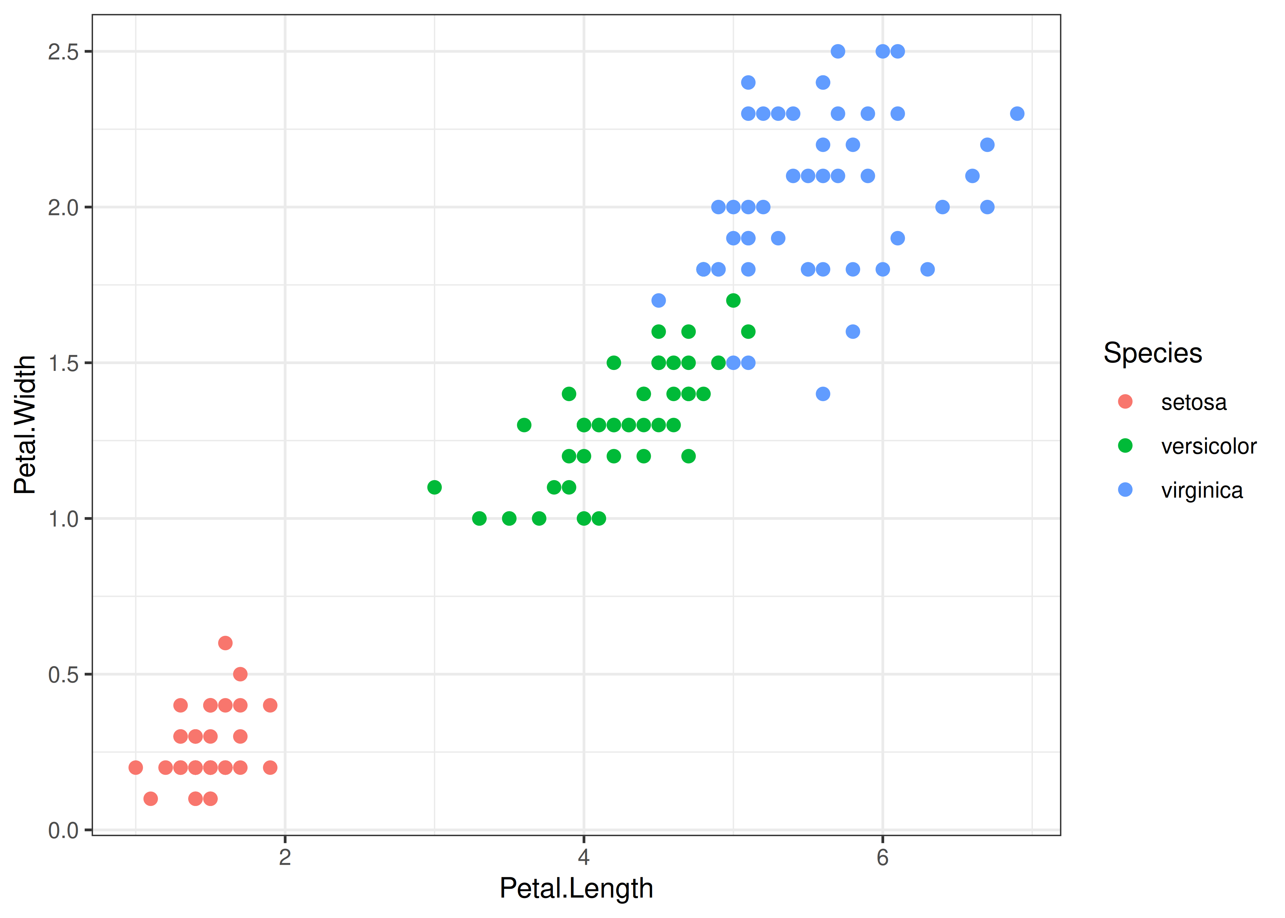 Una manera correcta de diferenciar las especies es asignando una paleta de colores que las distinga (es importante que la elección de colores no opaque el mensaje; hablaremos de esto más adelante). Si bien la estética del ‘color’ fue planteada arriba como continua, también resulta muy útil para representar datos discretos. Este gráfico es una alternativa al ejemplo 2: ambos muestran exactamente la misma información, pero haciendo uso de diferentes estéticas.