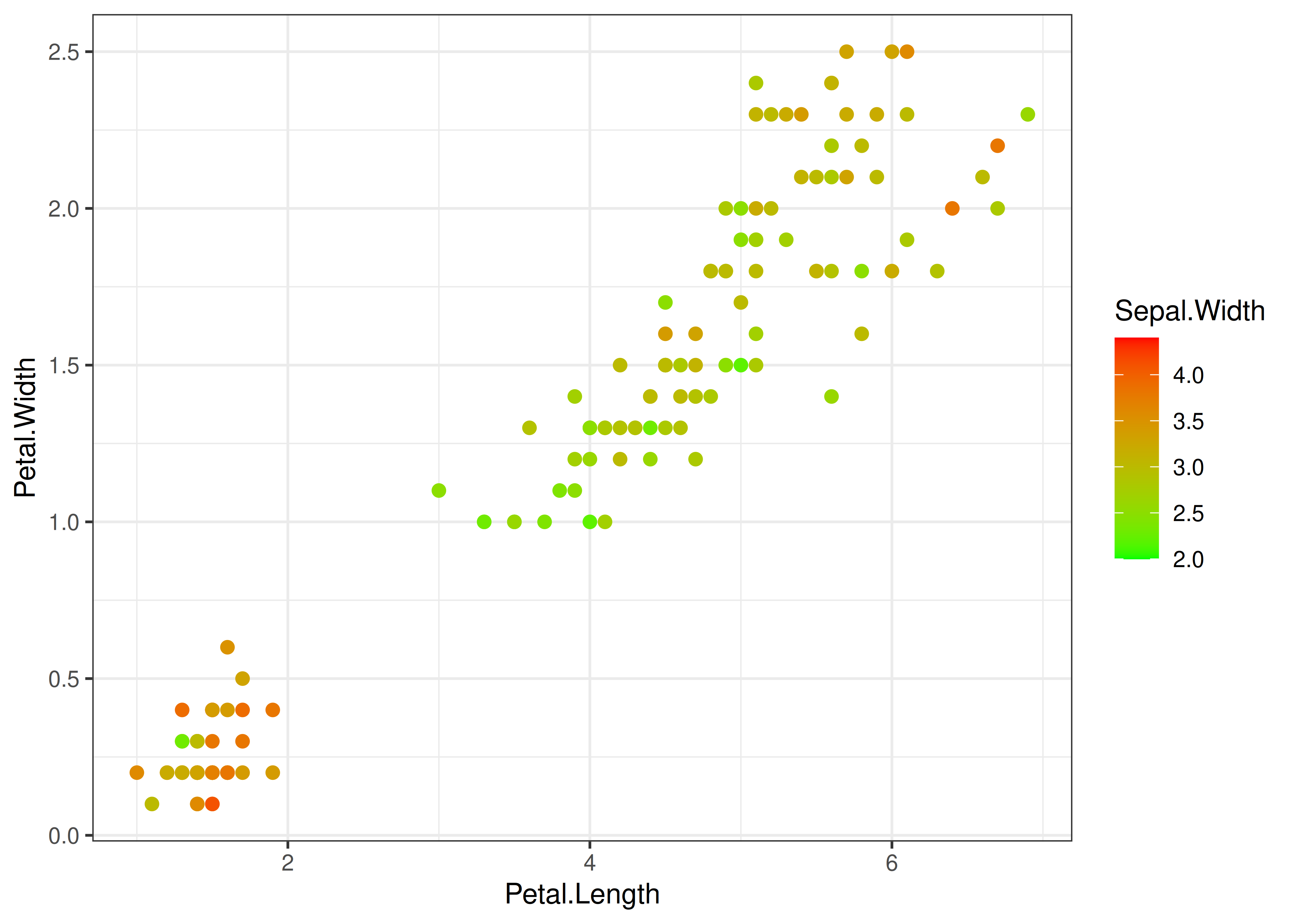 Ahora usamos la estética ‘color’ para representar datos continuos, en este caso nuevamente el ancho del sépalo. Acá también debemos prestar especial atención a la paleta elegida para que el mensaje sea lo más claro posible. Este gráfico es una versión alternativa al del ejemplo 3: muestra la misma información pero con estéticas distintas.