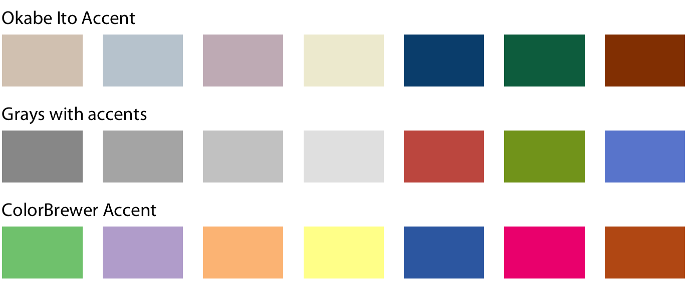 Fila 1: la paleta de colores de Okabe-Ito fue propuesta en 2008 como una alternativa accesible a personas con deficiencia de la visión del color. Incluye colores vivos que se pueden nombrar fácilmente y que corresponden a los principales colores primarios y secundarios.