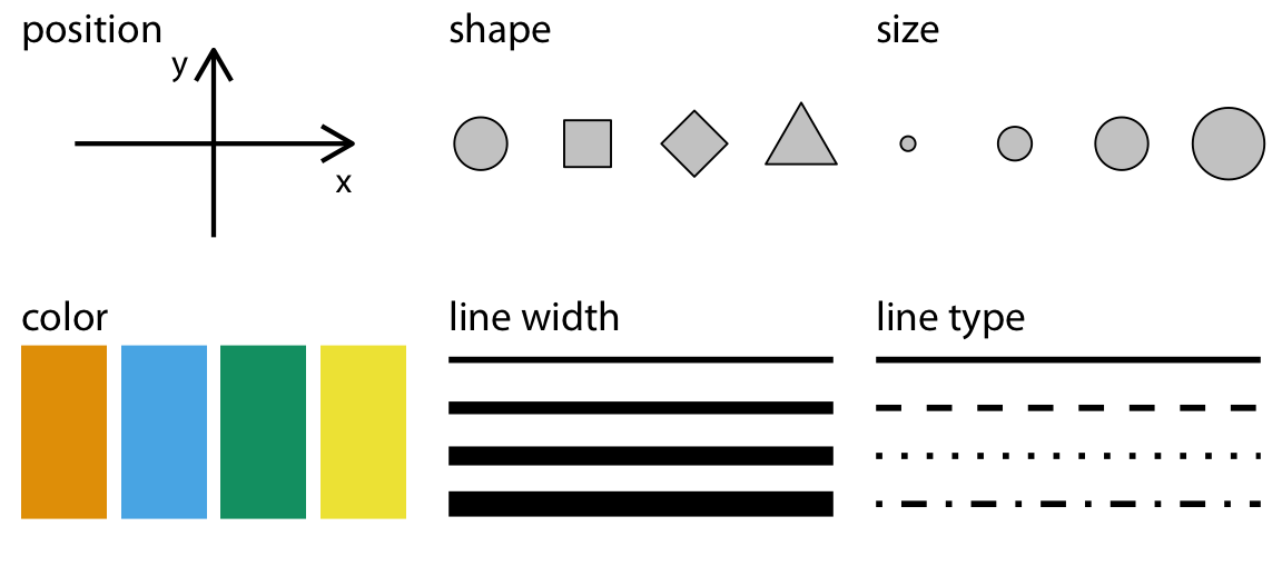 - Posición (position): generalmente como coordenadas cartesianas \((x, y)\) en gráficos en 2D, aunque existen otras posibilidades (coordenadas polares, gráficos tridimensionales, etc.)
