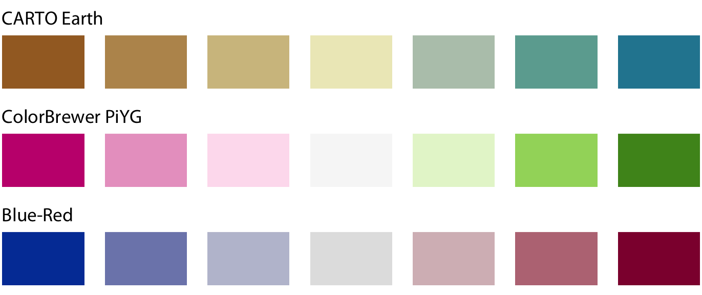 Es necesario equilibrar las escalas divergentes, de modo que la progresión de los colores claros en el centro a los colores oscuros en el exterior sea aproximadamente la misma en cualquier dirección (sería engañoso representar un valor de magnitud \(x\) con un color mucho más claro u oscuro que el utilizado para representar un valor de magnitud \(-x\)).