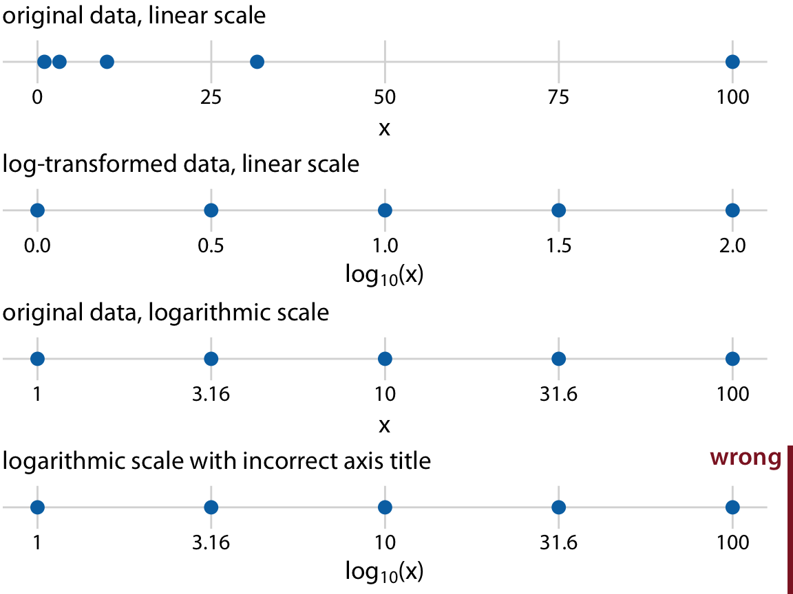 Generalmente es preferible etiquetar la escala logarítmica con los valores originales (tercer panel en la figura), porque es más fácil interpretar los números que se muestran. Además, nunca debemos olvidarnos de aclarar la base utilizada en el cálculo de los logaritmos.